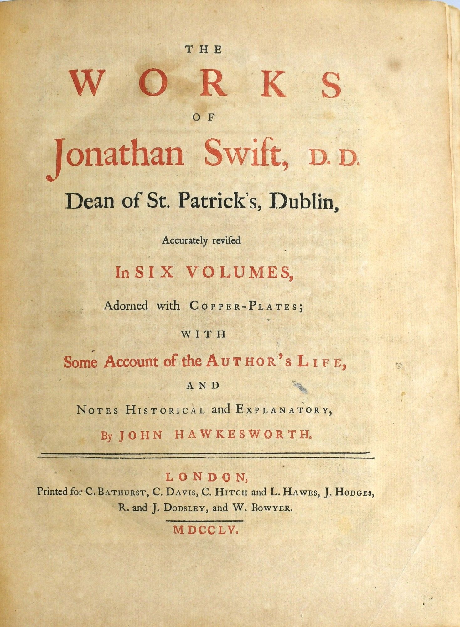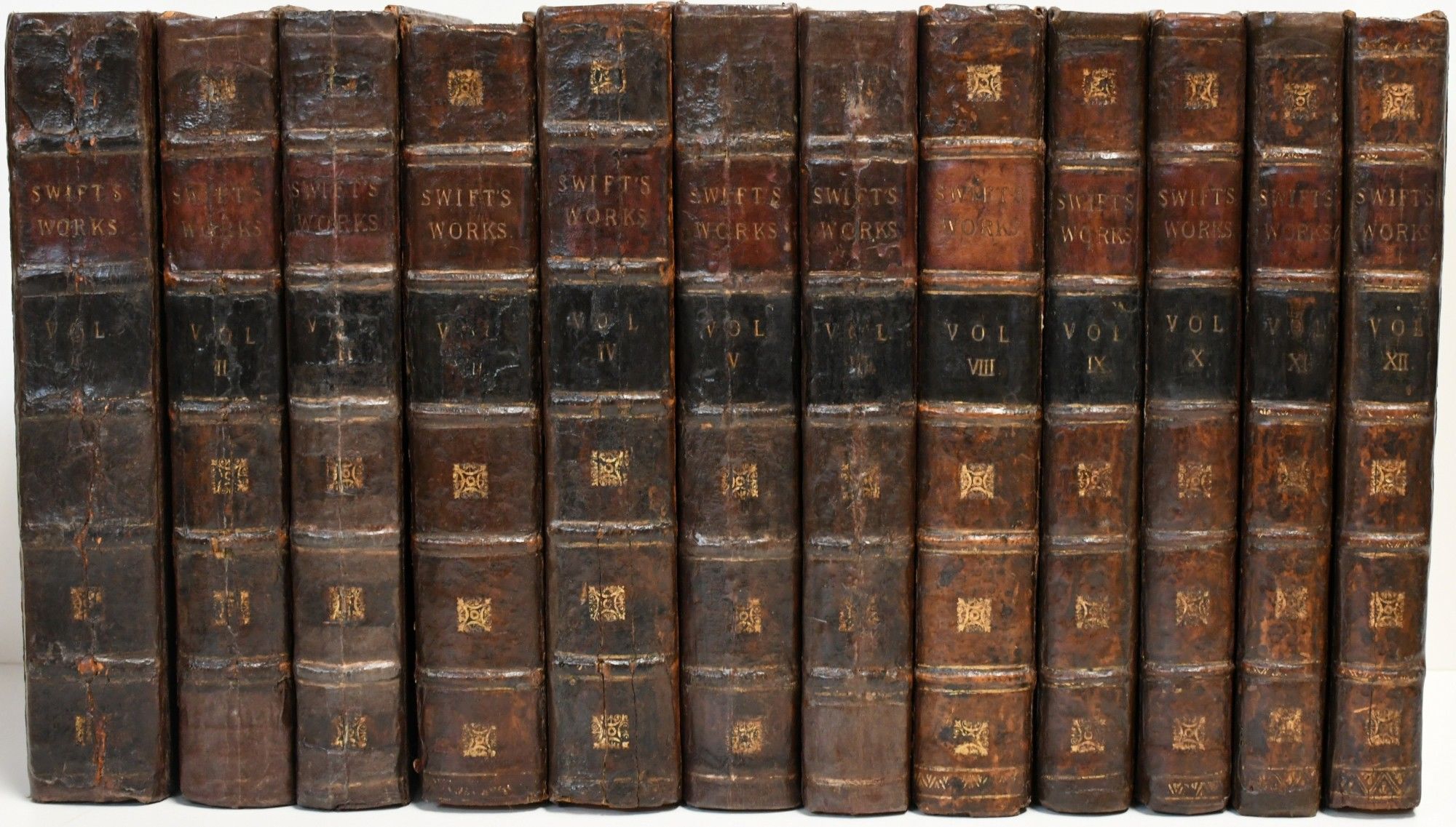 12 Volumes] THE WORKS OF JONATHAN SWIFT, D.D. DEAN OF ST. PATRICK'S, DUBLIN, ACCURATELY REVISED IN SIX VOLUMES. ADORNED WITH COPPER PLATES; WITH SOME ACCOUNT OF THE AUTHOR'S LIFE, AND NOTES HISTORICAL AND EXPLANATORY BY JOHN HAWKESWORTH [8 Volumes, with] LETTERS, WRITTEN BY THE LATE JONATHAN SWIFT... FROM THE YEAR 1703 TO 1740 [4 Volumes]