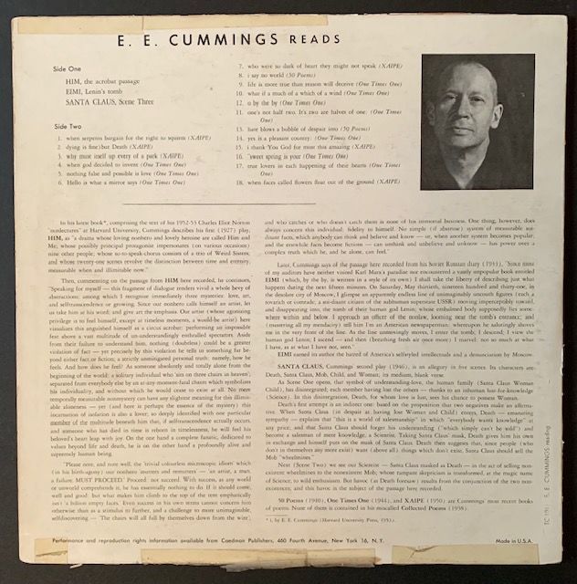 New York: Caedmon Publishers, 1953. Record. Near Fine. The 1953 1st pressing of this Caedmon LP record by poet EE Cummings. WARMLY INSCRIBED BY CUMMINGS ON THE FRONT SLEEVE TO HIS CLOSE FRIEND RICHARD HOFFMANN, who had emigrated to The States from Vienna and had become a fixture in the Cambridge (MA) intellectual scene and, as a leading dermatologist, had treated Cummings and other well-known literary figures. The 33 1/3 LP record has held up beautifully (clean and Near Fine) and the sleeve is crisp and bright, with just a bit of clear tape discreetly reinforcing the edges. The record, formally, is called: "E.E. Cummings reading Poems from ONE TIMES ONE -- EIMI -- XAIPE and others / Scenes from HIM and SANTA CLAUS". (Caedmon TC 1017). Very uncommon as such.