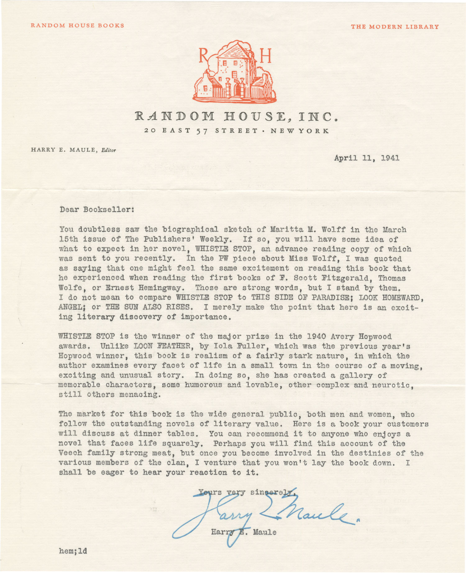 Accompanying the Advance Copy is a typed letter signed on Random House letterhead, from editor Harry E. Maule, introducing the book, in the original mailing envelope.