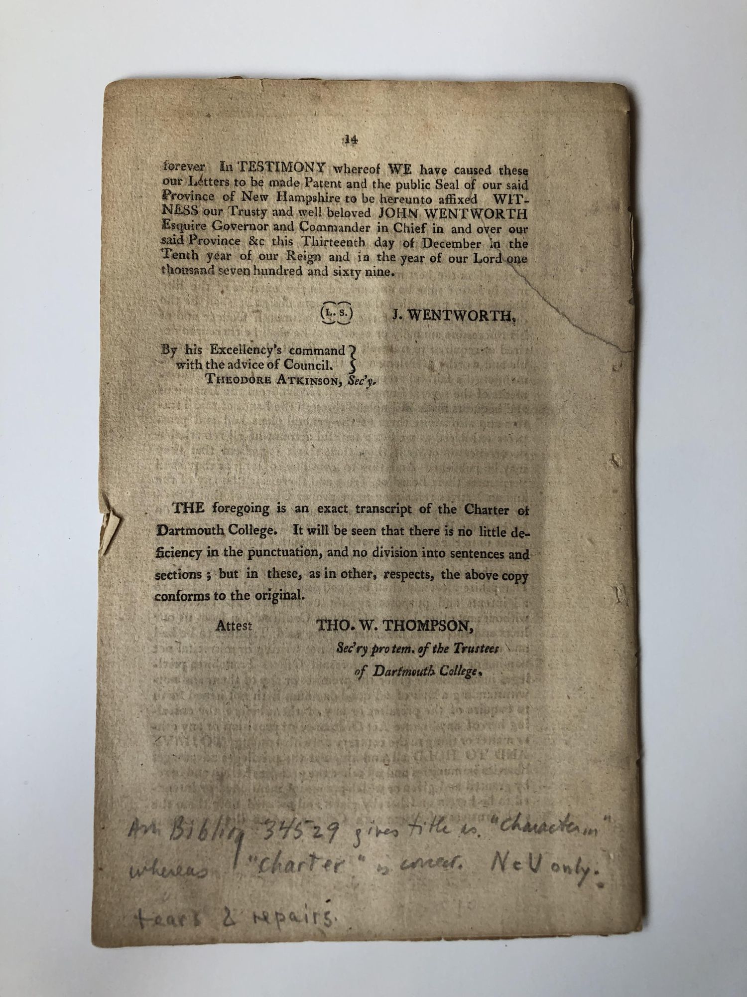 Hanover, NH: Charles Spear, 1815. First Edition. Softcover. Octavo, 14 pages; G; disbound pamphlet; some shelf wear and soiling; protected in a mylar sleeve; modern pencil notes at back page; paper repairs throughout, including extensive Japanese tissue repair to page 5; minimal text loss; RW consignment. 1356683. Special Collections.