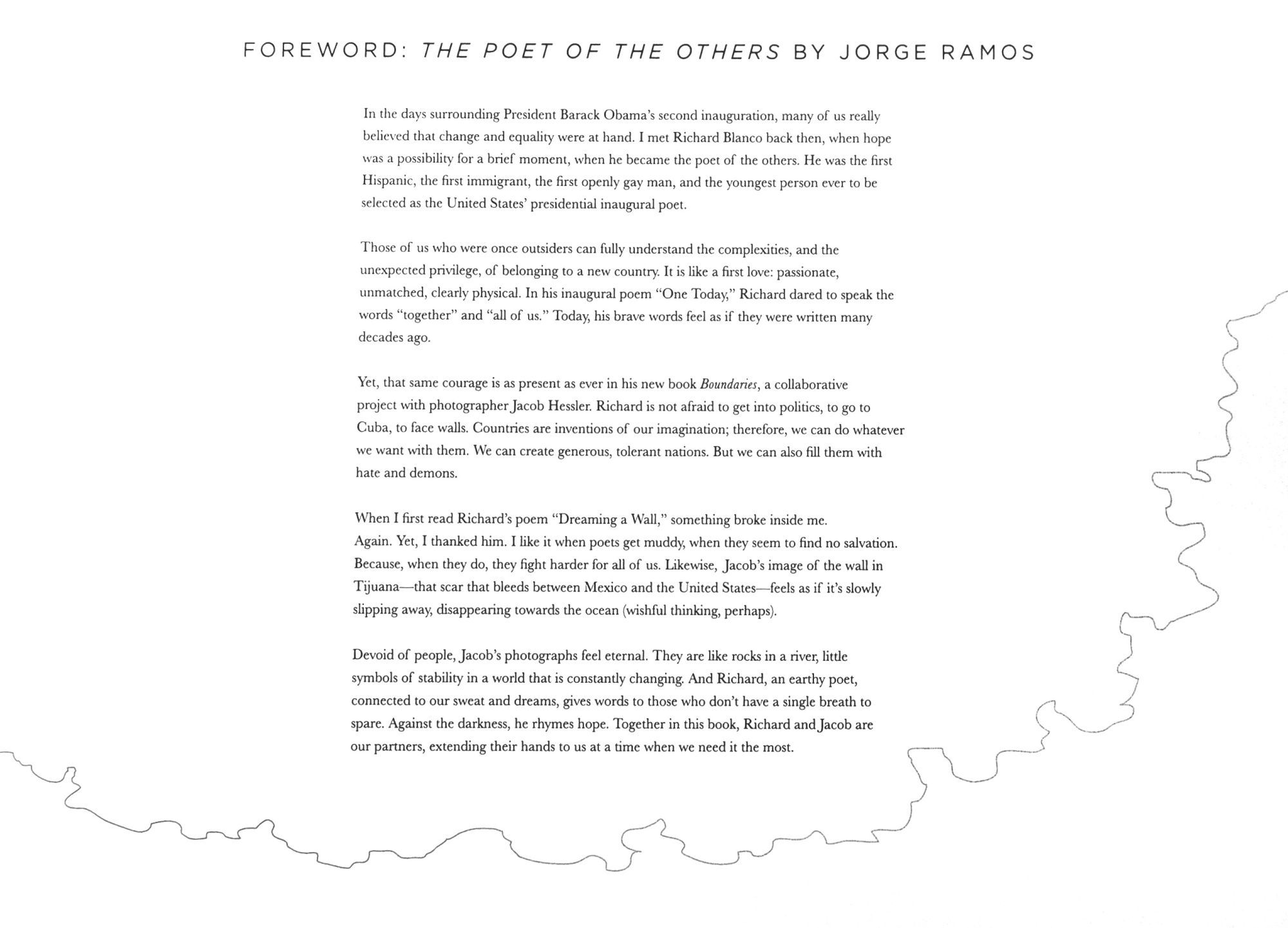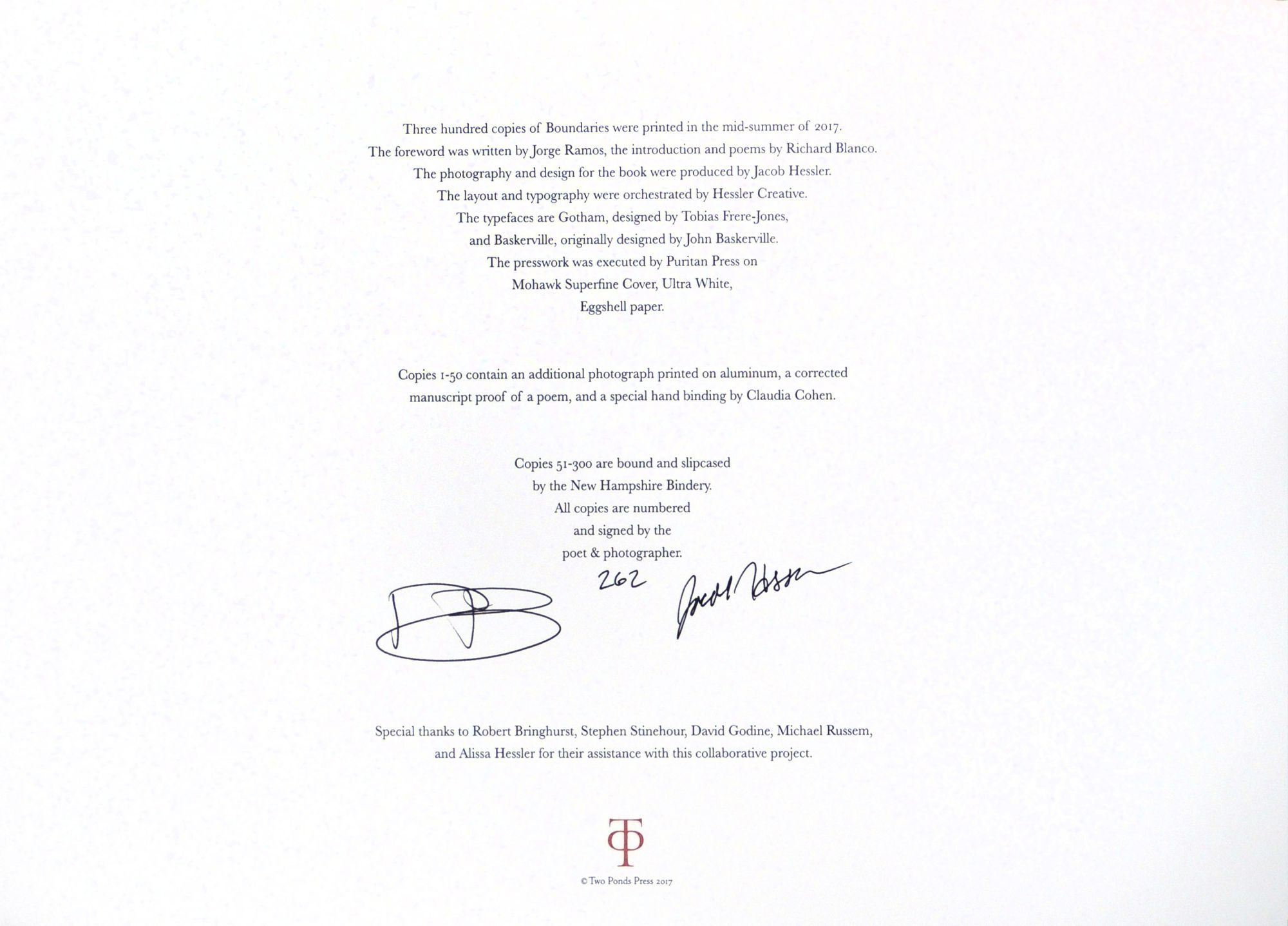 Rockport, ME: Two Ponds Press, 2017. Hardcover. Fine. Hardcover. Number 264 of 300 copies signed by the poet and photographer. This compelling book was created as a collaborative project between Presidential Inaugural Poet Richard Blanco and contemporary landscape photographer Jacob Bond Hessler. In it, Blanco's powerful poetry is juxtaposed with Hessler's evocative photographs. From the Prospectus: "Blanco's poems and Hessler's photographs together investigate the visible and invisible boundaries of race, gender, class, and ethnicity, among many others; they challenge the physical, imagined, and psychological dividing lines - both historic and current - that shadow America and perpetuate an us vs. them mindset by inciting irrational fears, hate, and prejudice. In contrast to the current narrowing definition of an America with very clear-cut boundaries, Blanco and Hessler cross and erase borders. As artists, they tear down barriers to understanding by pushing boundaries and exposing them for what they truly are - fabrications for the sake of manifesting power and oppression pitted against our hopes of indeed becoming a boundary-less nation in a boundary-less world."