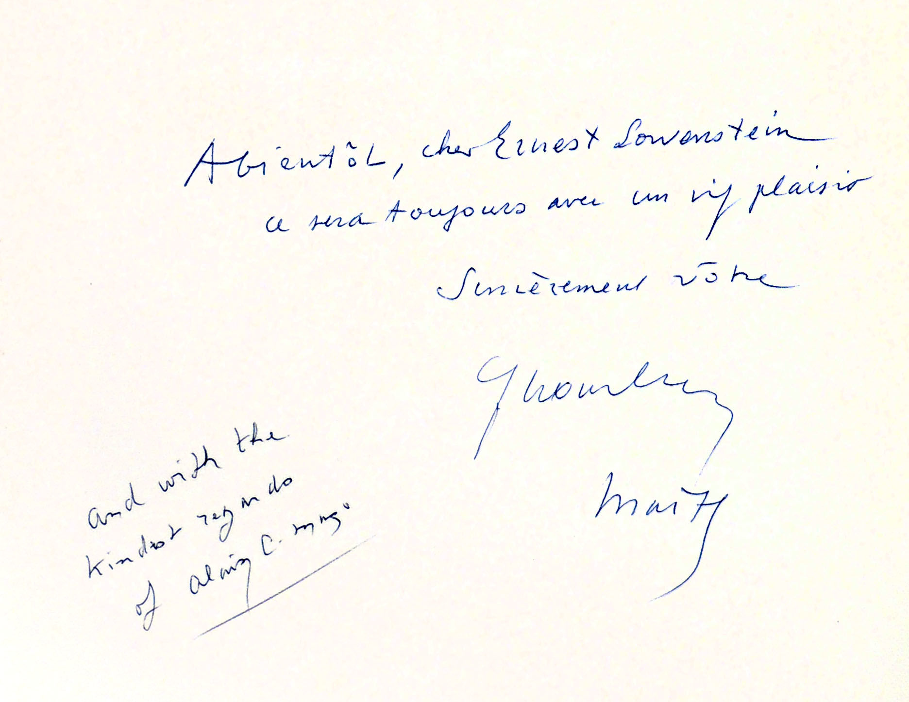 Paris: Fernand Mourlot, 1973. Hardcover. Near Fine. Hardcover. A handsome French volume with reminiscences and photographs of a number of famous artists. They include Braque, Buffet, Calder, Chagall, Dali, Dufy, Giacometti, Matisse, Minaux, Miro, Picasso, Utrillo and many more. With reproductions in offset of lithographs by the various artists. The dust jacket is an original lithograph by André Minaux that was created for this cover. Bound in gray cloth with gilt title to spine. The jacket's lithograph is a multicolored portrait of a woman with a yellow spine. The clear mylar (?) cover includes the title and names of the included artists. Inscribed by the editor Mazo and an unidentified person to Baltimore art dealer Ernest Lowenstein. In near fine condition. Measures 8.5 x 11 inches. 281 pages. ART/072022.