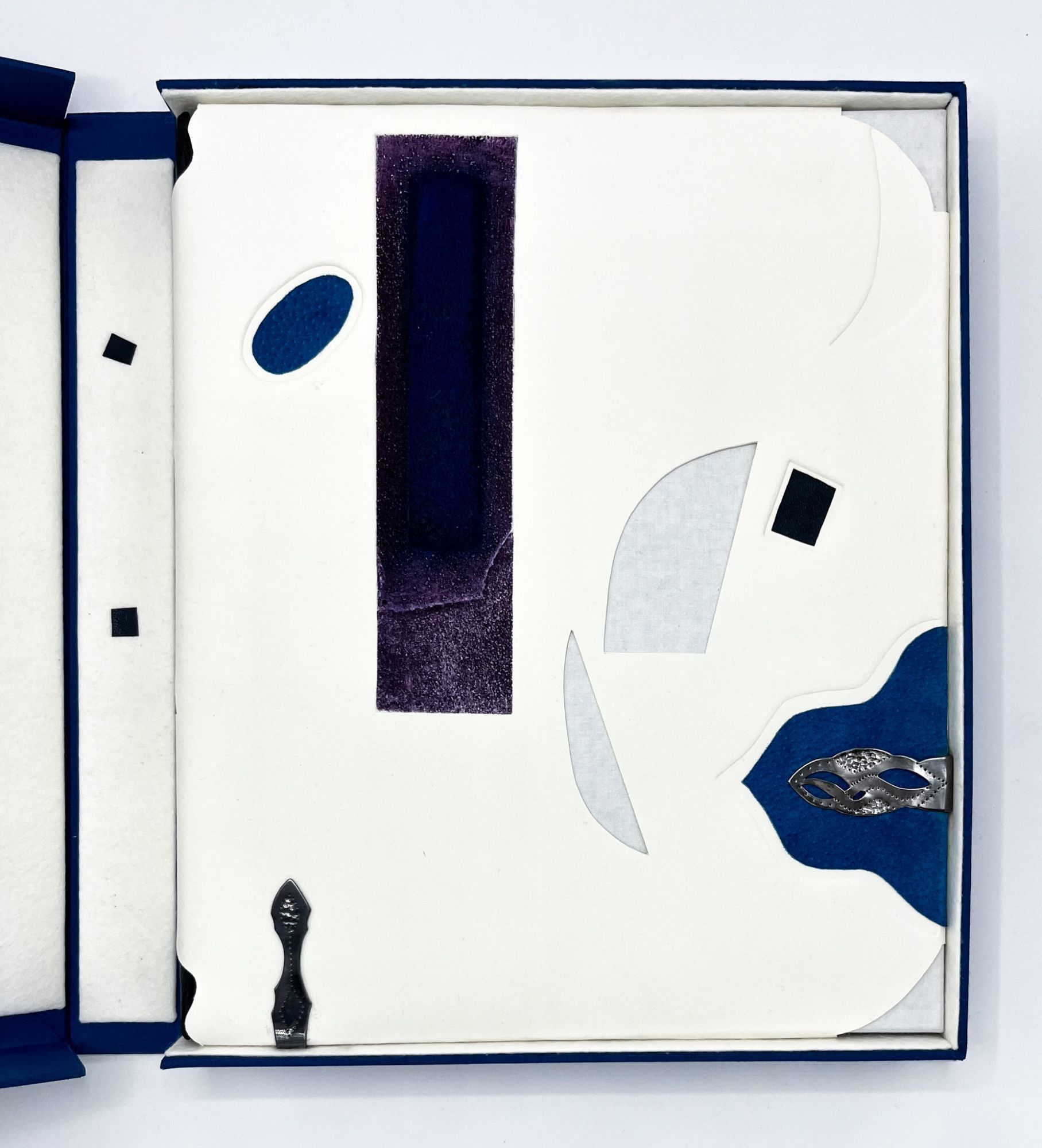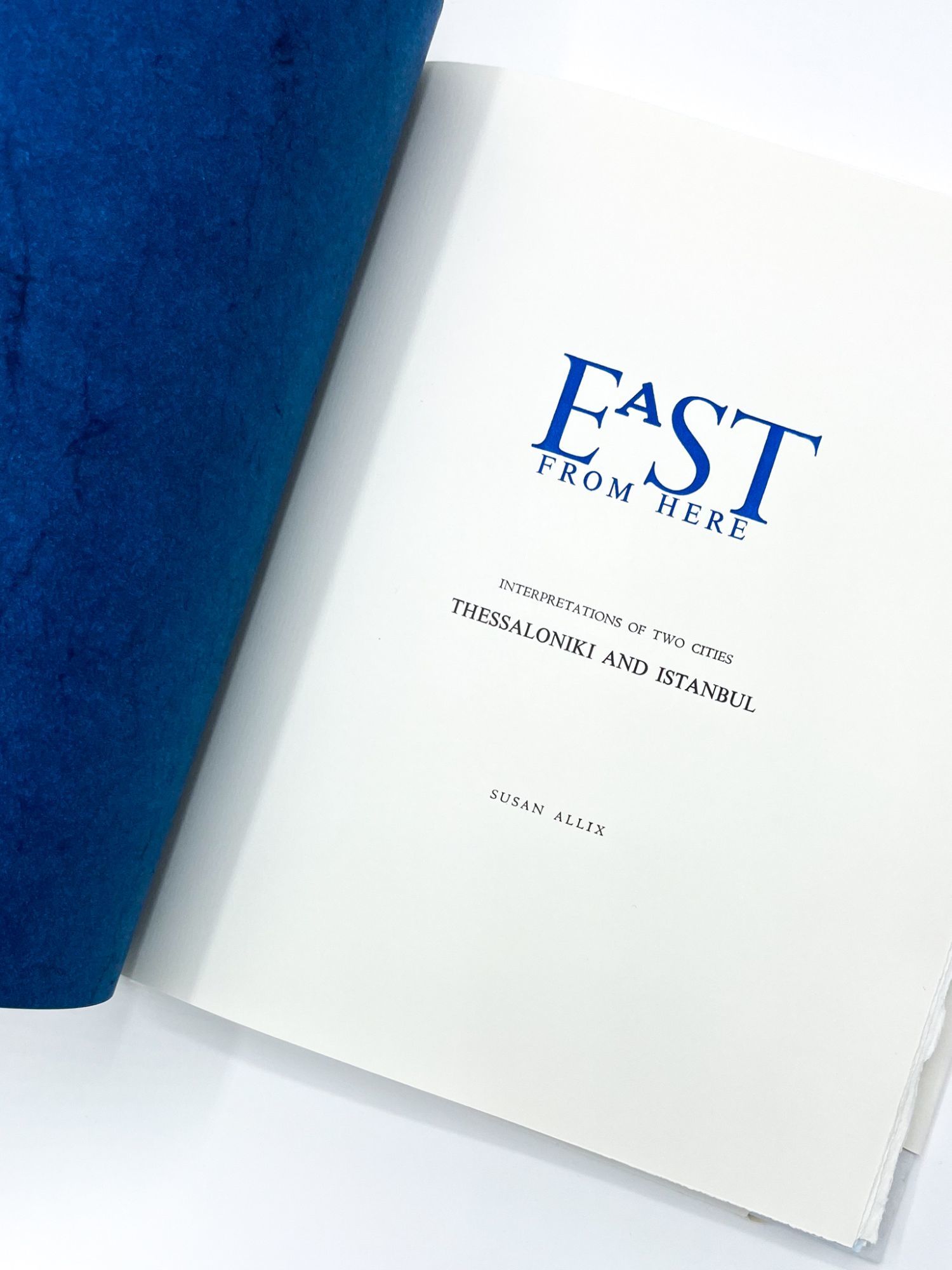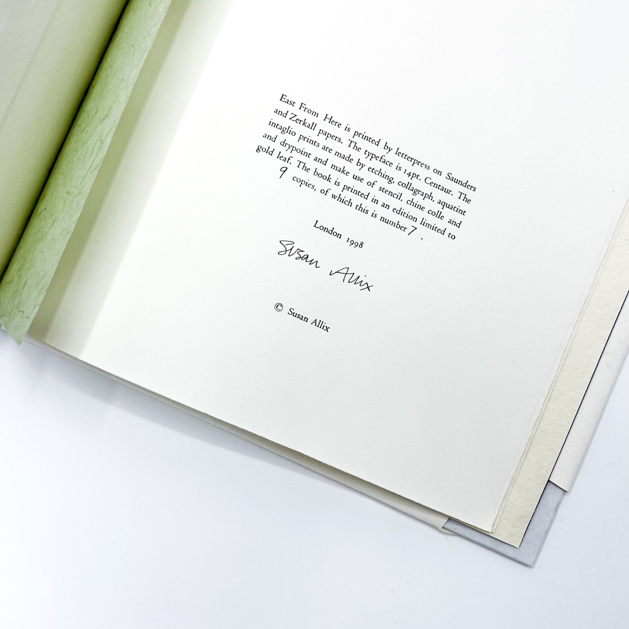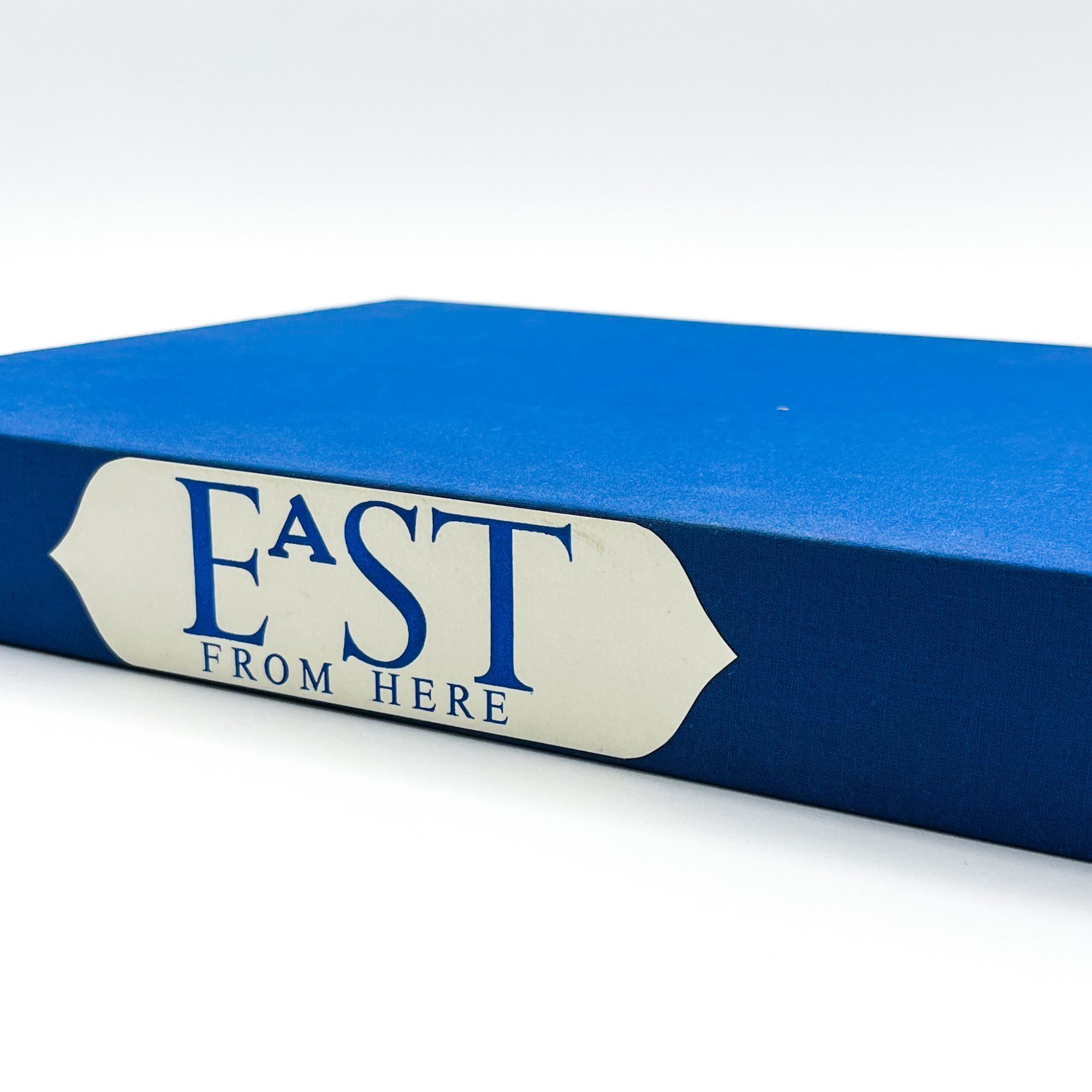 London: n.p., 1998. Fine.. Limited edition artist's book that reflects on the colors, textures, and history of two ancient cities, incorporating a variety of illustration methods and materials. Susan Allix reflects on her creative philosophy, "I am concerned with visual things so I see books as full of colour and form in a pictorial sense as well as through the images created in my mind by the words, and through the sculptural qualities a book possesses" (artist statement). This richly-illustrated textural travelogue, with only two pages of text, is a beautiful example of Allix's artistry and skill at telling stories through visuals. Only nine copies of EAST FROM HERE were produced, one of her smallest limitations. 13.25'' x 10.5''. Original black goatskin-backed white linen boards. Original stiff paper dust jacket with color, embossed, suede, and metal clip elements, with cut-outs revealing the boards. Endpapers of hand-made blue paper. Illustrated with etchings, aquatints, collograph, drypoint, and other methods in color, gilt, and black and white. [50] leaves, [1] half-sheet, some with cut-outs. Signed by Allix to colophon and numbered 7 of 9 copies. In original blue cloth box with paper labels to spine and front joint, lined with soft material and suede. Metal clips a touch tarnished, with a tiny area of rubbing to jacket. Bright and clean.