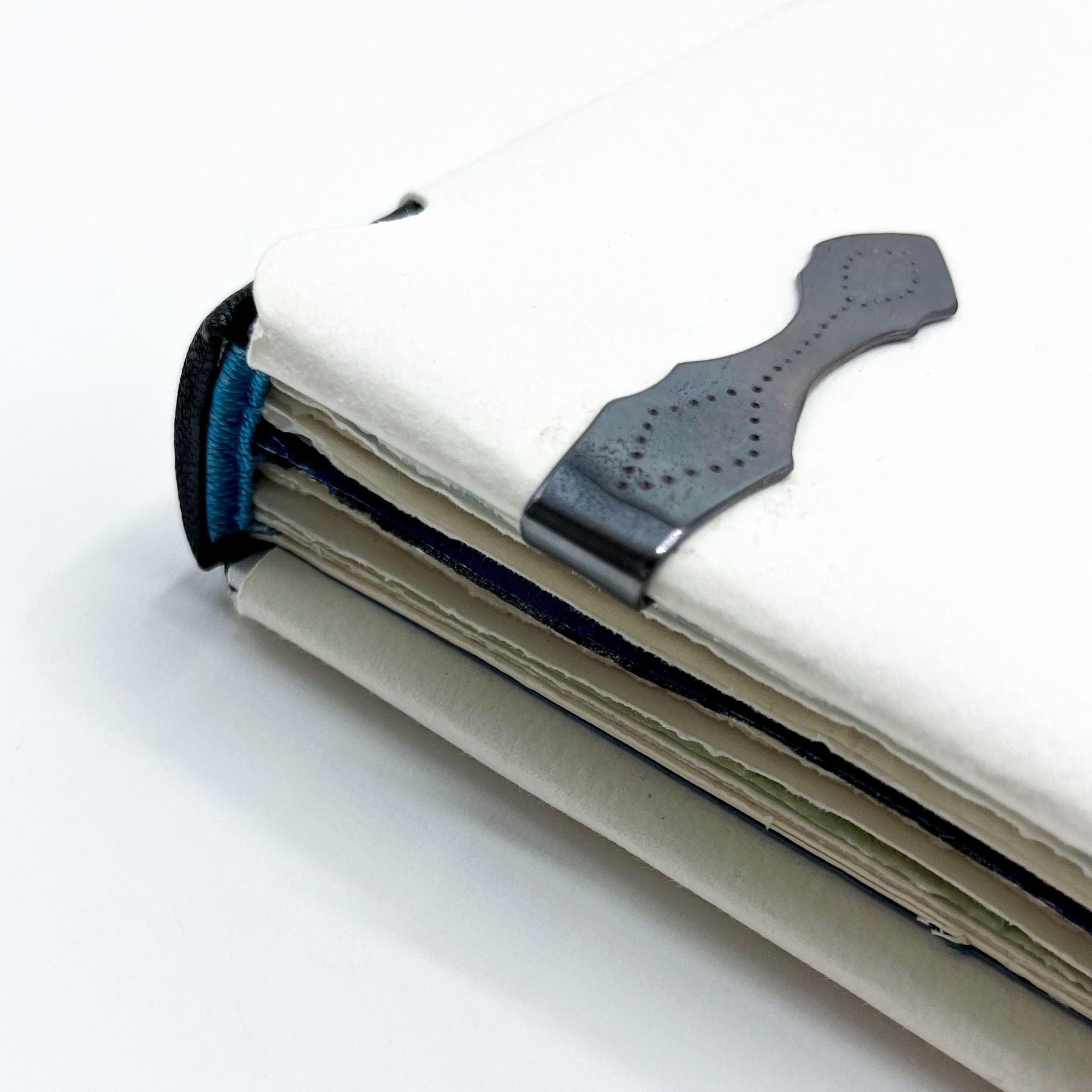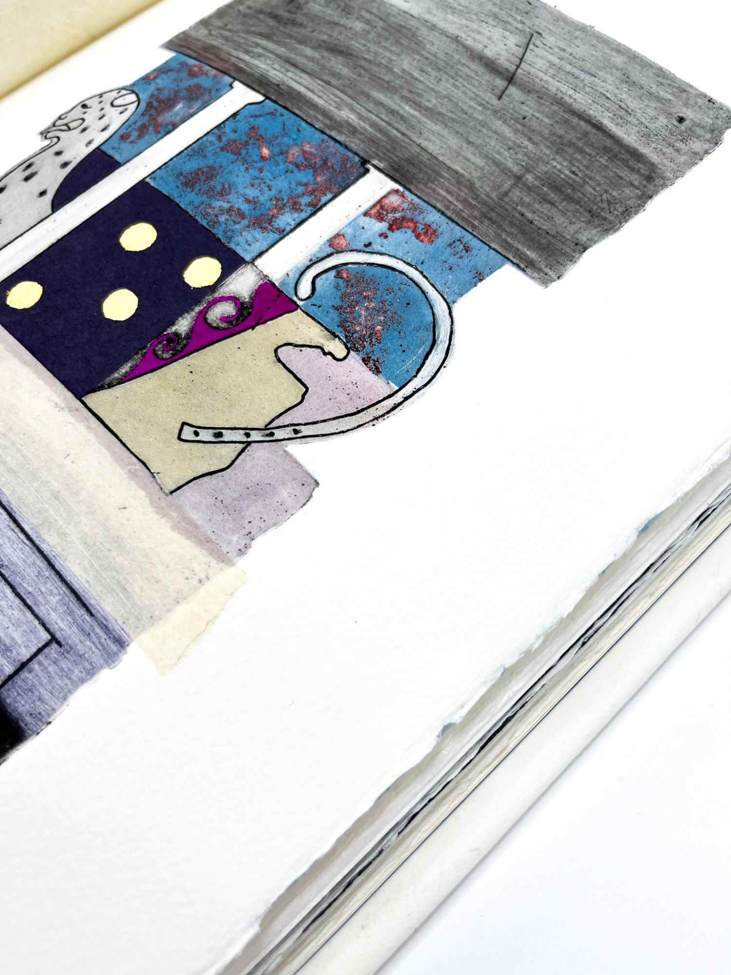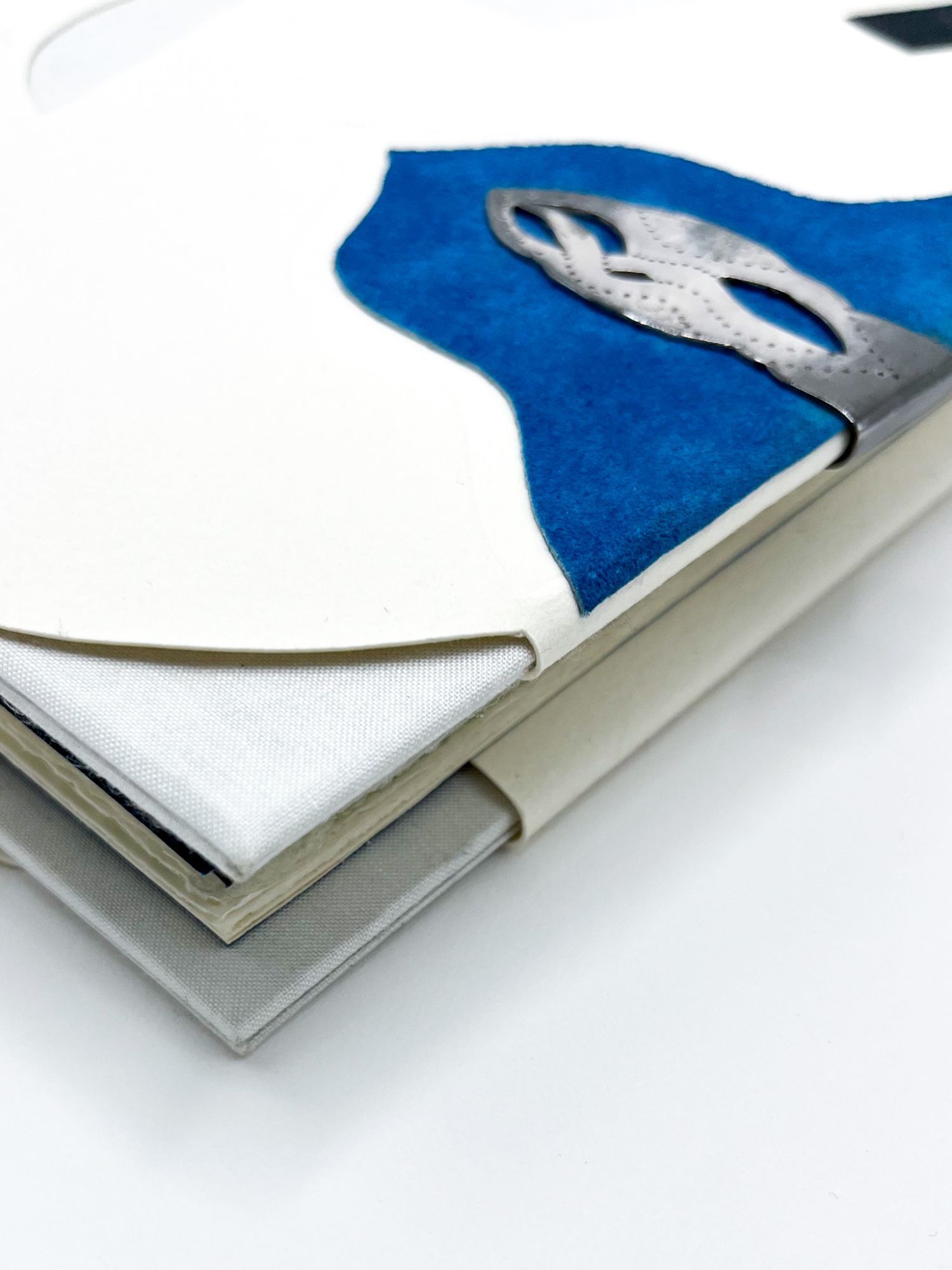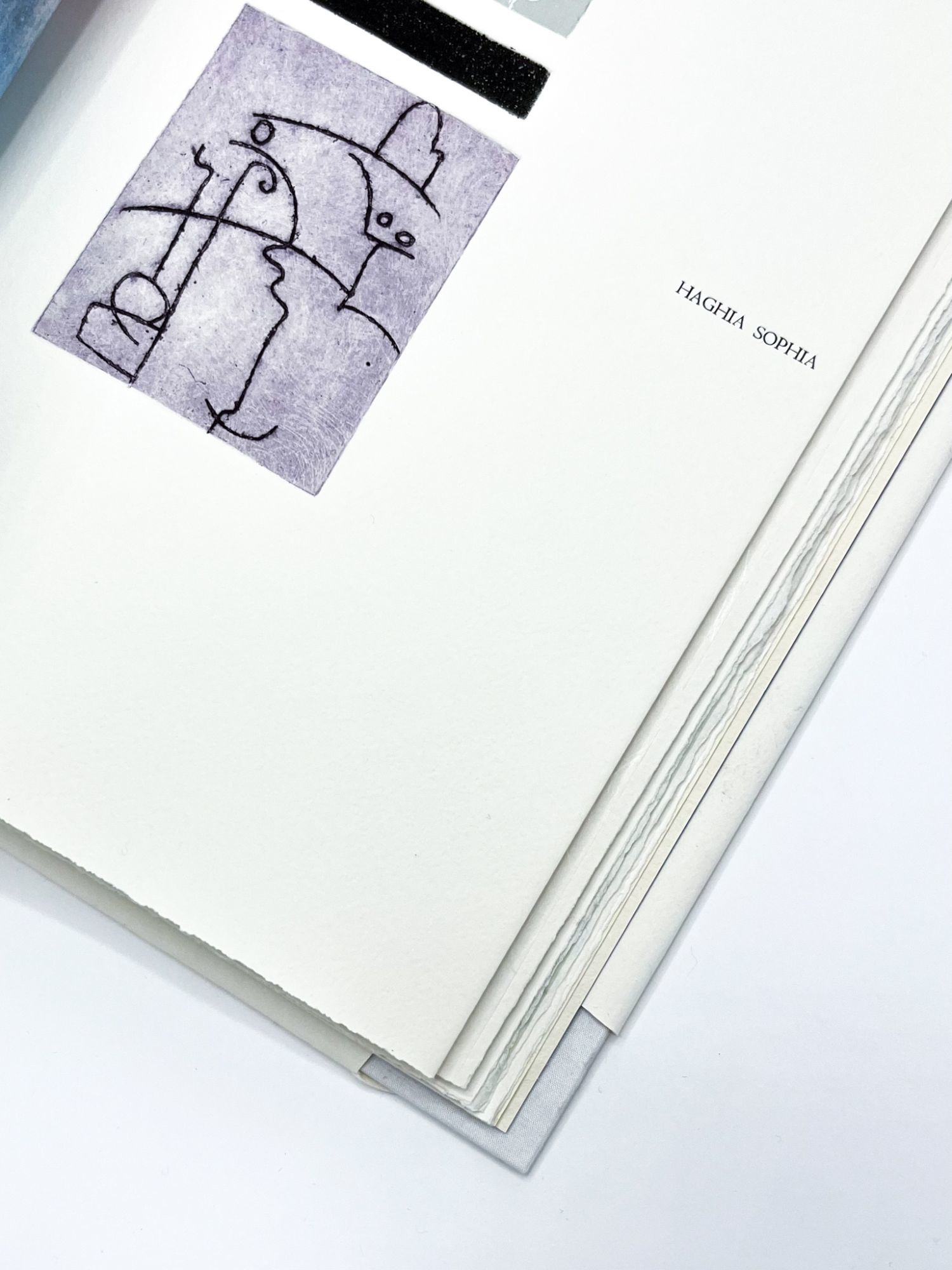 London: n.p., 1998. Fine.. Limited edition artist's book that reflects on the colors, textures, and history of two ancient cities, incorporating a variety of illustration methods and materials. Susan Allix reflects on her creative philosophy, "I am concerned with visual things so I see books as full of colour and form in a pictorial sense as well as through the images created in my mind by the words, and through the sculptural qualities a book possesses" (artist statement). This richly-illustrated textural travelogue, with only two pages of text, is a beautiful example of Allix's artistry and skill at telling stories through visuals. Only nine copies of EAST FROM HERE were produced, one of her smallest limitations. 13.25'' x 10.5''. Original black goatskin-backed white linen boards. Original stiff paper dust jacket with color, embossed, suede, and metal clip elements, with cut-outs revealing the boards. Endpapers of hand-made blue paper. Illustrated with etchings, aquatints, collograph, drypoint, and other methods in color, gilt, and black and white. [50] leaves, [1] half-sheet, some with cut-outs. Signed by Allix to colophon and numbered 7 of 9 copies. In original blue cloth box with paper labels to spine and front joint, lined with soft material and suede. Metal clips a touch tarnished, with a tiny area of rubbing to jacket. Bright and clean.
