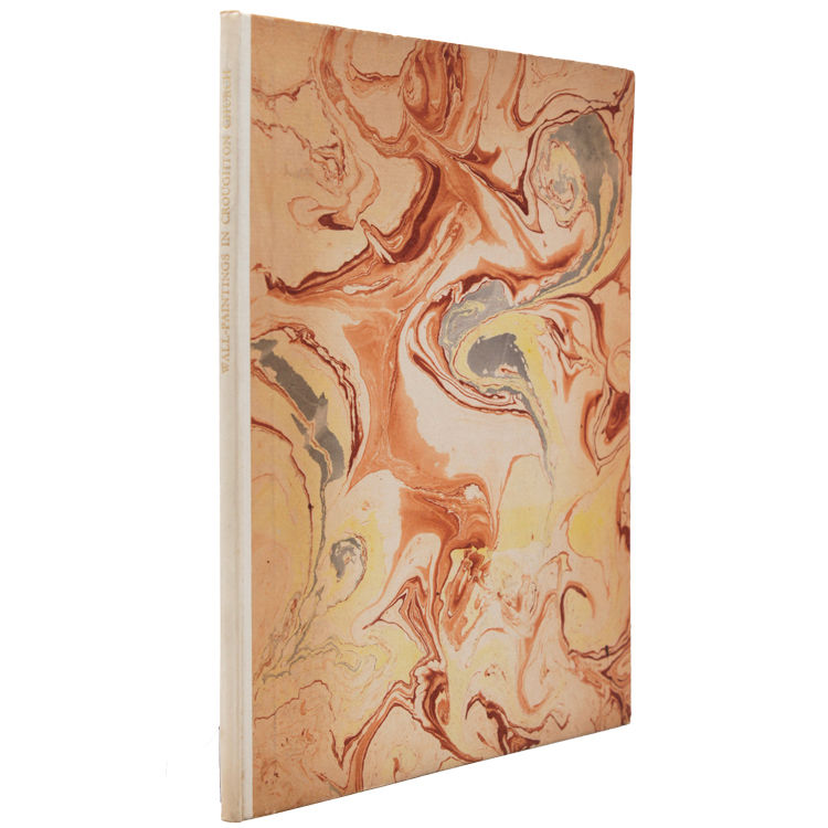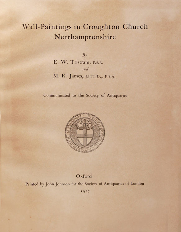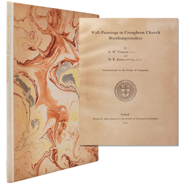 Oxford: Printed by John Johnson for the Society of Antiquaries, London, 1927. First separate edition, reprinted from Archaeologia, Vol. LXXVI. With 13 plates (three in color). Pp. [ii], [179-204. 1 vols. Folio. Marbled boards, art vellum spine titled in gilt. Top corner of lower board bumped. Some toning to first and last page, a few stray traces of foxing. Very good plus. Scarce. First separate edition, reprinted from Archaeologia, Vol. LXXVI. With 13 plates (three in color). Pp. [ii], [179-204. 1 vols. Folio. Allan Ramsay, Master of Magdalene College, Cambridge, and a former master at Eton, inherited Croughton House and M.R. James visited him while the church was being restored. E.W. Tristram advised on the preservation of the wall paintings: “a very interesting lot in two rows on the aisle walls — of the life of Chrust soon after 1300 at the latest” (Pfaff, p. 362). Tristram’s paper discusses the paintings in a general way (pp. 179-184); M.R. James writes a detailed iconography of each painting in the series, keyed to the plates.