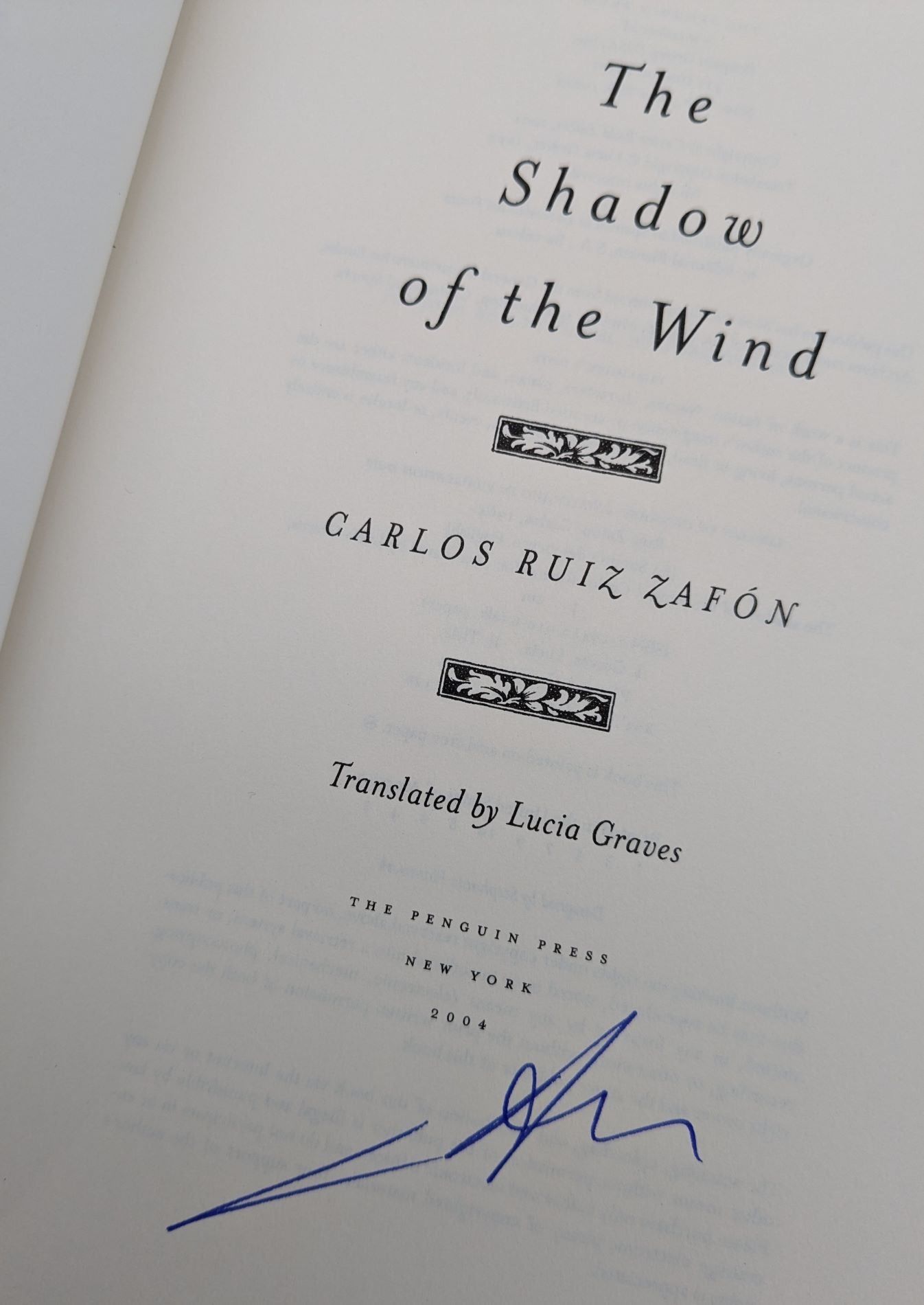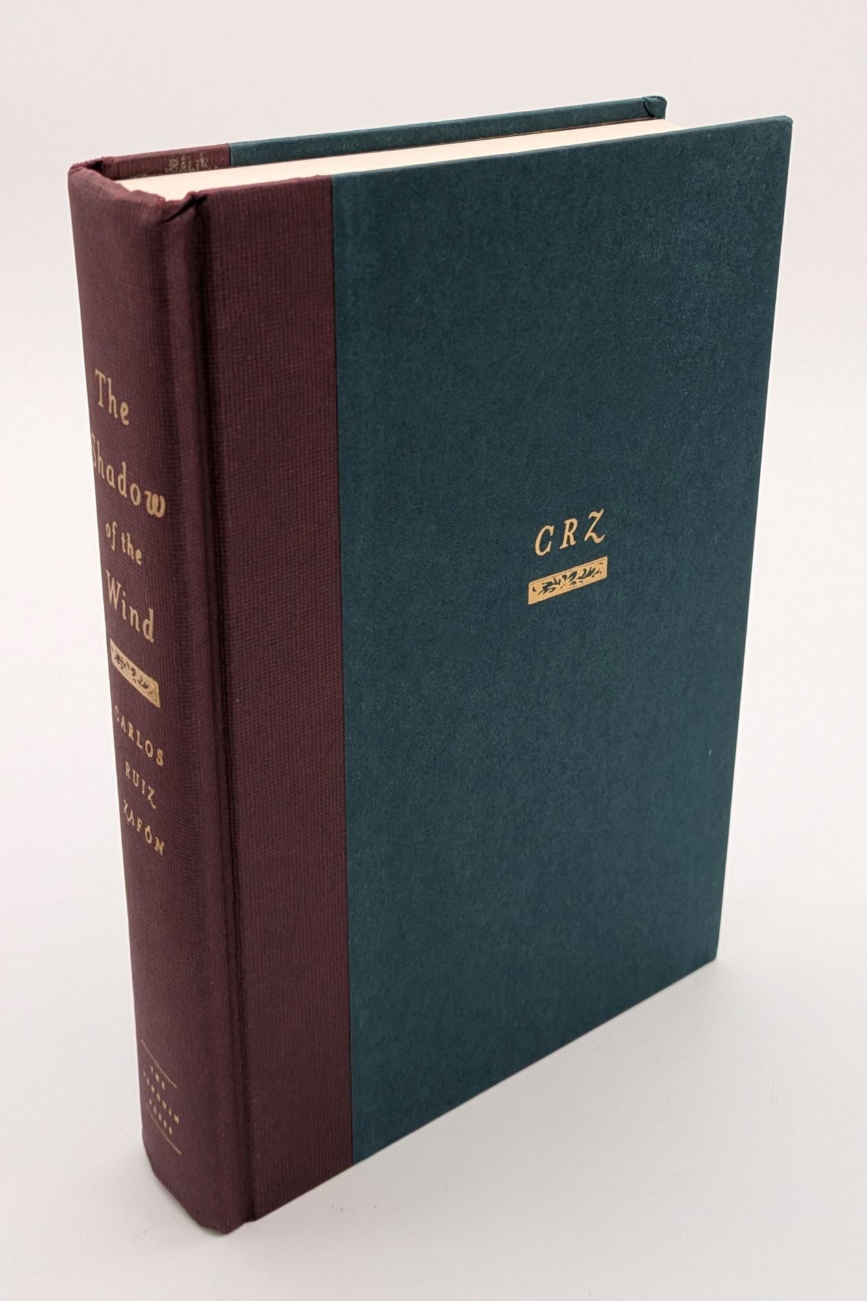 New York: The Penguin Press, 2004. First American edition. Hardcover. Very good/near fine. SIGNED. 486pp. Large octavo [24 cm] 1/4 maroon with dark green paper covered boards, a gilt stamped title on the spine, and the author's initials stamped in gilt on the front cover. Marbled endsheets. The head of the spine is just a bit bruised, and the spine is just a hair rolled back. Signed by Zafon on the title page. A signed first American edition of Zafon's first novel, and a worldwide bestseller.