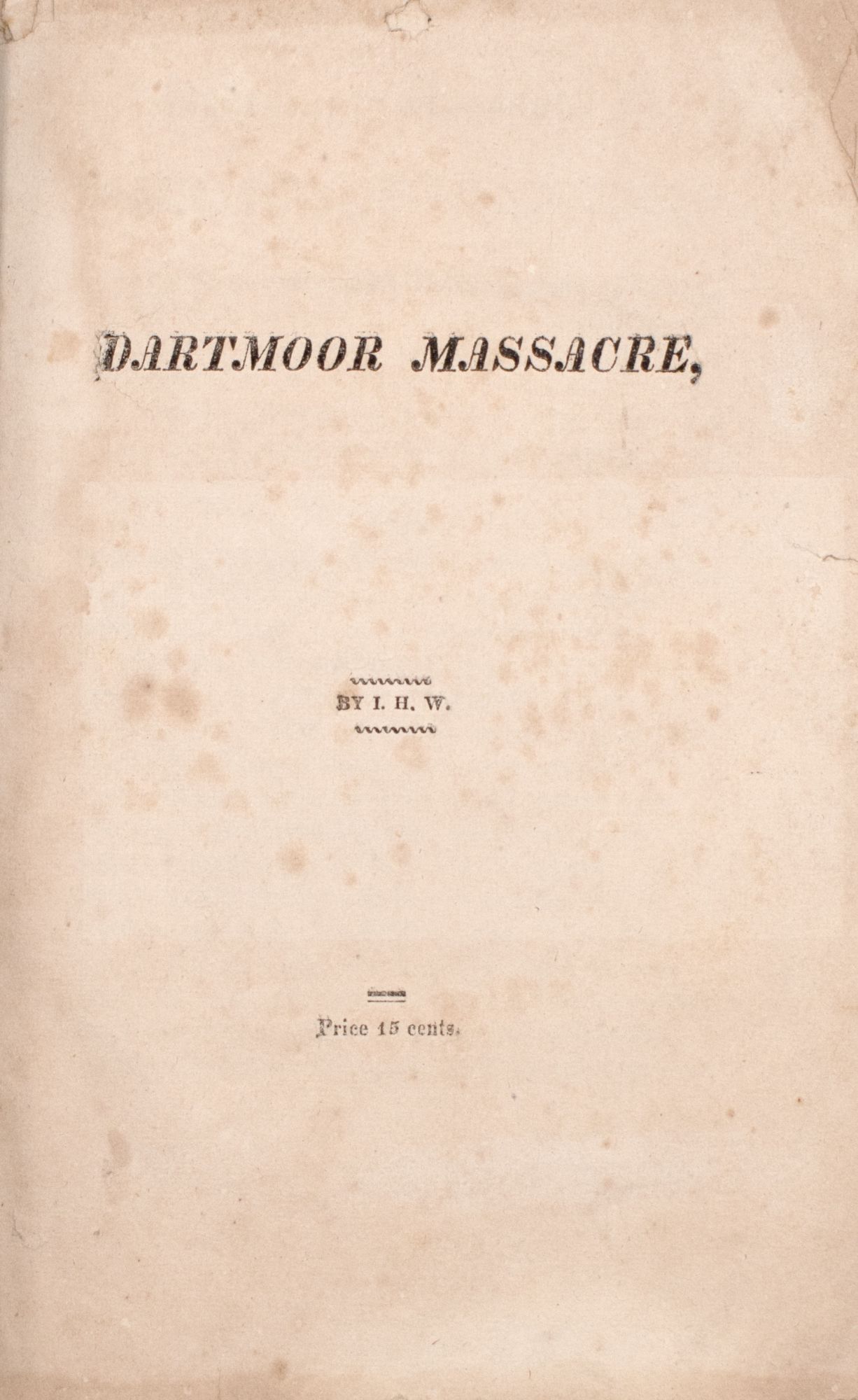 [Boston]: Price 15 cents, 1815. 7, [1]pp. Uncut. 8vo. Original blue paper wrappers. 7, [1]pp. Uncut. 8vo. Scarce account in verse of the Dartmoor Massacre in which American prisoners (captured American seamen) in a British jail were attacked by their captors at the end of the War of 1812. A caption title above the first stanza reads: "Transposed in Verse from the New-York Commercial Advertiser of the 6th June last, and the Boston papers of the same month." Sabin 100885; Stoddard and Whitesell 1116; Wegelin 1187n; Shaw and Shoemaker 36459