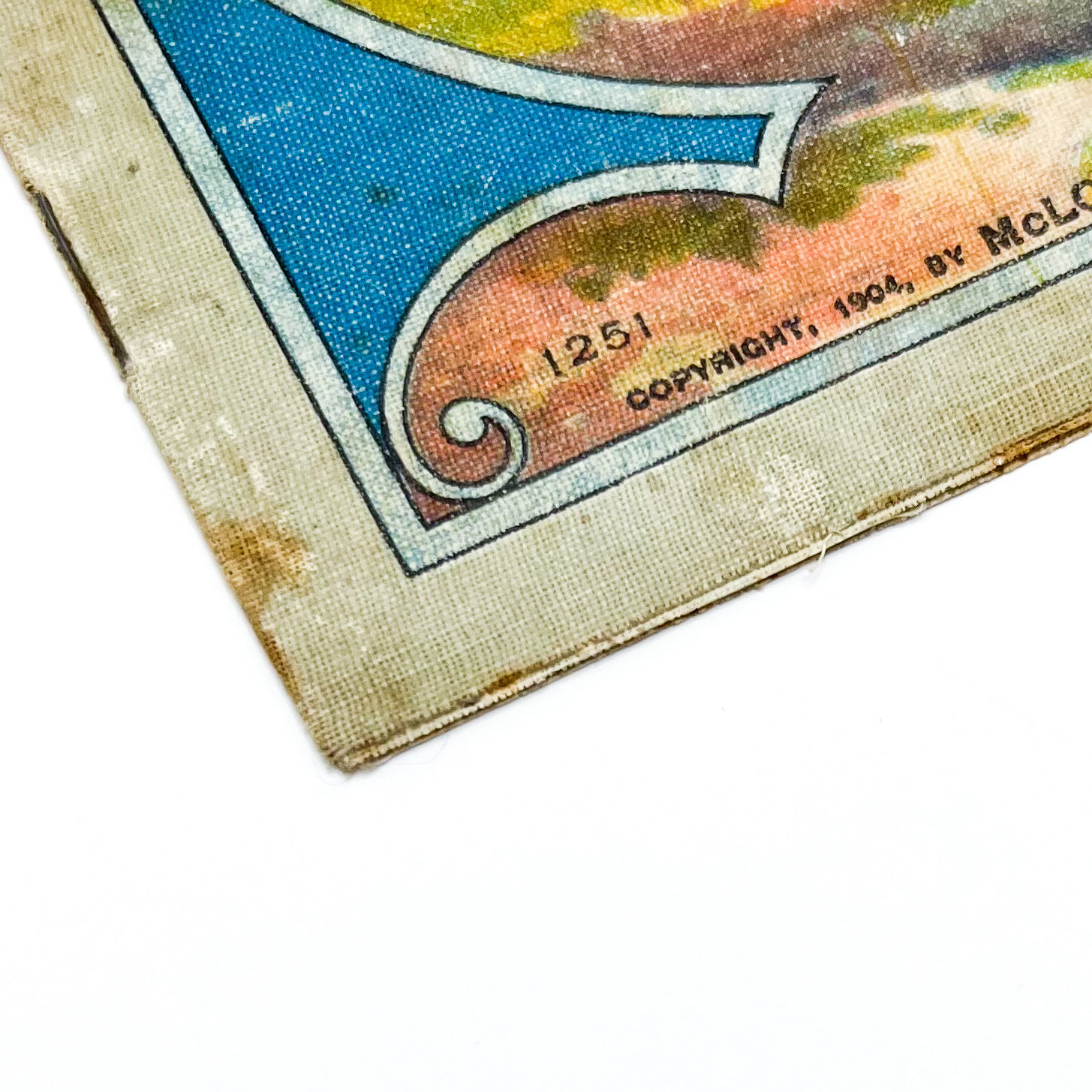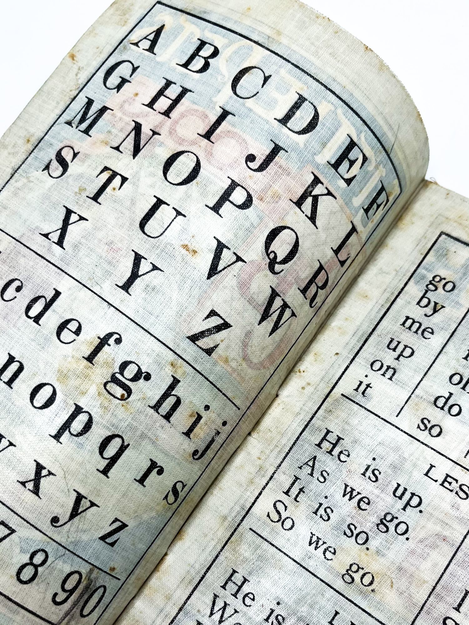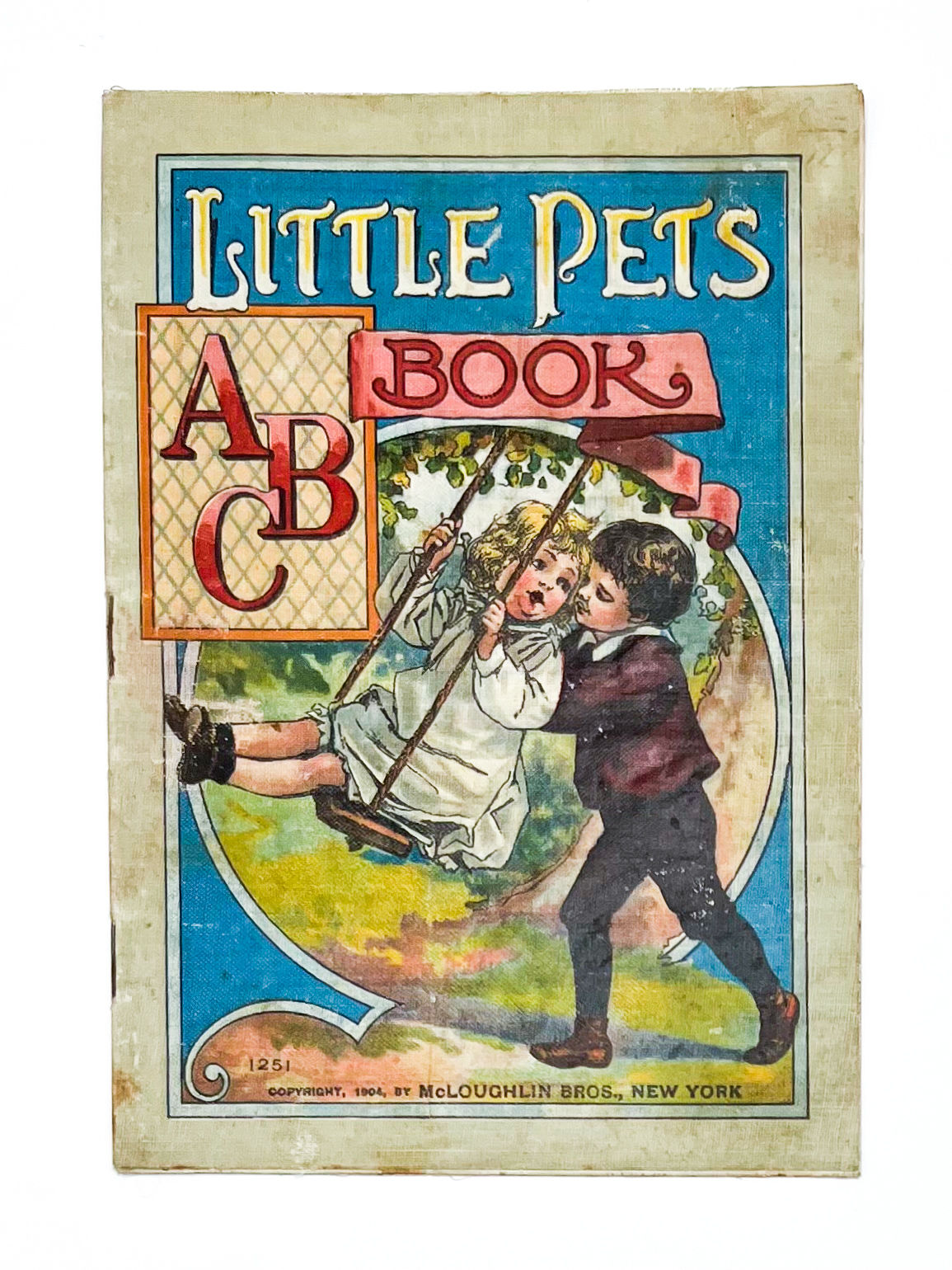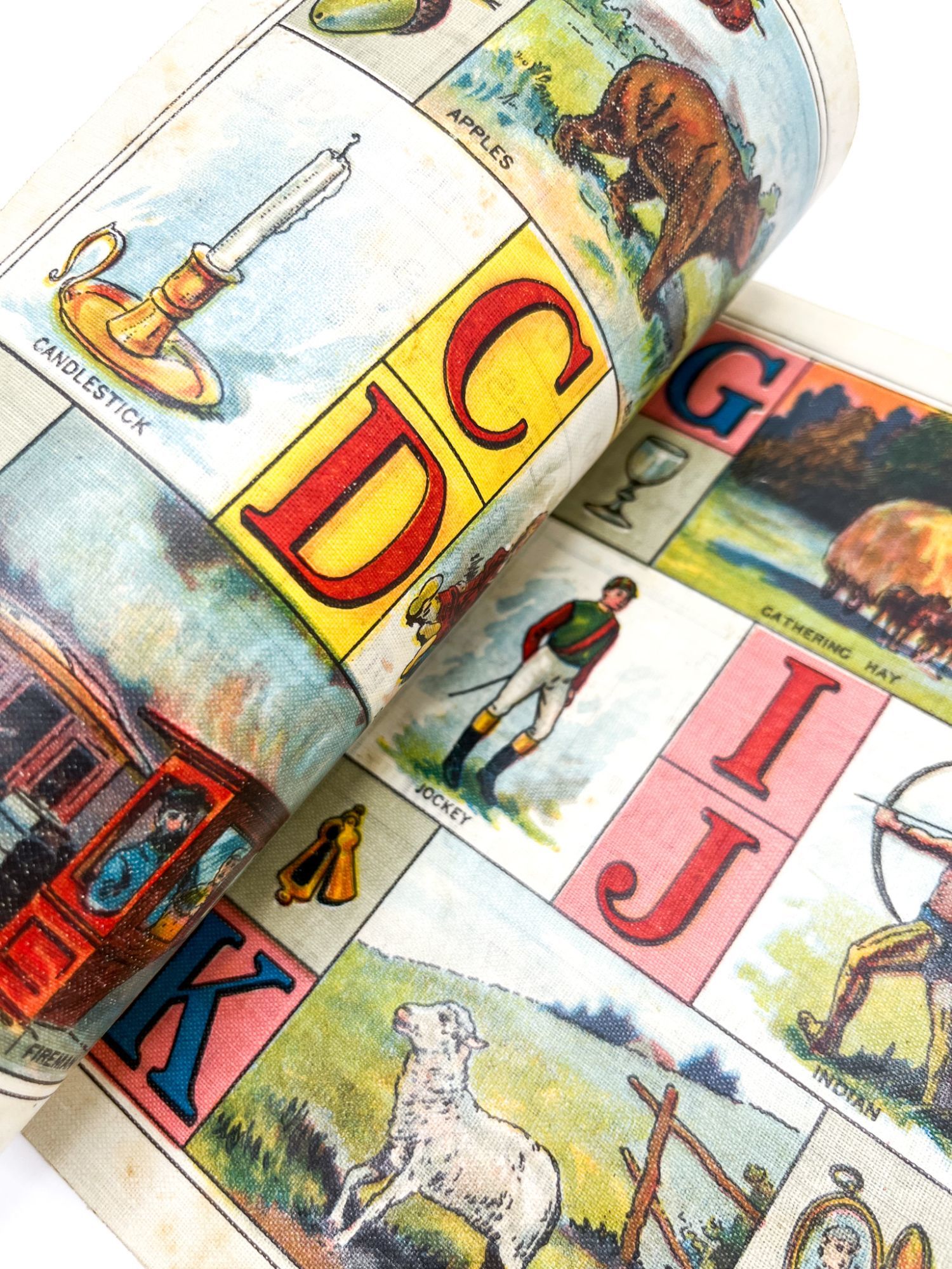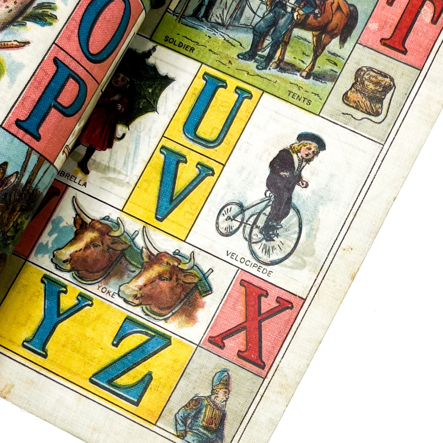 New York: McLoughlin Bros, 1904. Very good.. Great ABC book printed on linen for easy use by young children, illustrated in charming early 20th-century fashion with terms like "Velocipede." Charming color wrappers. Each letter vibrantly illustrated: "E" is for Engineer, "G" and "H" are for "Gathering Hay," and "S" is for "Soldier." 8.25'' x 5.75''. Original linen pictorial wrappers. Illustrated with four pages of full color pictures for the alphabet; word lessons on the remainder. [8] pages. Faint former pencil price to top right corner of front wrapper. Moderate spotting and rubbing. Binding firm.
