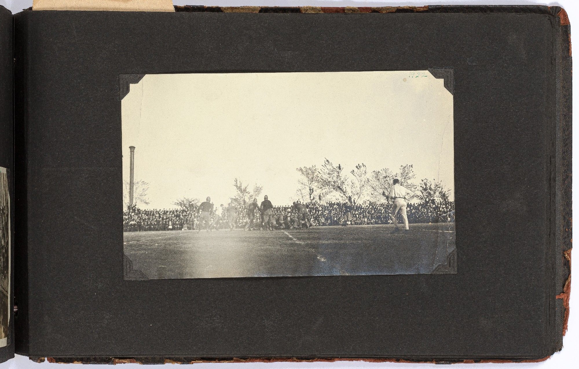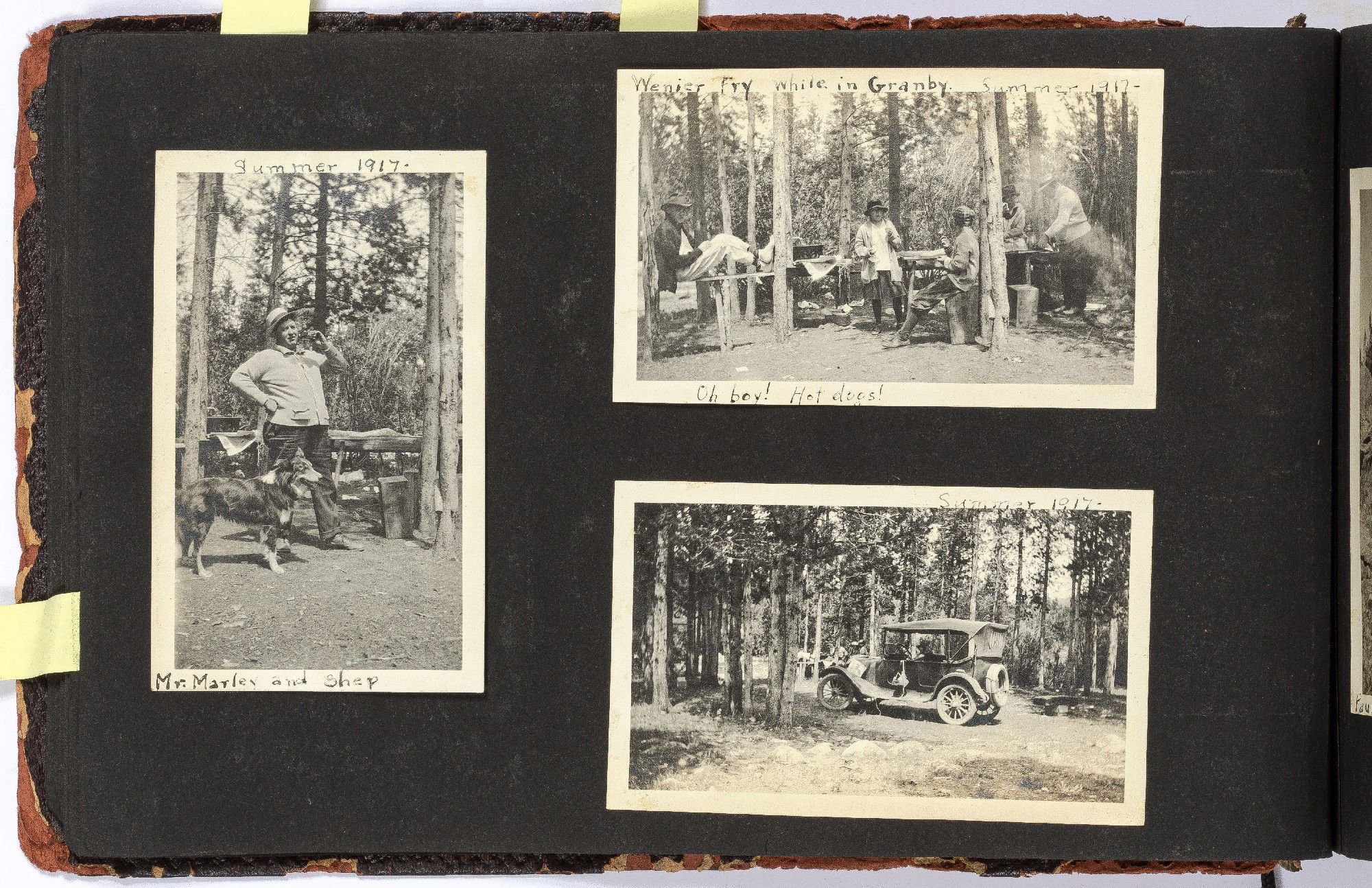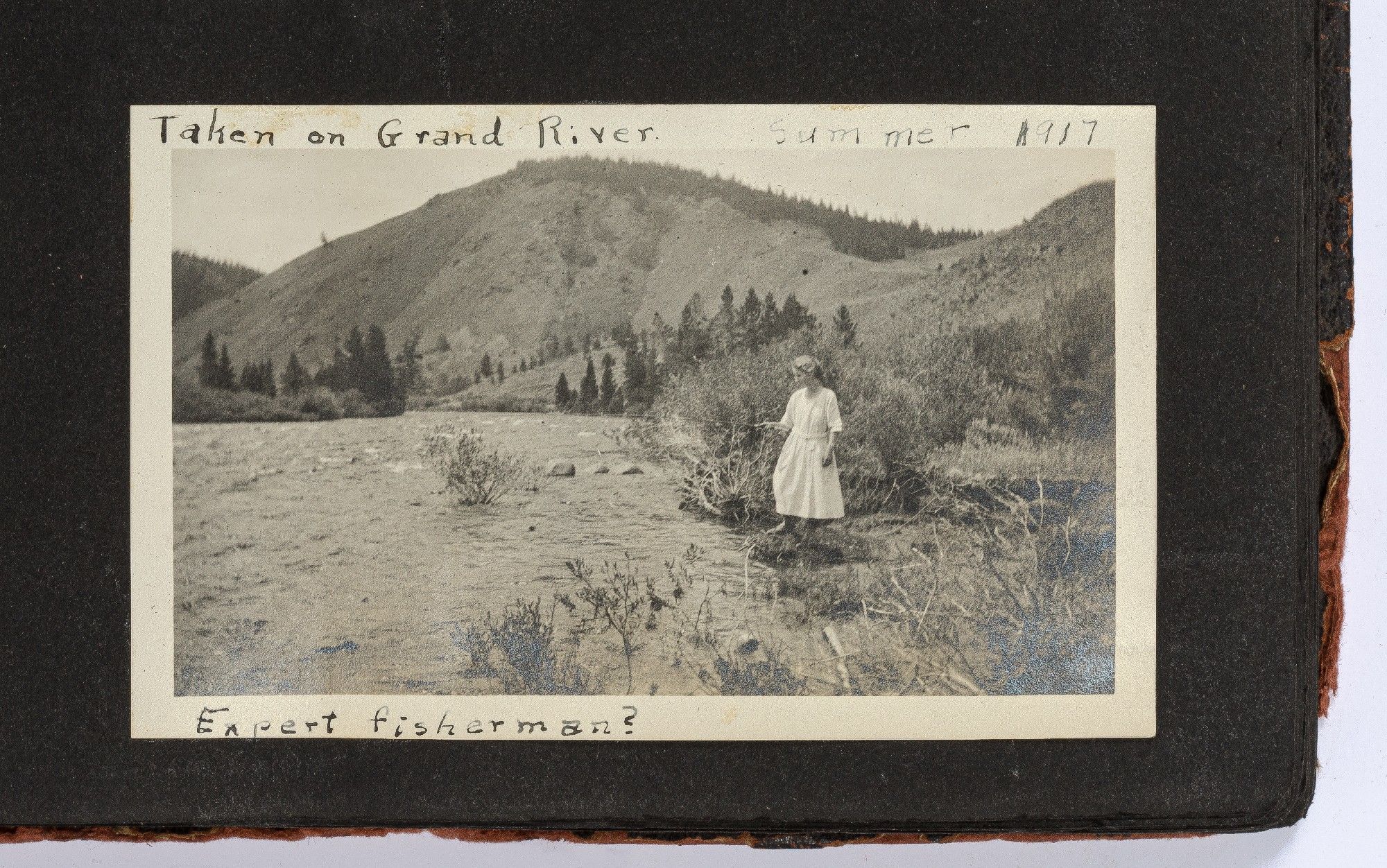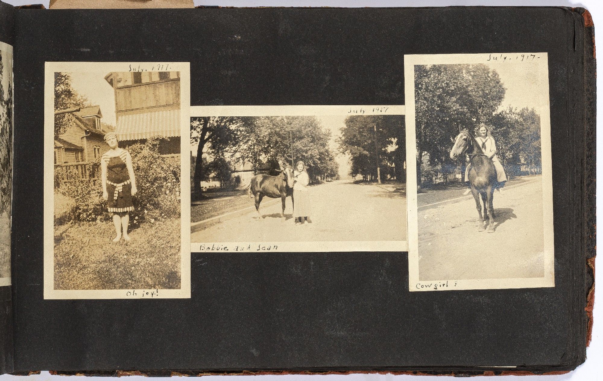 The album contains many candid images of a young woman out and about with family and friends at her home in Denver, Colorado, and on various outings in the mountains along the Continental Divide and the Colorado River. The album features several images of horses and automobiles, both at Denver and mountain retreats. Among the images are the young woman and friends seated on large ponies or young horses at Denver and riding at mountain cottages, together with images of hiking excursions and landscape views of valleys and mountains, including Lookout Mountain just west of Denver. Also notable is a large format print (6 ½" x 4") of a football game from 1922.