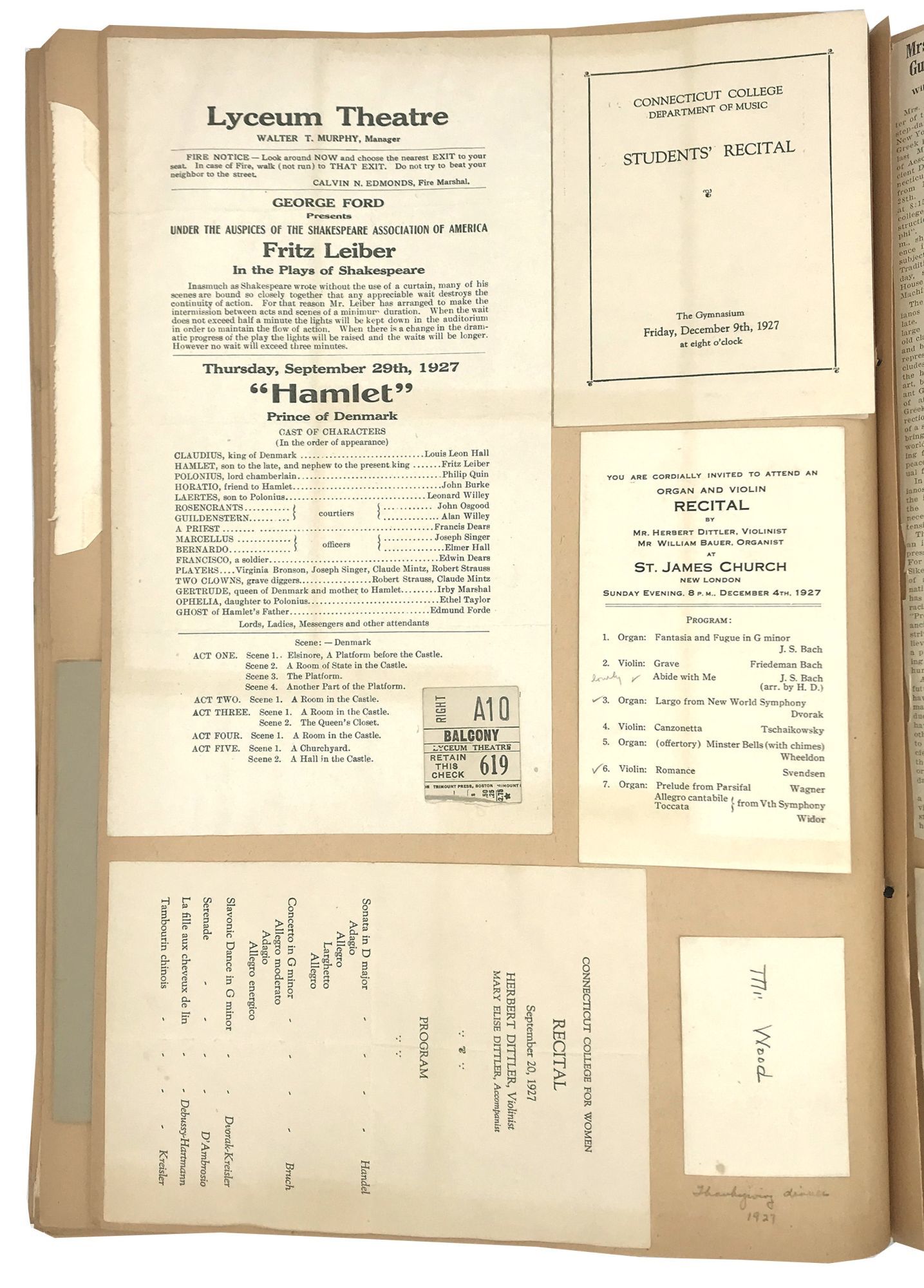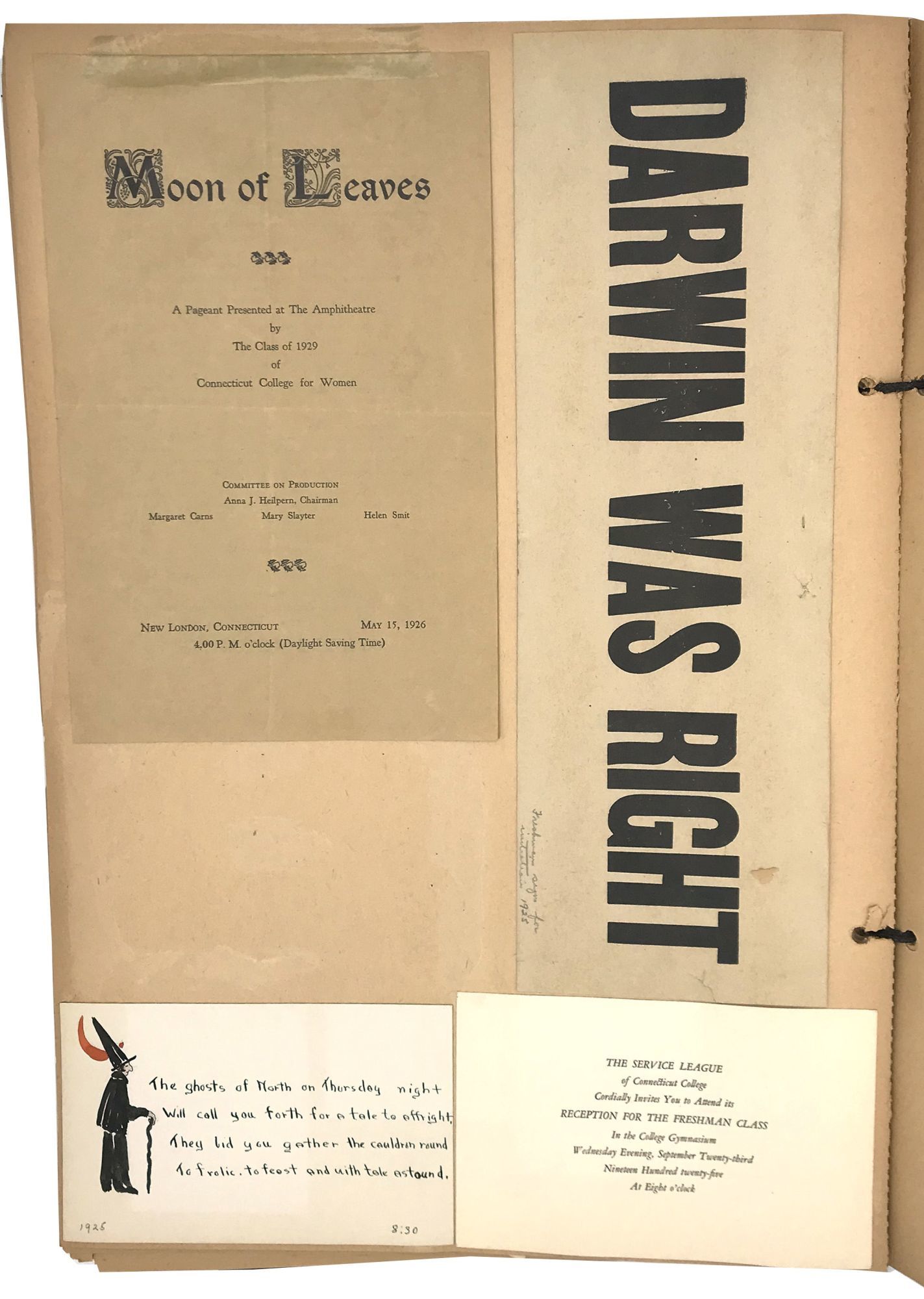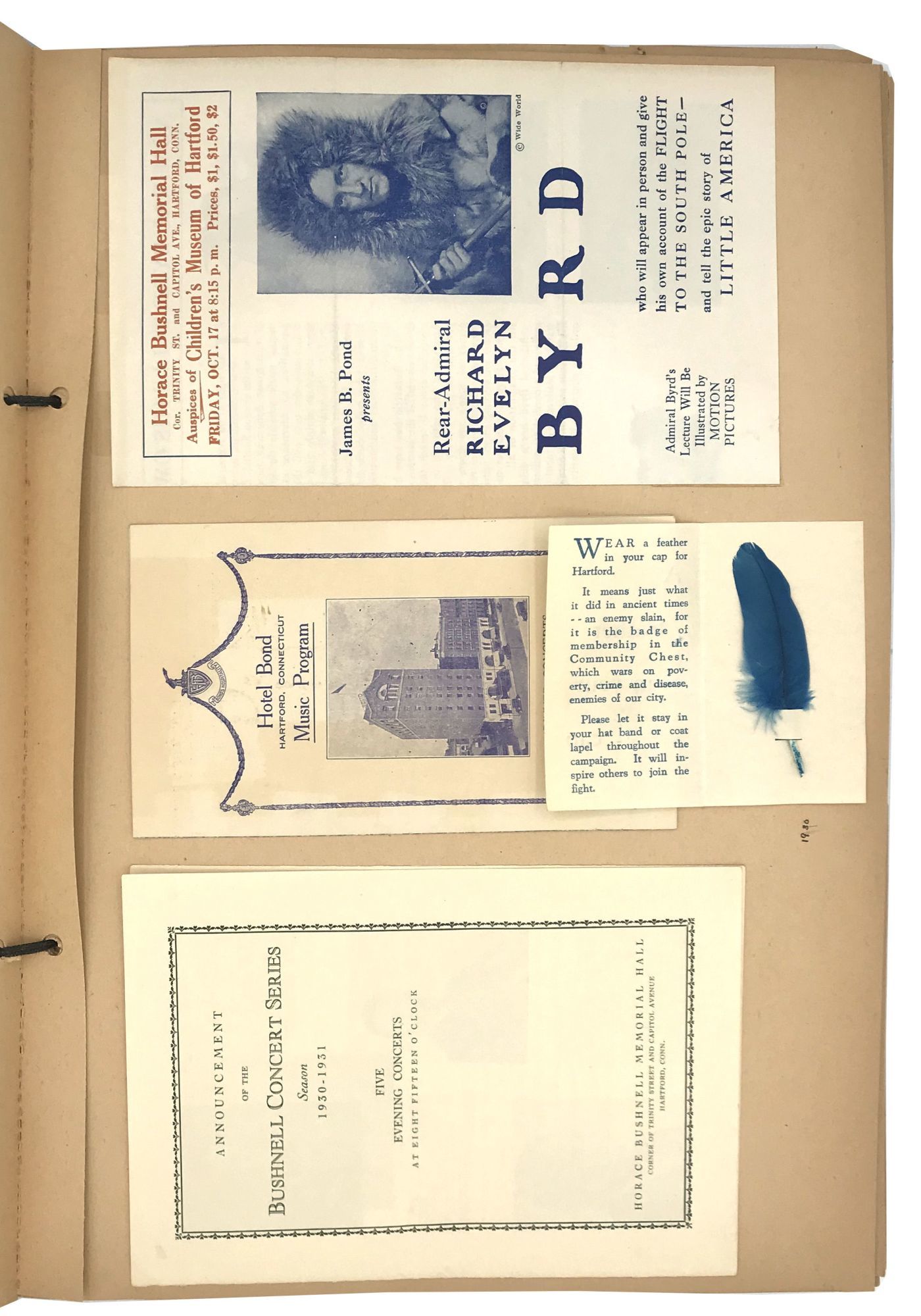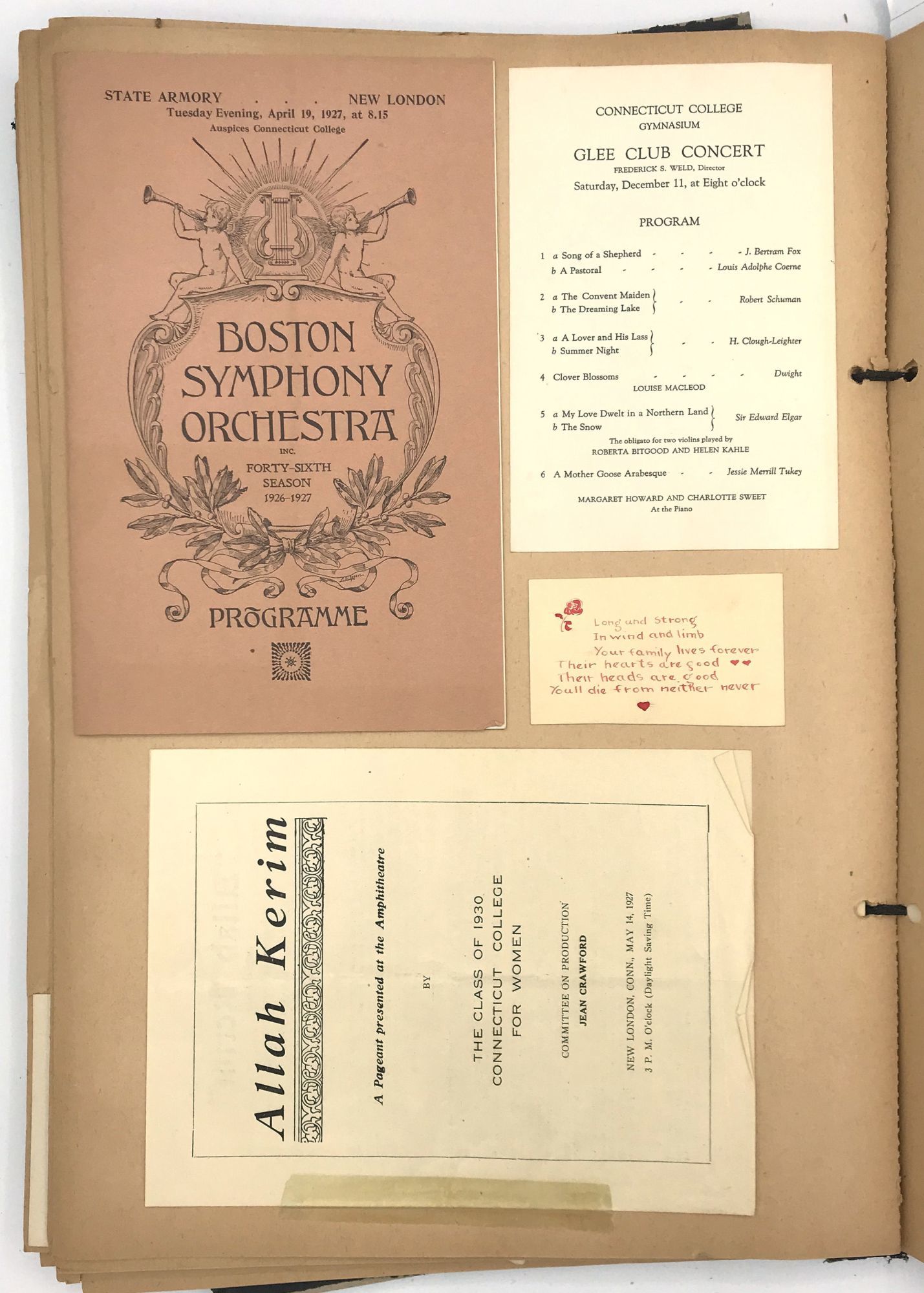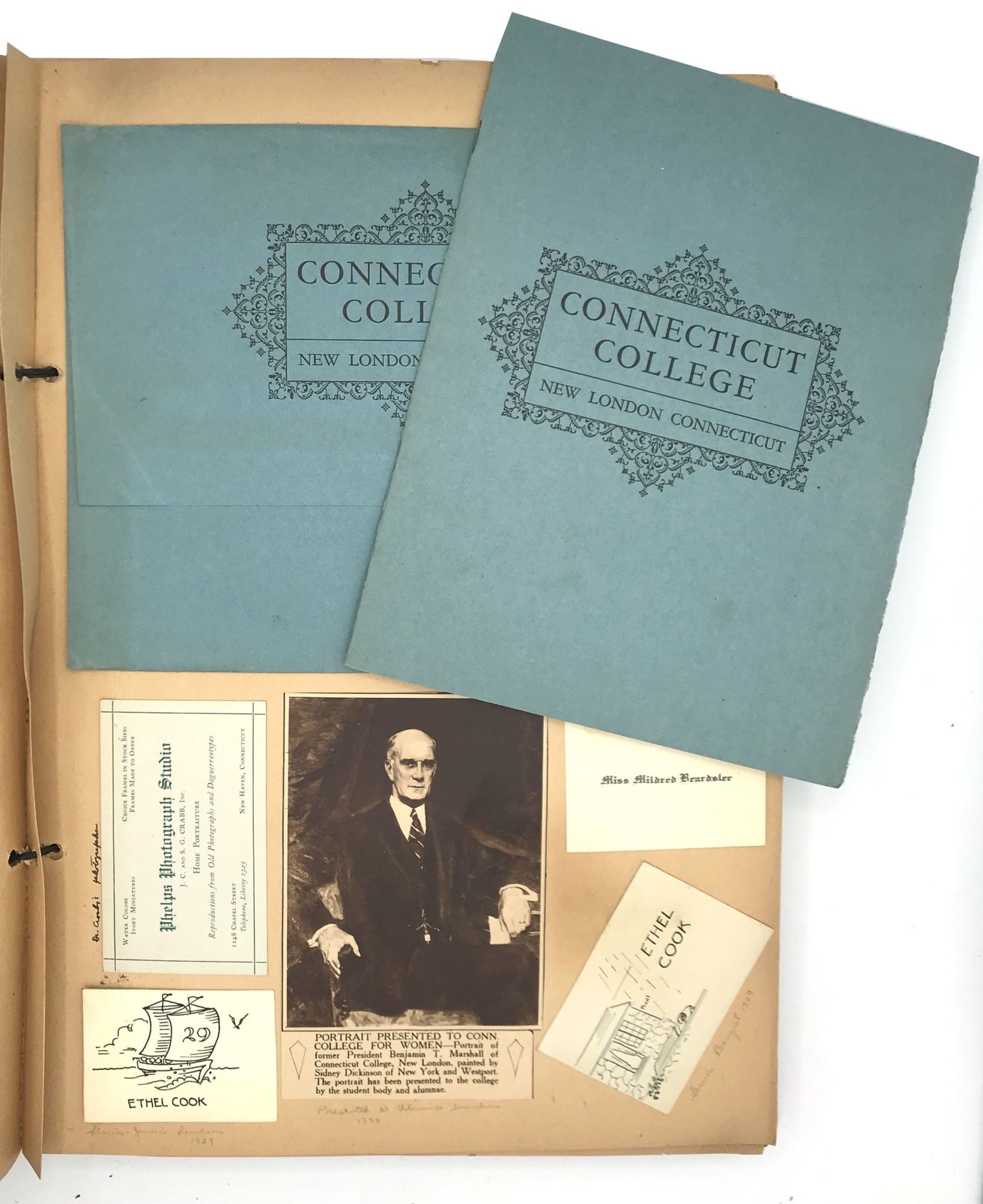New London, Connecticut, 1937. Very good; some ephemera loose, scrapbook paper brittle, boards loose and worn.. An expansive scrapbook of over 200 individual pieces of ephemera collected by Ethel Cook (c.1908-2006) while she was a student in New London, Connecticut, in the late 1920s. Types of ephemera include periodical clippings, hotel stationary, printed programs and playbills, club meeting ephemera, song sheets, correspondence, ribbons and pins, a calendar, and even a signed postcard by Count Luckner. The majority of the ephemera memorializes Ethel's time at Connecticut College before she graduated in 1929, such as a large "Darwin Was Right" sign (which was used by the upperclassmen in a little light hazing), and programs from her time in the College's drama and debate clubs. Many concert programs and theatrical ephemera from New York, Boston, and Hartford are included. The Bushnell in Hartford is particularly well represented; it had just opened in 1930 when Ethel was assembling this scrapbook. An excellent representation of what arts and culture were available to a young Connecticut woman in the 1920s and 1930s.