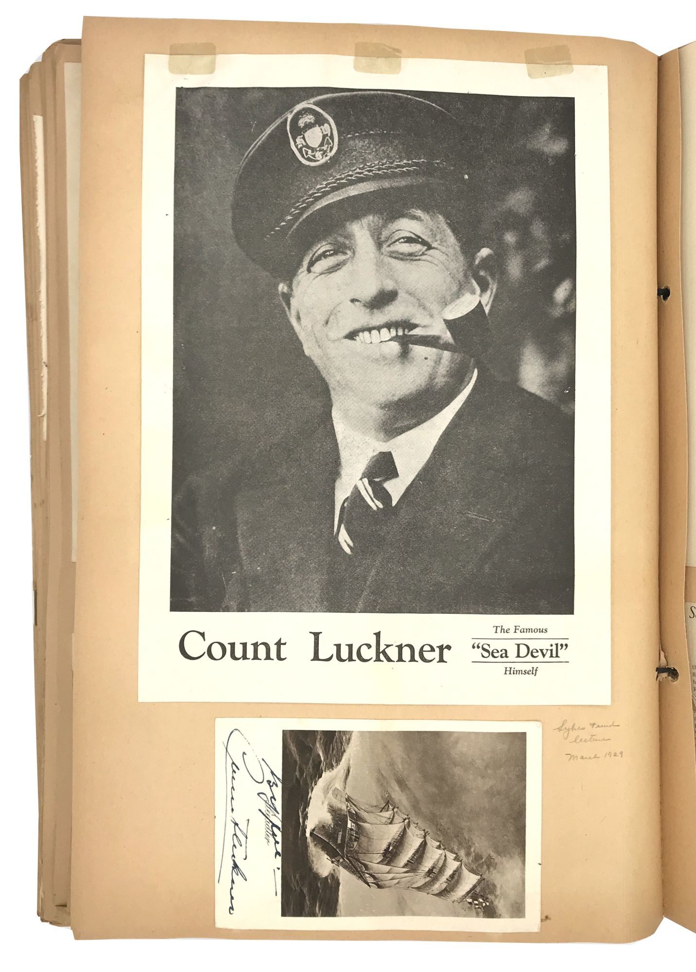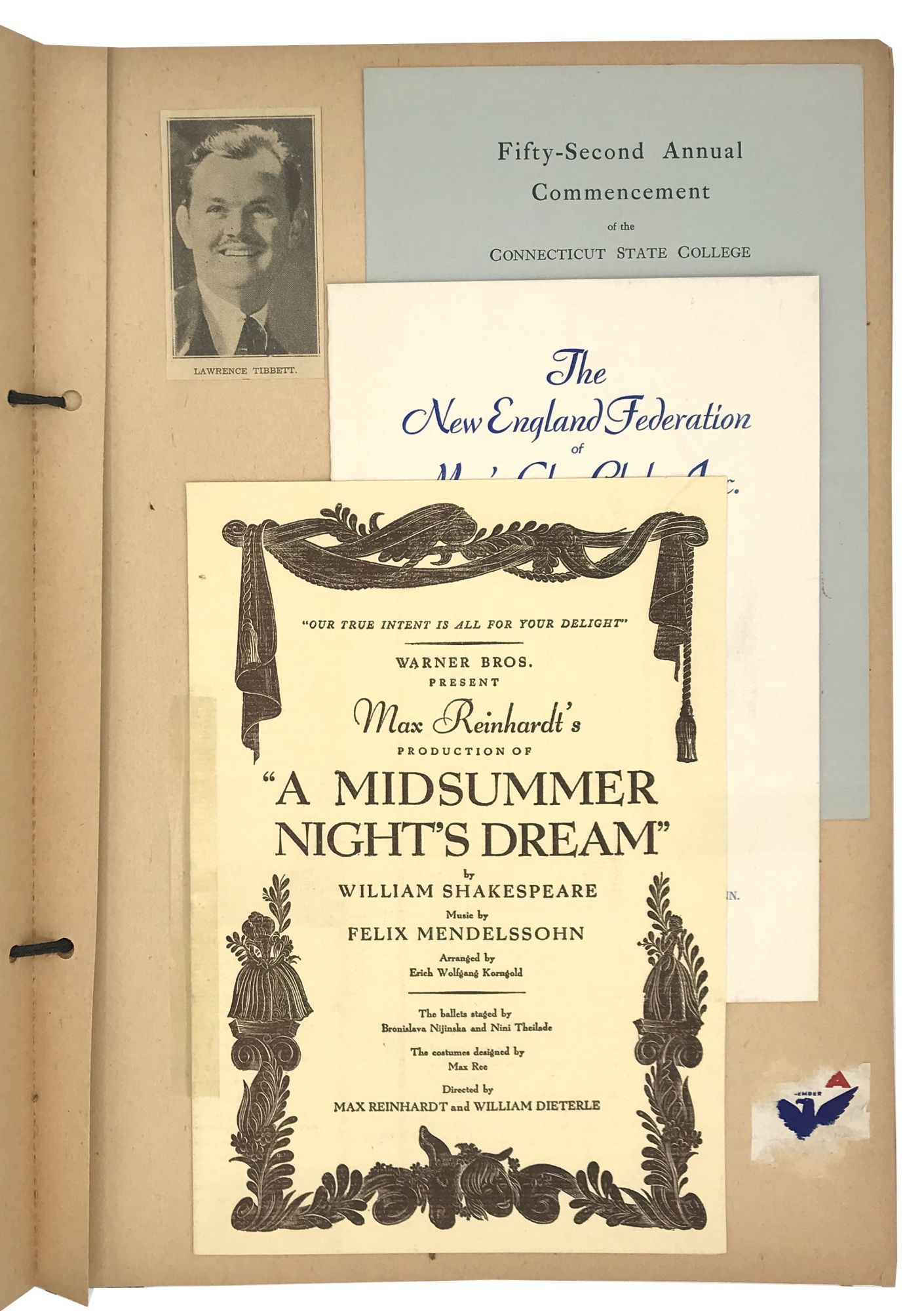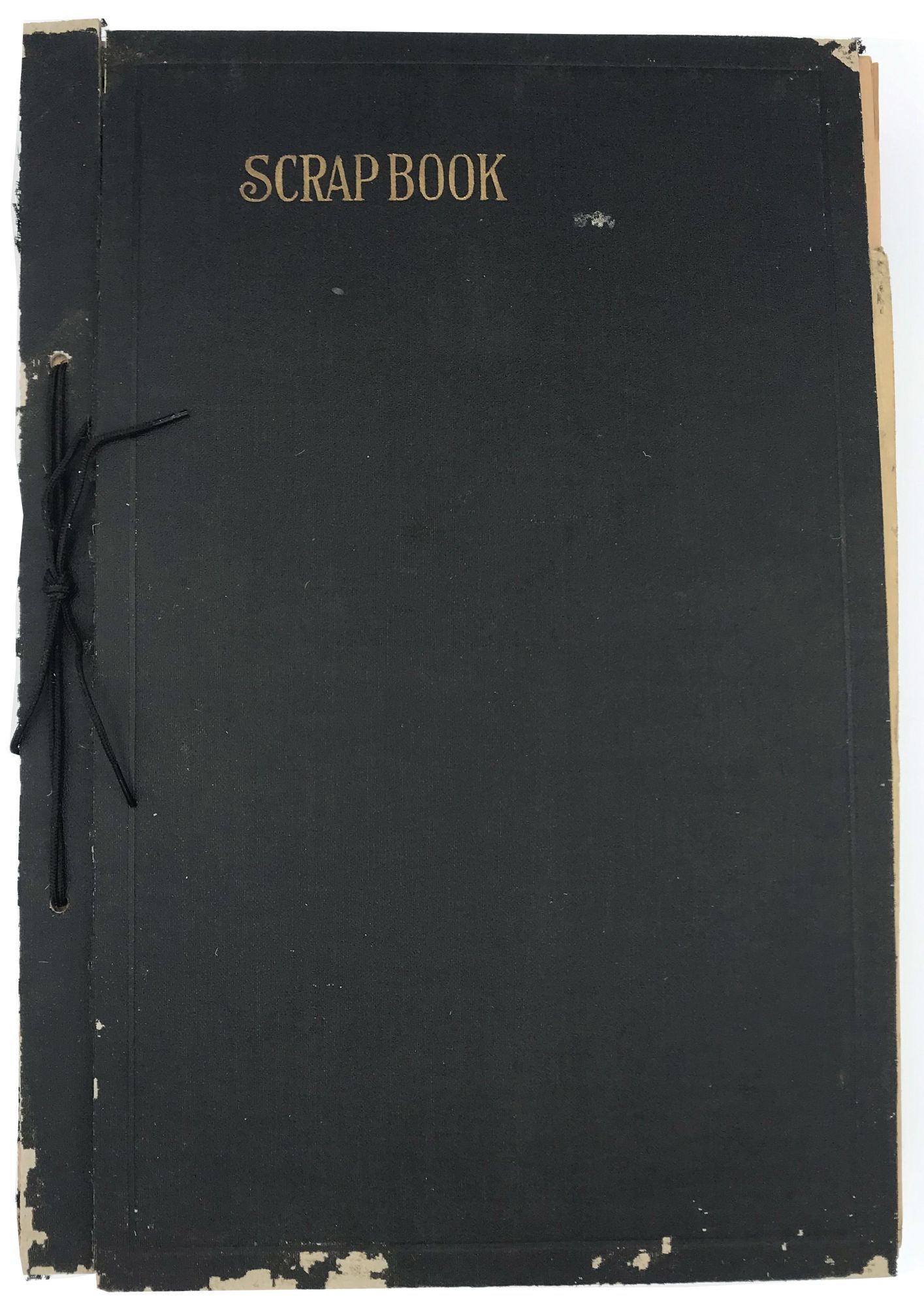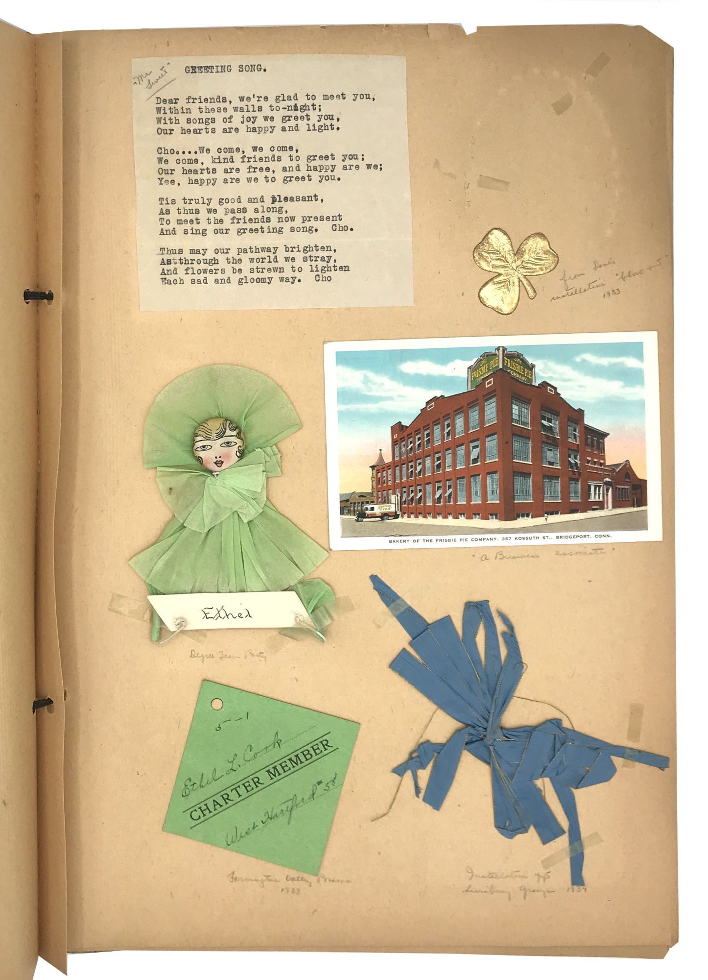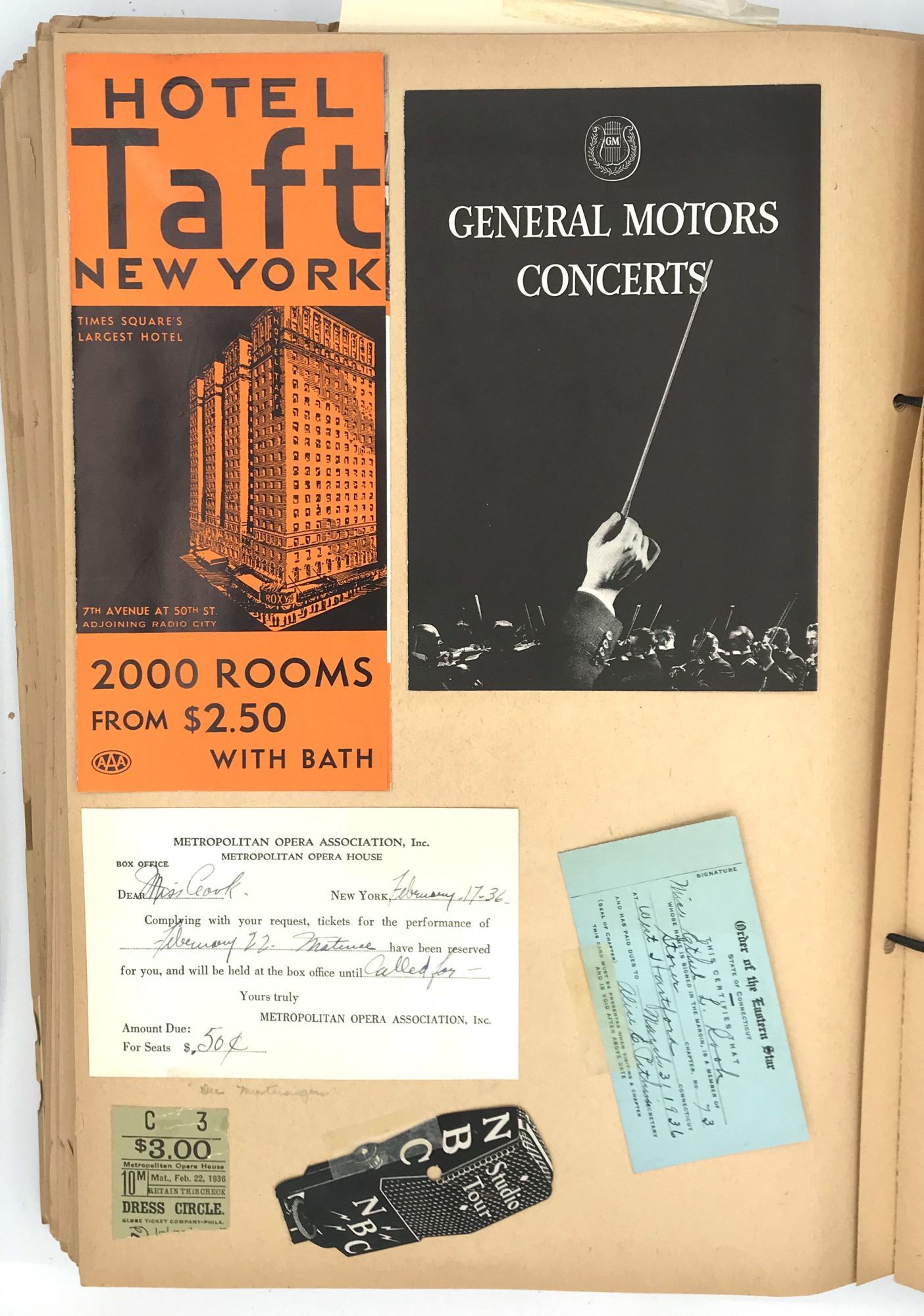 New London, Connecticut, 1937. Very good; some ephemera loose, scrapbook paper brittle, boards loose and worn.. An expansive scrapbook of over 200 individual pieces of ephemera collected by Ethel Cook (c.1908-2006) while she was a student in New London, Connecticut, in the late 1920s. Types of ephemera include periodical clippings, hotel stationary, printed programs and playbills, club meeting ephemera, song sheets, correspondence, ribbons and pins, a calendar, and even a signed postcard by Count Luckner. The majority of the ephemera memorializes Ethel's time at Connecticut College before she graduated in 1929, such as a large "Darwin Was Right" sign (which was used by the upperclassmen in a little light hazing), and programs from her time in the College's drama and debate clubs. Many concert programs and theatrical ephemera from New York, Boston, and Hartford are included. The Bushnell in Hartford is particularly well represented; it had just opened in 1930 when Ethel was assembling this scrapbook. An excellent representation of what arts and culture were available to a young Connecticut woman in the 1920s and 1930s.