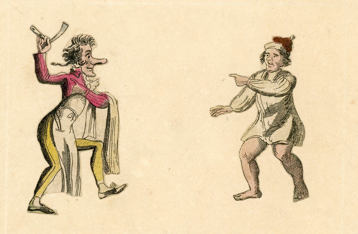 1830. letter folds.. Single page sheet with two cut-out and applied lithographs of gents; one appearing to be a barber. A rather odd accompaniment to the verse that reads: