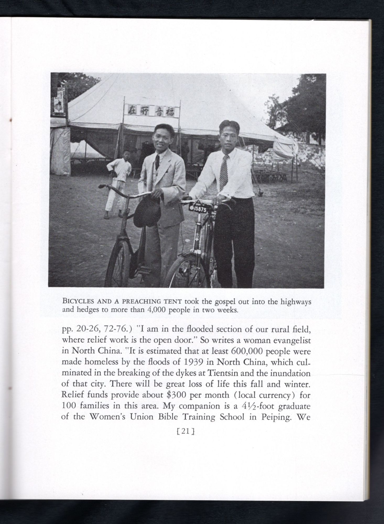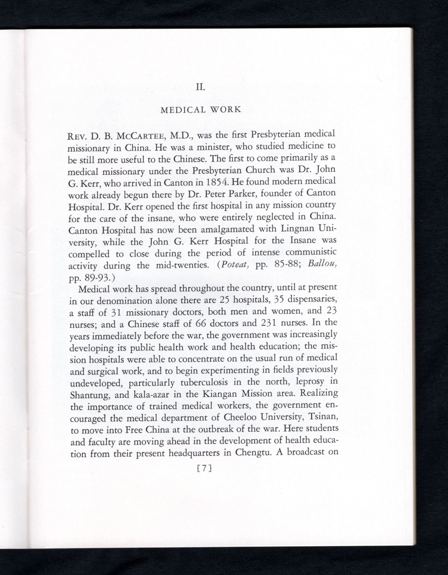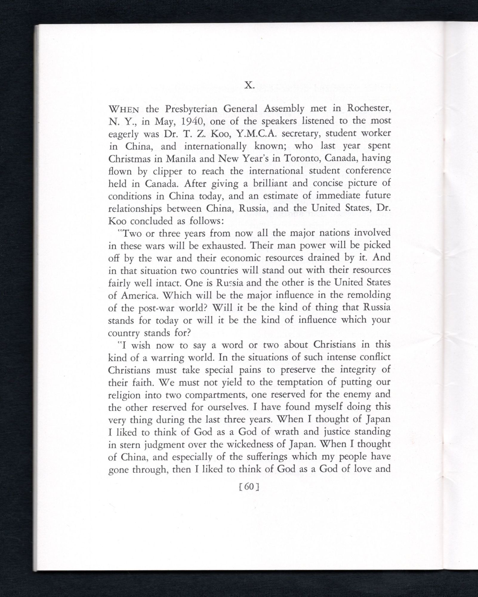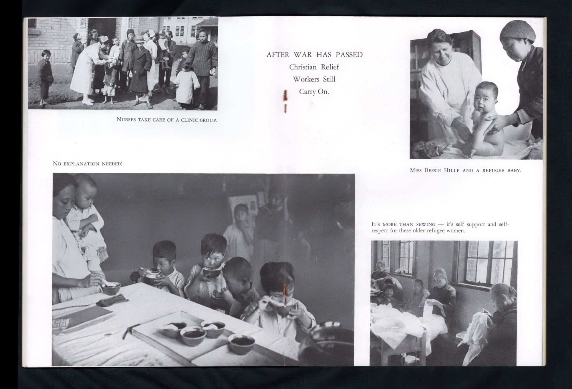 New York, NY: The Board of Foreign Missions of the Presbyterian Church in the United States of America, 1940. General wear. Rusted staples.. The booklet is a compilation of information provided by missionaries in China through letters, missionary reports, historical material, and missionary radio broadcasts. It has been divided up into ten sections: 'From Nestorians Until Today', 'Medical Work', 'Christian Education', 'Agricultural and Rural Evangelism', 'The Church of Christ in China', 'Migration', ' Refugee Schools', 'As War Goes On', 'The People Behind the Statistics', and an untitled last section which is a reprint of a speech given by Y.M.C.A. secretary Dr. T. Z. Koo at the 1940 Presbyterian General Assembly. The speech was designed to give "a brilliant and concise picture of conditions in China today, and an estimate of immediate future relationships between China, Russia, and the United States." As Japan invaded China in 1937 (though sometimes considered to be a part of WWII, it is also known as the Second Sino-Japanese War), the booklet often discusses the affect of that war on the current Chinese populations. Throughout the booklet are numerous printed black and white photographs of missionaries and the Chinese people receiving their services. 63 pgs. Yellow wrappers. Staple binding. OCLC 2 (March 2021). Measures 8" x 6