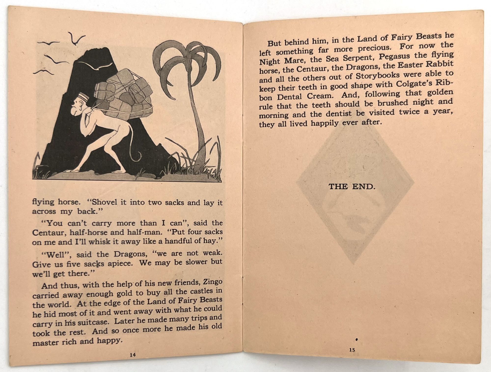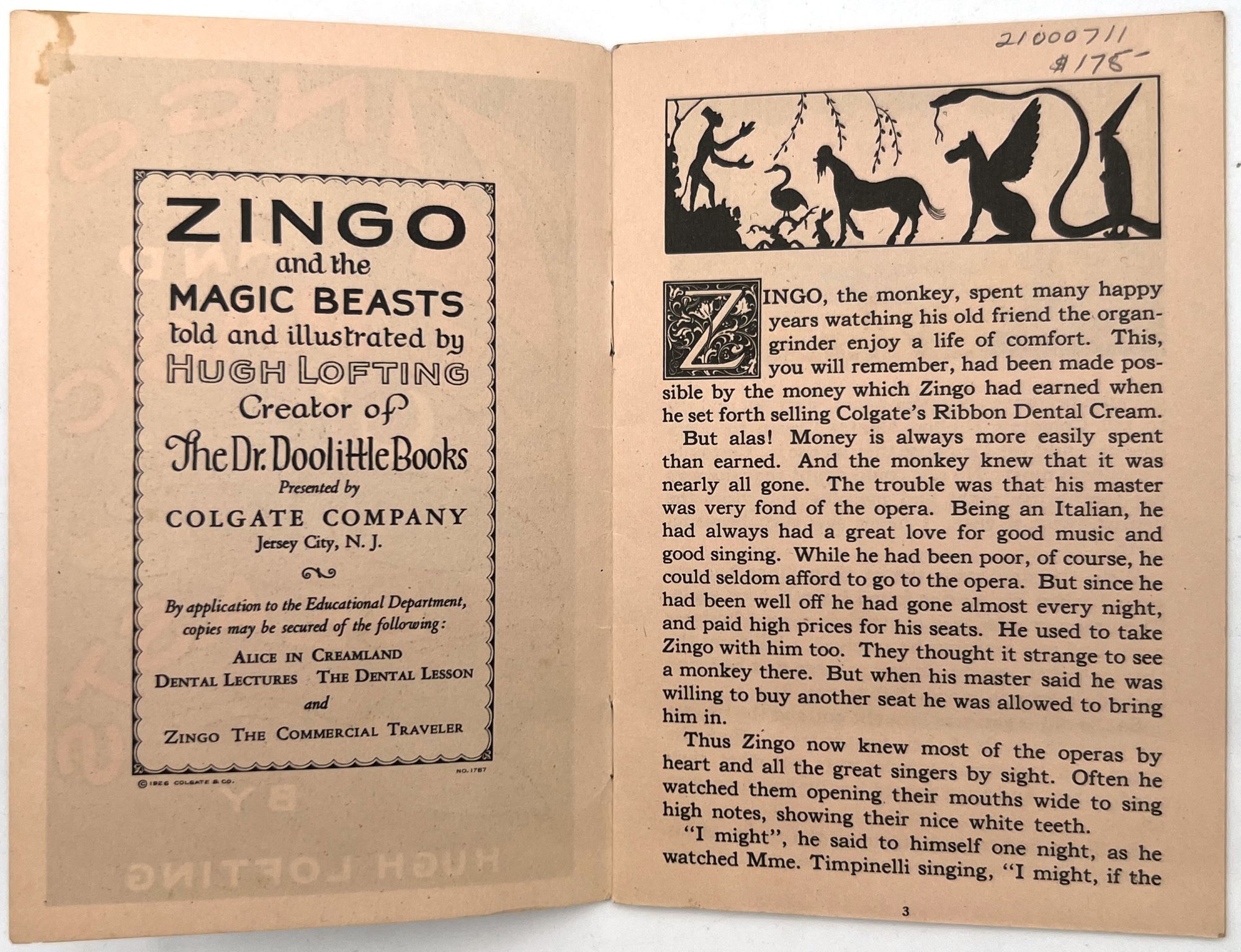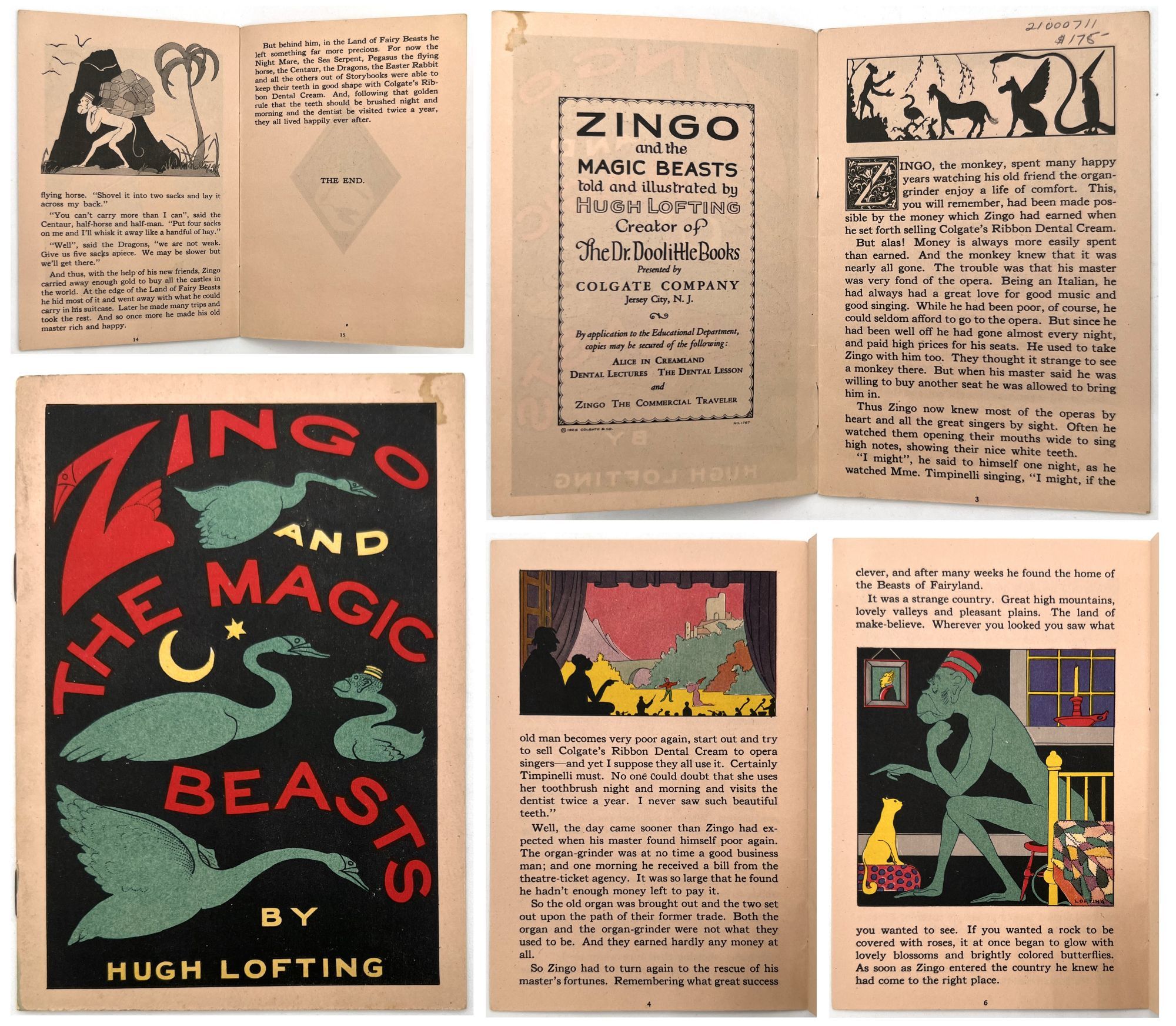 Jersey City, New Jersey: Colgate & Co, 1926. Fine to very fine.. One of several illustrated booklets about a cheeky monkey named Zingo, written and illustrated by Hugh Lofting, the creator of the Dr. Doolittle books for children. The tale advertises Colgate's tooth products. Lofting's colorful and distinctive illustration style is the undeniable highlight of the series. 12mo (5.75" by 4"), pp. [16], wrappers inclusive. Printed on green-tinted paper with in-text illustrations, and stapled in original illustrated wrappers.