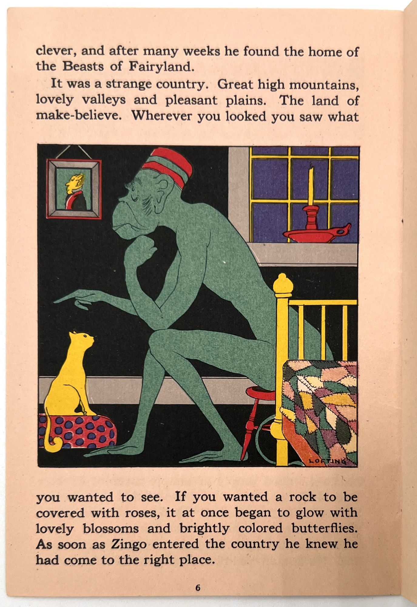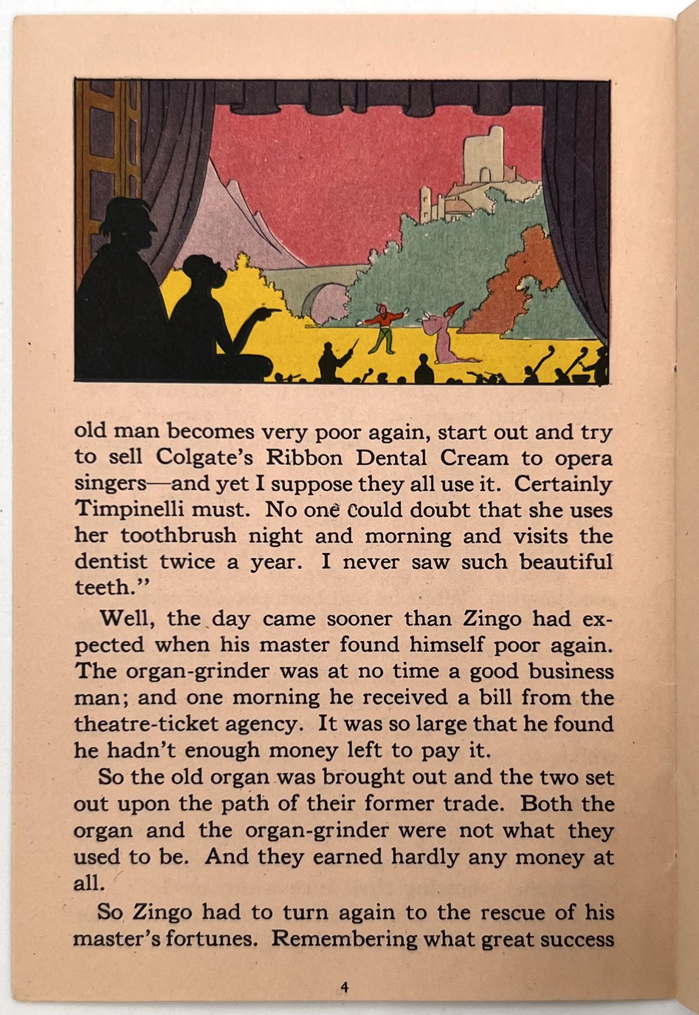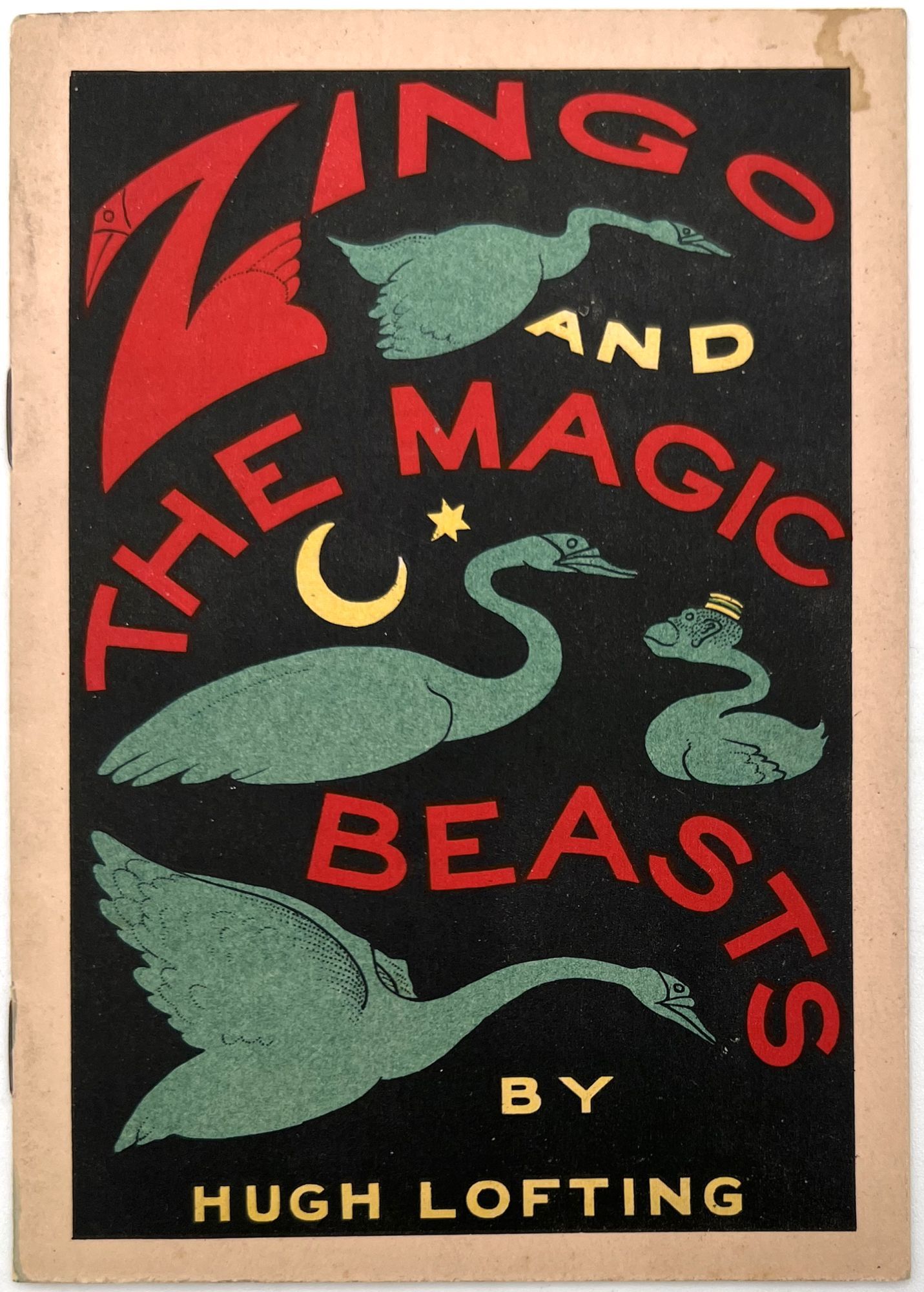 Jersey City, New Jersey: Colgate & Co, 1926. Fine to very fine.. One of several illustrated booklets about a cheeky monkey named Zingo, written and illustrated by Hugh Lofting, the creator of the Dr. Doolittle books for children. The tale advertises Colgate's tooth products. Lofting's colorful and distinctive illustration style is the undeniable highlight of the series. 12mo (5.75" by 4"), pp. [16], wrappers inclusive. Printed on green-tinted paper with in-text illustrations, and stapled in original illustrated wrappers.