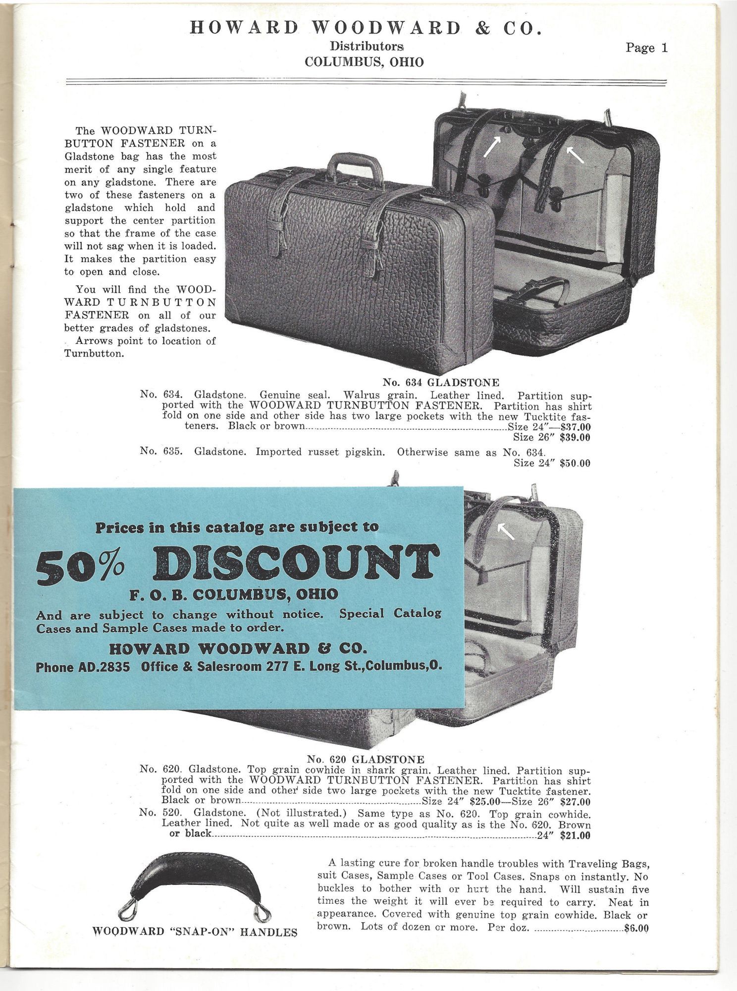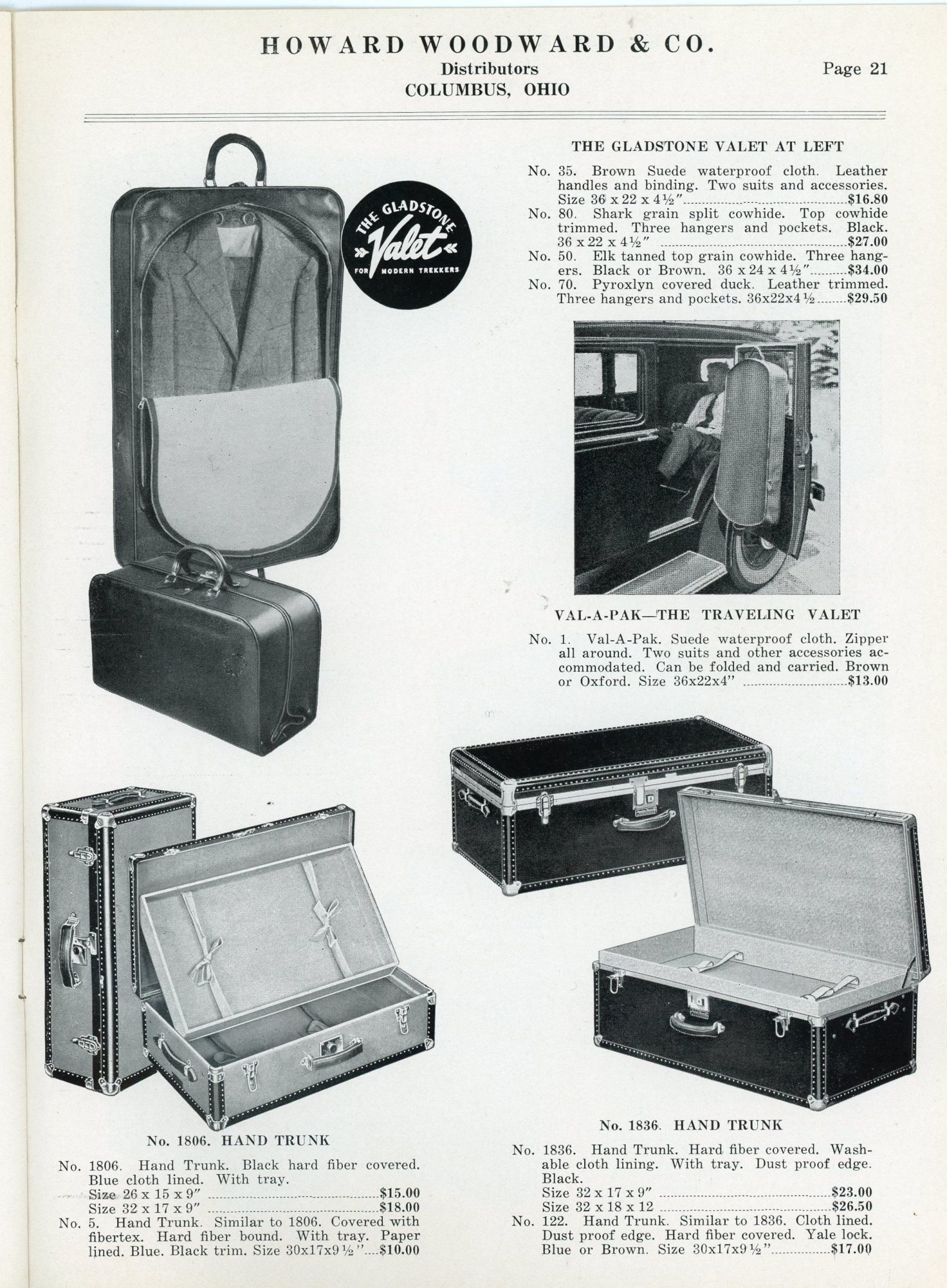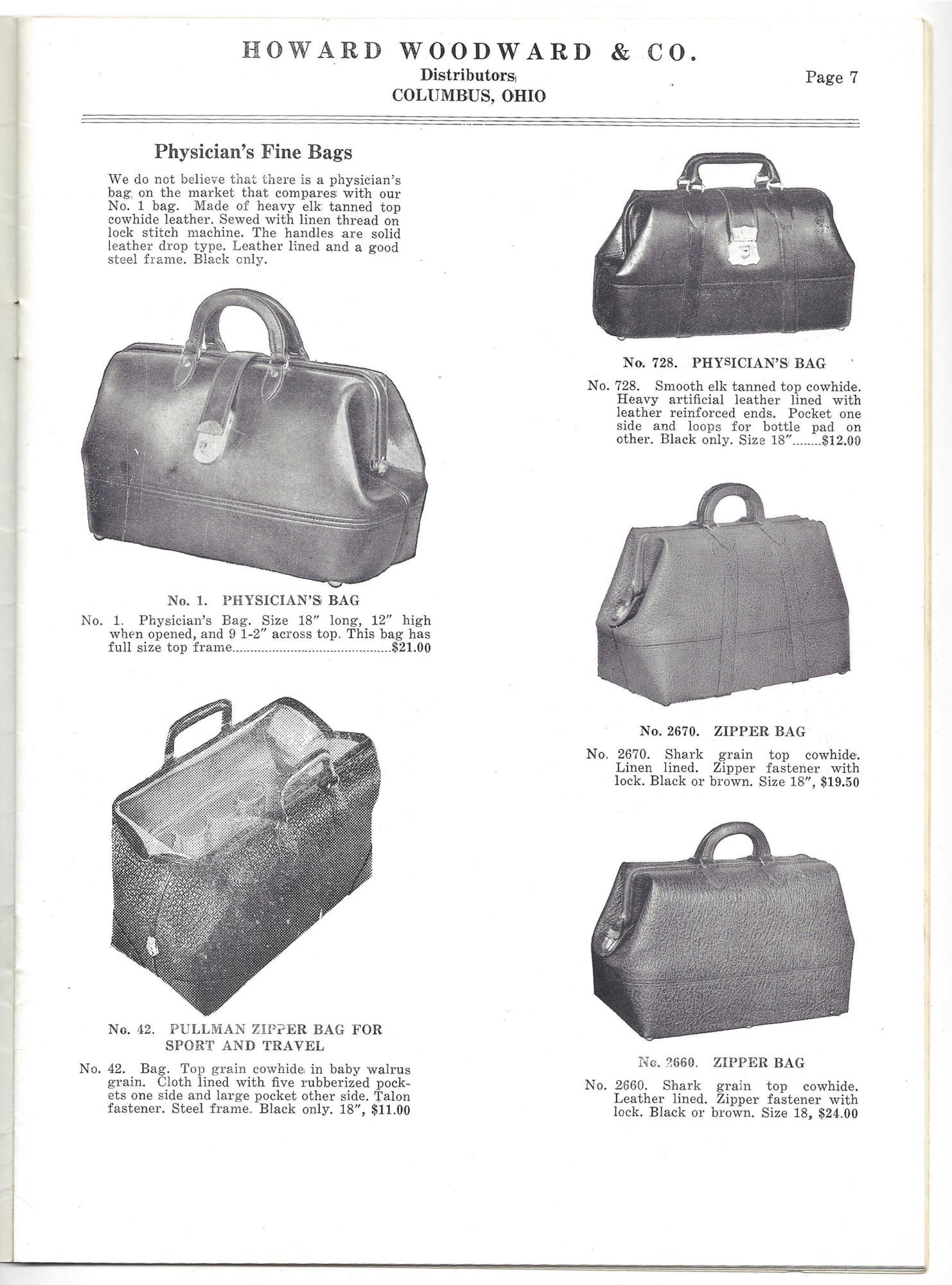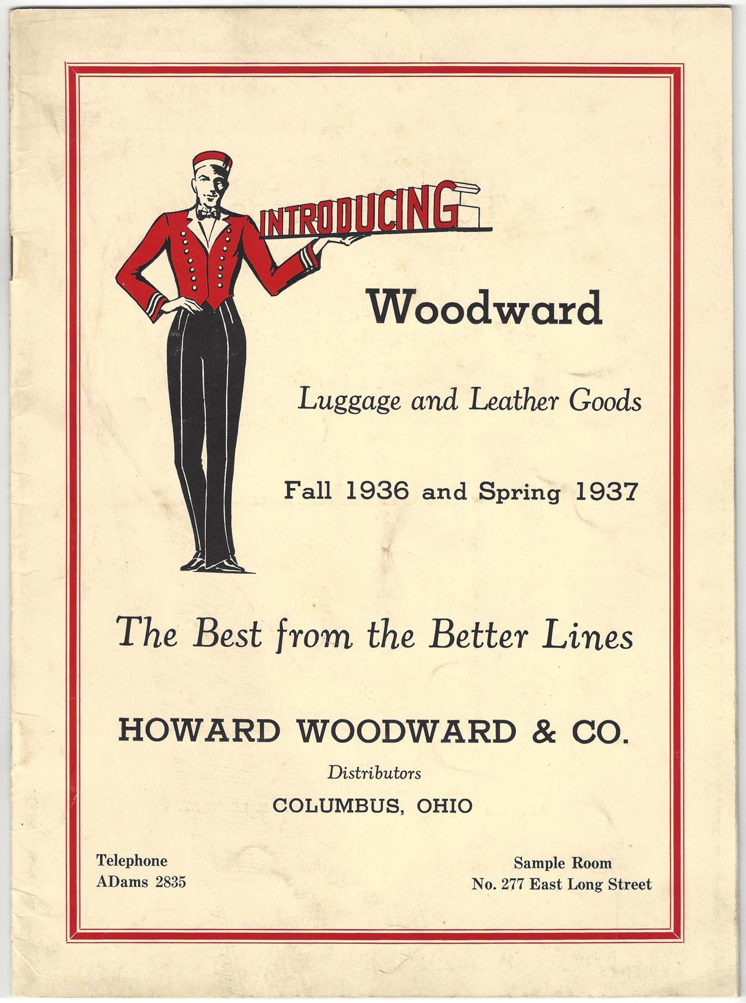 Columbus, Ohio: Howard Woodward & Co, 1936. Very good to fine; some light dust soiling.. Trade catalog for Howard Woodward & Co., makers of fine luggage and leather goods, advertising bags for travel and business. Of note are the "Physician's Fine Bags" (p. 7) and the "Ladies' Fine Wardrobe Cases" (p. 11); golf bags, traveling valets, and larger wardrobe trunks are also offered. Each product is photo-illustrated with a short description, dimensions, colors available, and pricing. Folio (10.5" by 7.75"), pp. 24 with in-text photo illustrations, stapled in original illustrated polished wrappers. Printed discount slip tipped in before page 1.