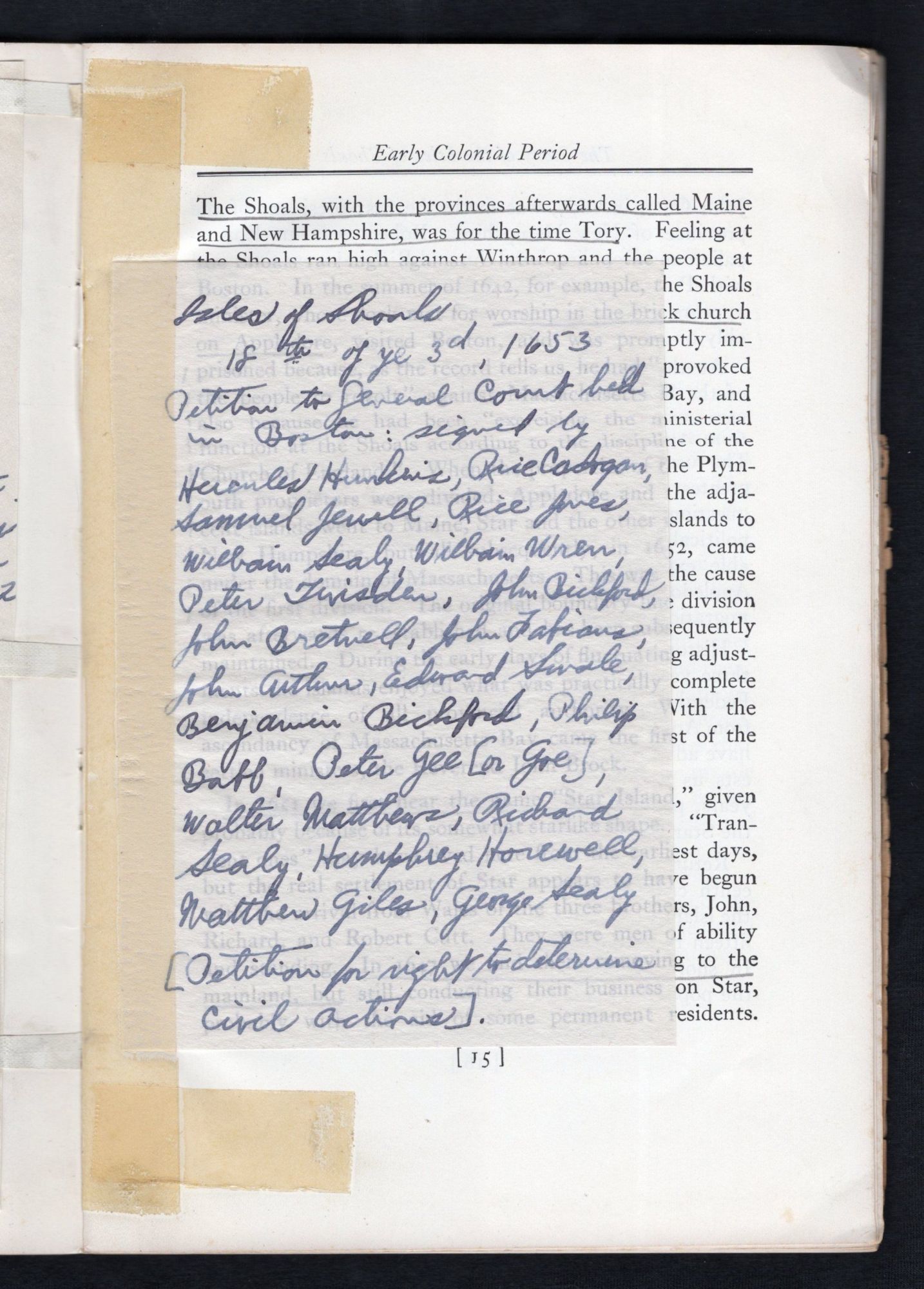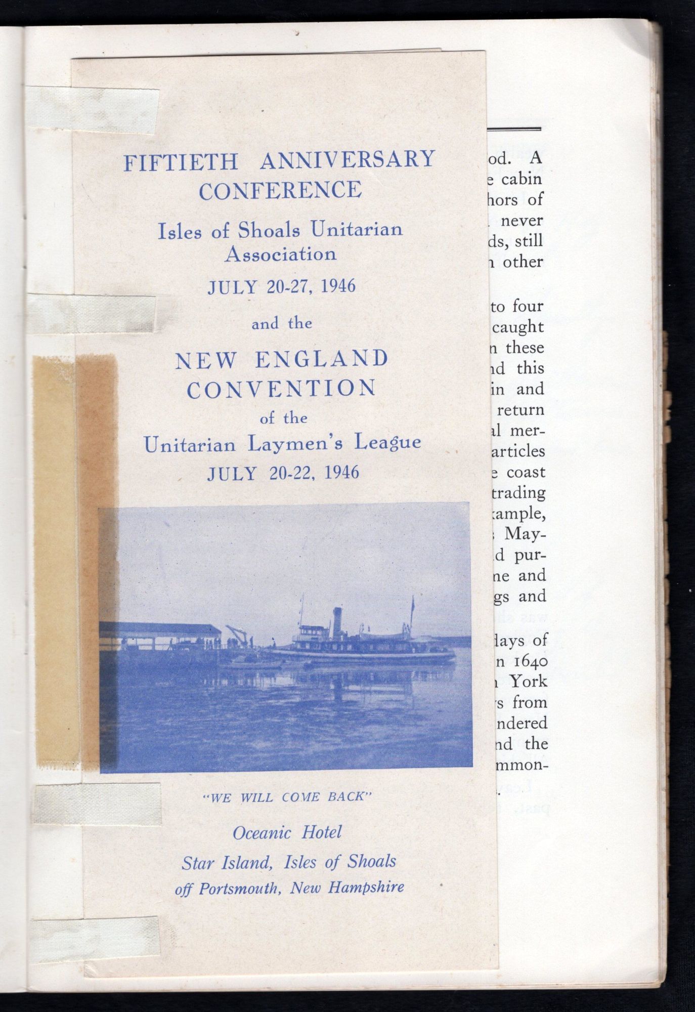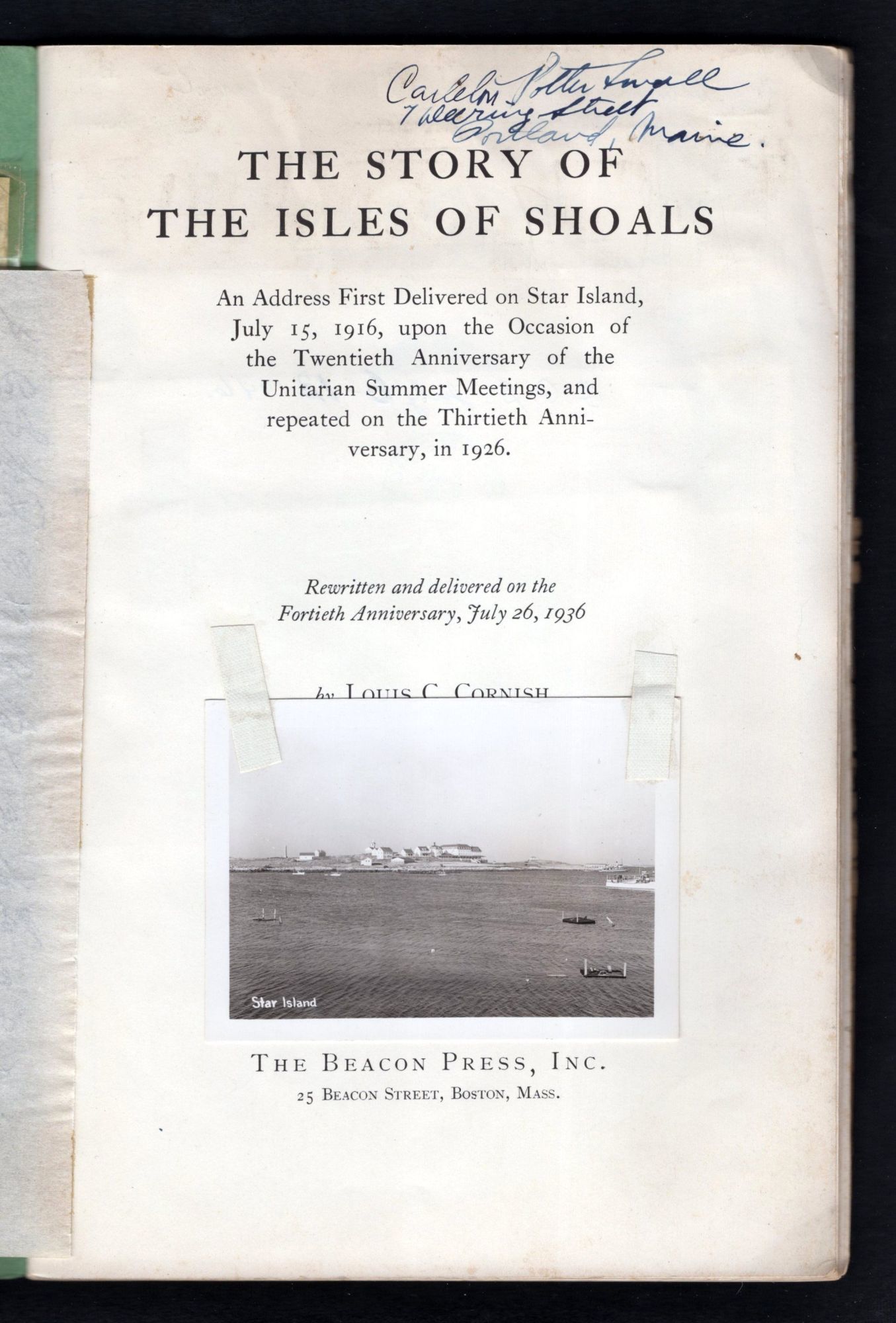 Boston, MA: Beacon Press, Inc, 1936. General wear. Tape used has yellowed. One item is detached, though it appears to have never been attached. A few interior pages are loose but still attached.. The scrapbook is actually a copy of "The Story of the Isles of Shoals : an address first delivered on Star Island, July 15, 1916, upon the occasion of the twentieth anniversary of the Unitarian summer meetings and repeated on the thirtieth anniversary in 1926 ; rewritten and delivered on the fortieth anniversary, July 26, 1936", that Carleton P. Small has filled with all of his mementos relating to Star Island, NH. Star Island is a part of the group of islands known as the Isles of Shoals located along the coast between Maine and New Hampshire. The book "The Story of the Isle of Shoals" provides a history of the island dating back to its settling in the early 17th century by fisherman. Small uses this book as scrapbook by taping in a variety of pieces of ephemera, photographs, newspaper clippings, and postcards. All of these items were taped into the book so that they could be flipped upwards and one could still read the text beneath. It is unclear if Small himself ever actually traveled to Star Island or was just researching the history of it. However, his mother, Grace, appears to have spent time there in July 1946, and sent him some postcards, as such she could have provided him with some of the photographs and other ephemera. What is clear is that Small was extremely interested in history, and the island's history in particular. There are numerous hand written notes regarding the history of the island, particularly individual settlers. These notes are sometimes written directly on the page, however more often are taped in on separate pages. Some of his notes appear to be copies from historical primary sources are seem to be quotes either from financial transactions or letters/diaries. All total the scrap book includes: thirteen (13) photographs (3 are printed photographs), six (6) postcards of which three (3) are used and sent to Small by his mother, nine (9) handwritten historical notes, and nine (9) pieces of ephemera relating to Star Island. Some examples of the ephemera are: a hand drawn map of the Isle of Shoals, the brochure for the General Alliance Week July 19 - 29, 1941 at Star Island, a 1946 Consolidated Scheduled Boston to Gosport Ferry, the brochure & application for The All Stare Conference for All the Family June 29 to July 6, 1946, the brochure & application for the Fiftieth Anniversary Conference Isles of Shoals Unitarian Association July 20-27, and a 1944 newspaper clipping entitled "Death Stalks the Isle of Shoals" about several ax murders that occurred in 1872 there. 47 pgs. Green printed wrappers. OCLC 9 (Jan. 2020). Scrapbook - unique. Approximately thirty-seven (37) pieces added with additionally annotations throughout. Measures 9" x 6"