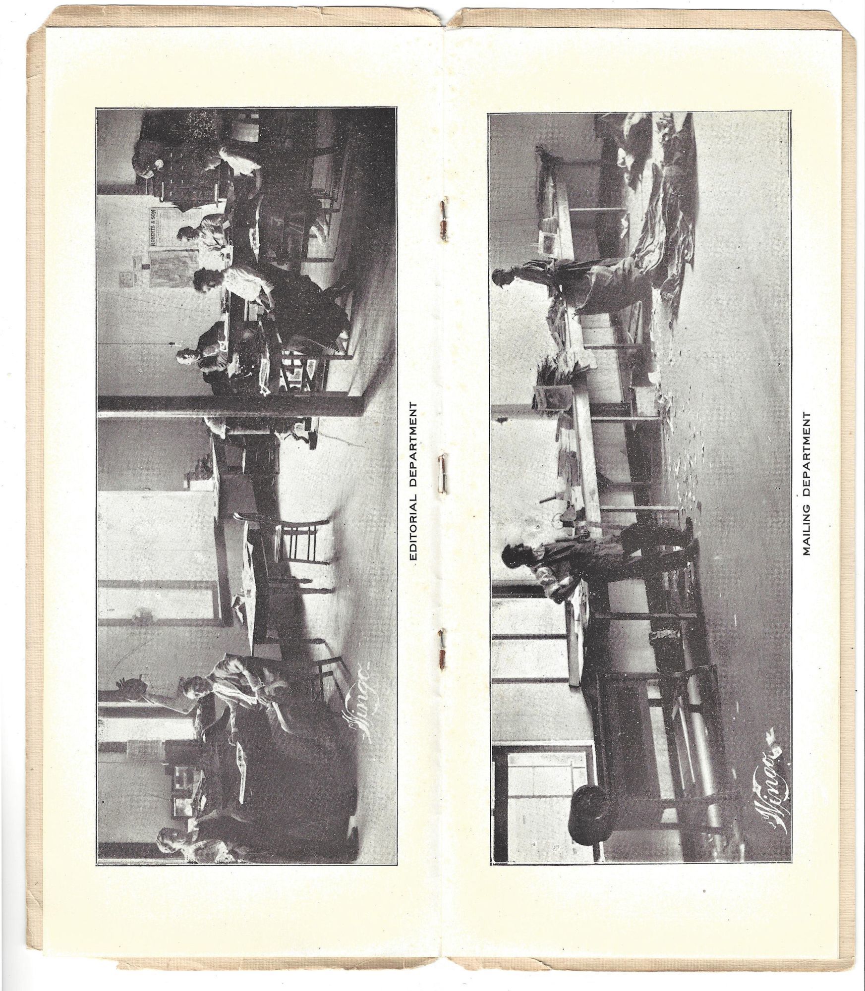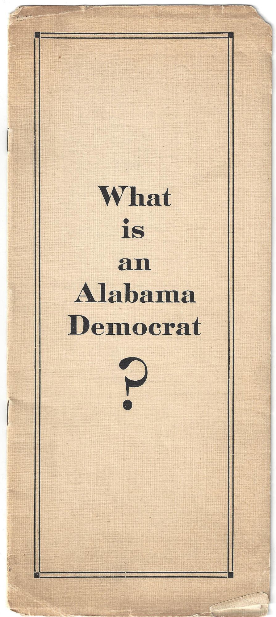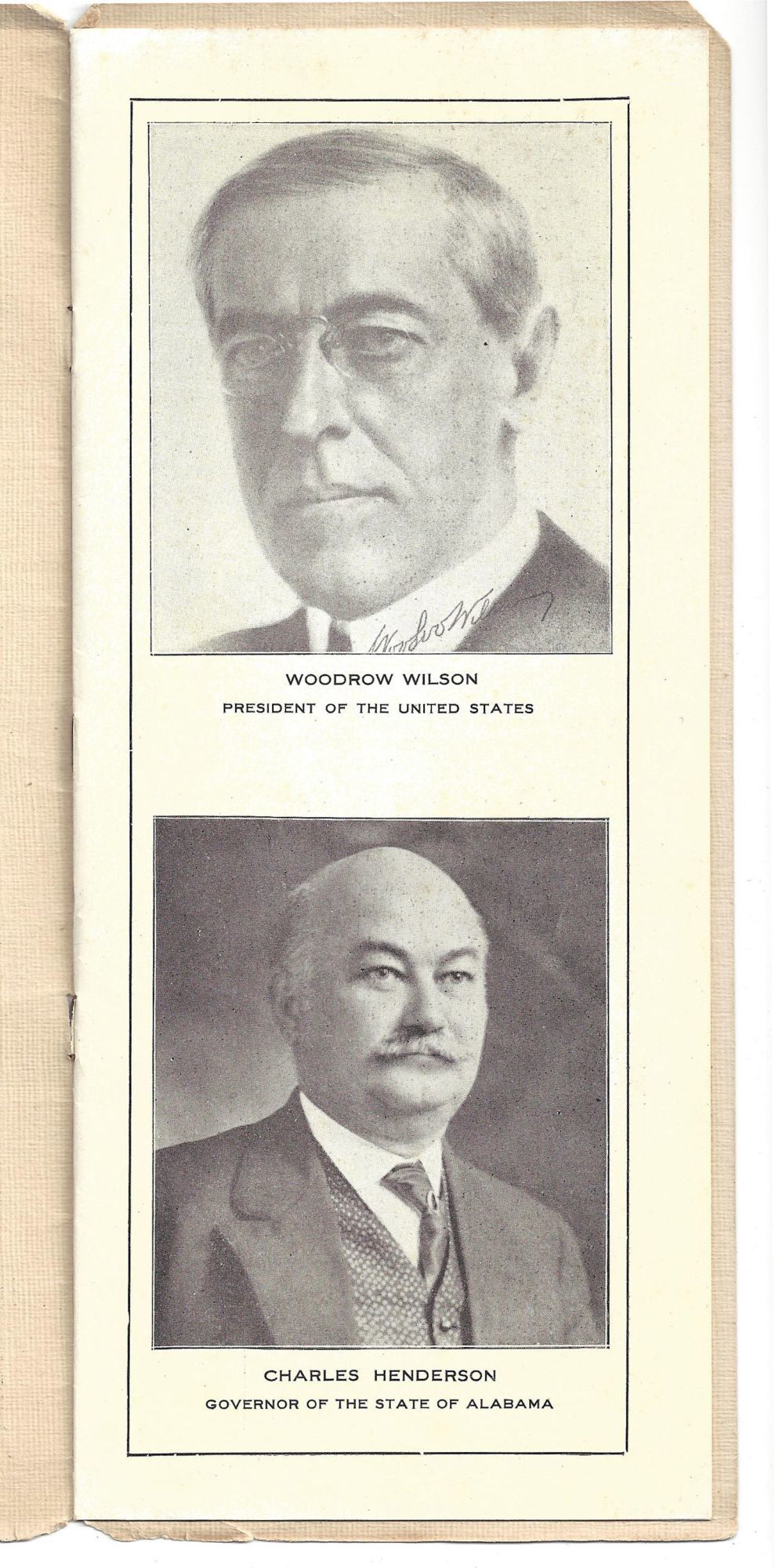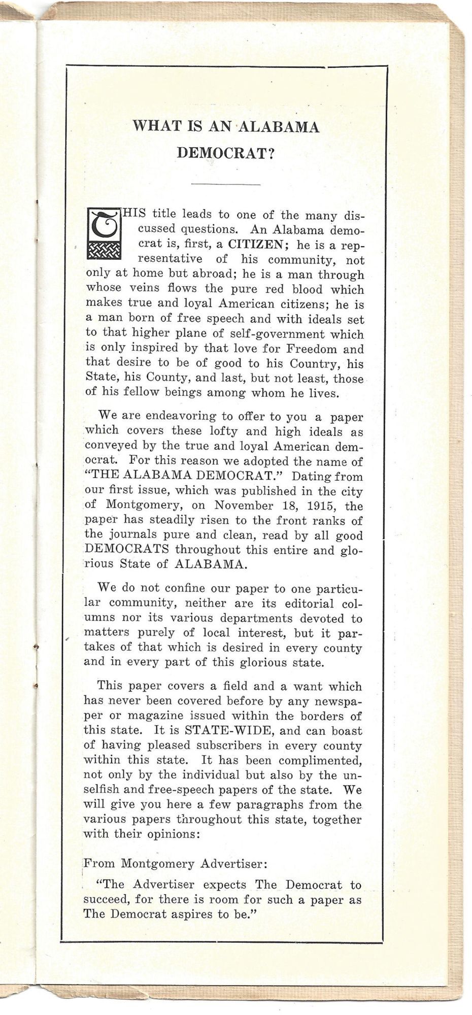 The Alabama Democrat Company, 1915. Fine to very fine. Some light wear to extremities, finger soiling to lower wrapper.. A photo-illustrated advertising circular for the periodical "The Alabama Democrat", first published in 1915. It begins by defining the term "Alabama Democrat" as "a man through whose veins flows the pure red blood which makes true and loyal American citizens; he is a man born of free speech and with ideals set to that higher plane of self-government" (p. [3]), and goes on to provide glowing reviews from its peer publications, as well as a list of officers and directors. In lieu of a title-page, it opts for portraits of President Woodrow Wilson and Charles Henderson, then governor of the State of Alabama; photos of the editorial and mailing departments are also included.