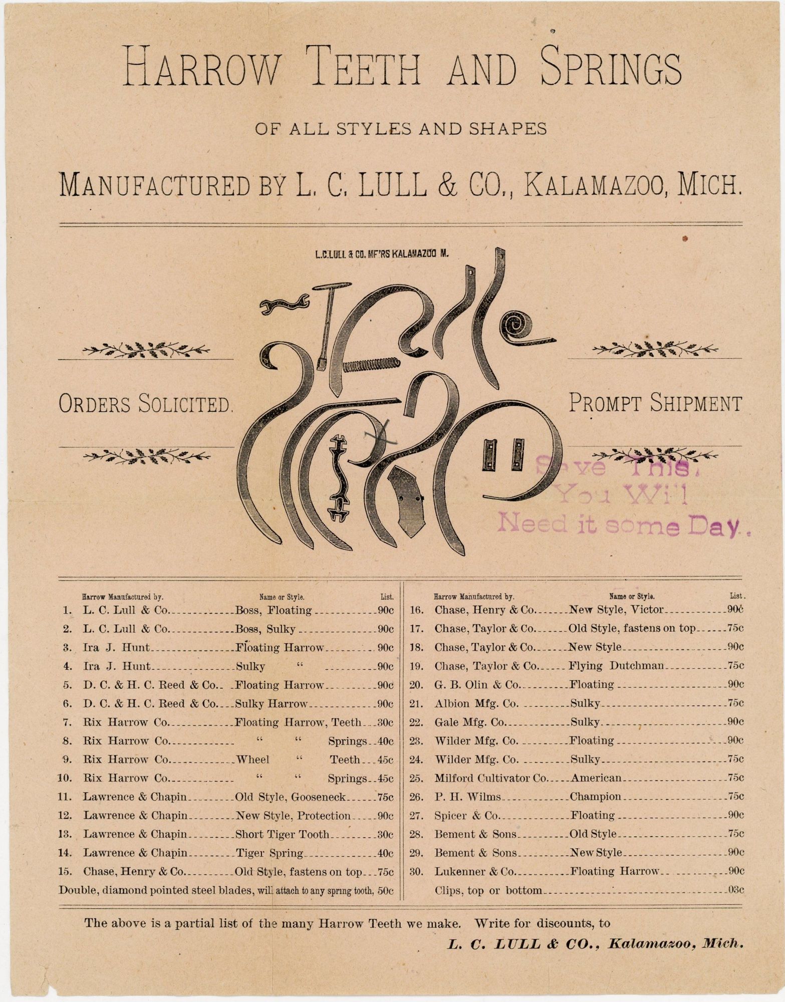Kalamazoo, Michigan, 1880. Very good; some toning, creased where previously folded. 2-3 short tears, touching text but not obscuring meaning. Ink stamp to recto "Save This, You Will Need it some Day.. Illustrated price list advertising flyer for Harrow Teeth and Springs, manufactured by L.C. Lull & Co. of Kalamazoo, Michigan. Includes a partial list of inventory with prices. Depicts an array of harrow teeth and springs and a price list by manufacturer and style, prices included.
