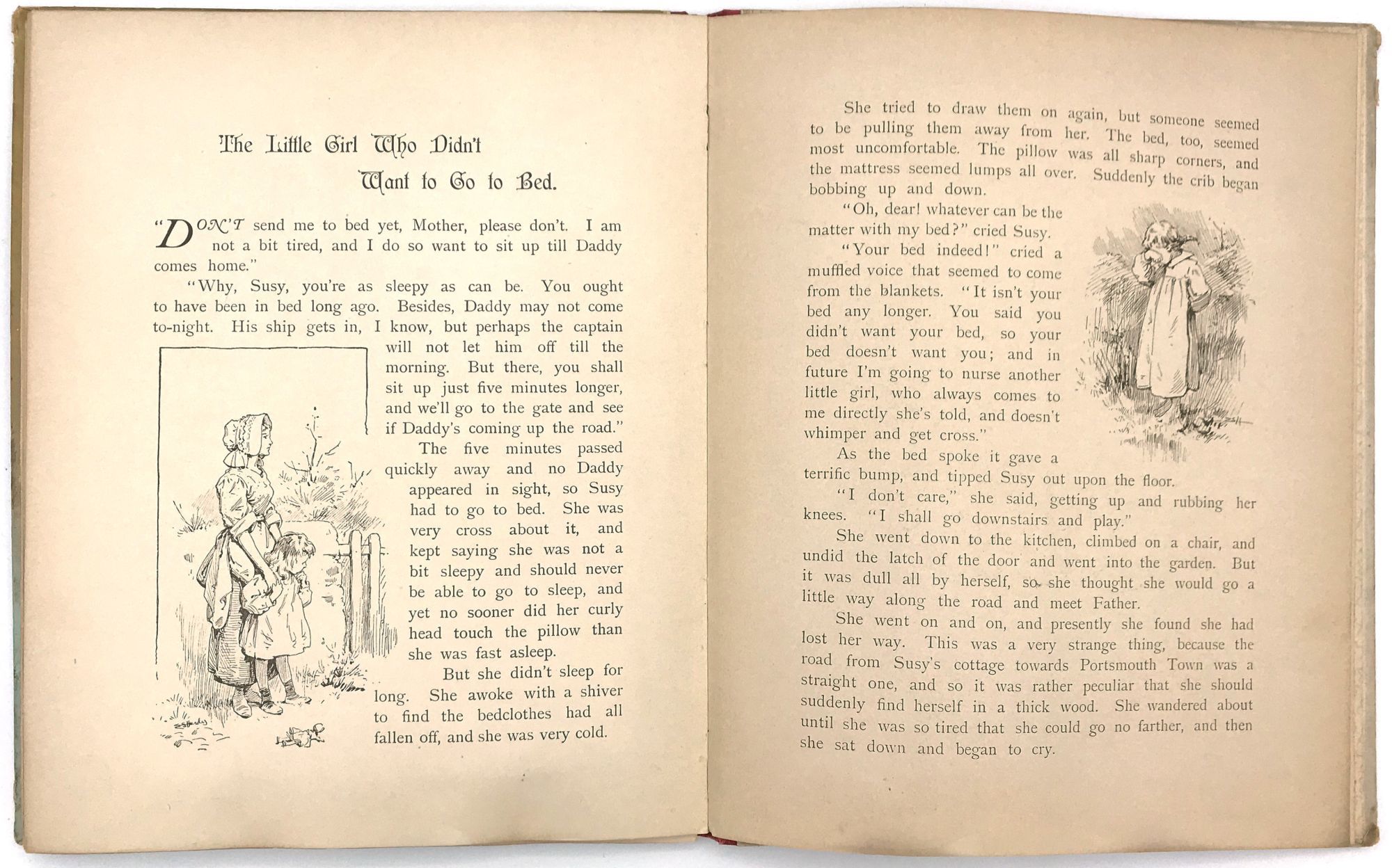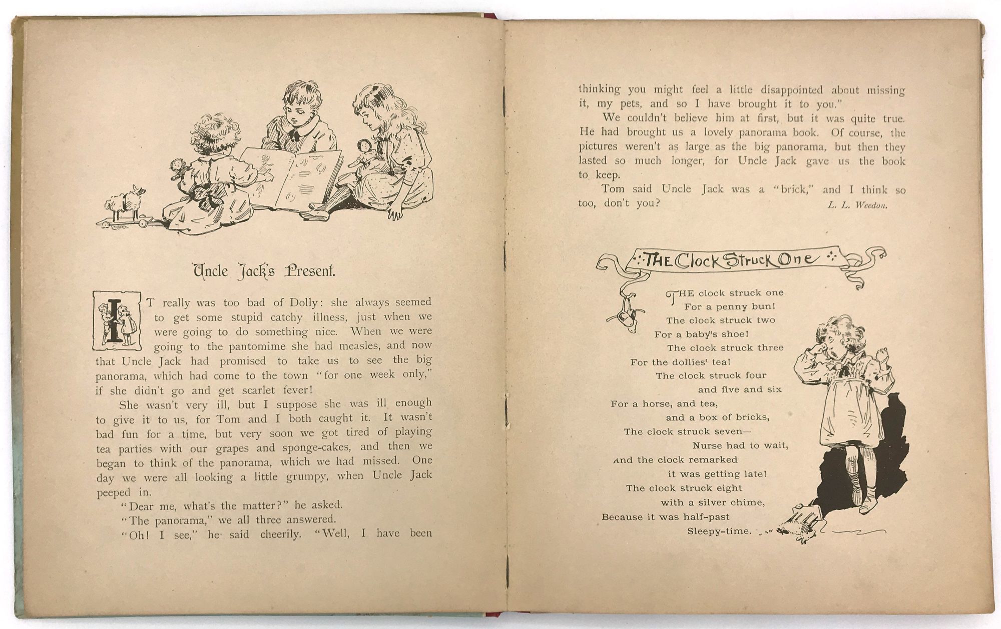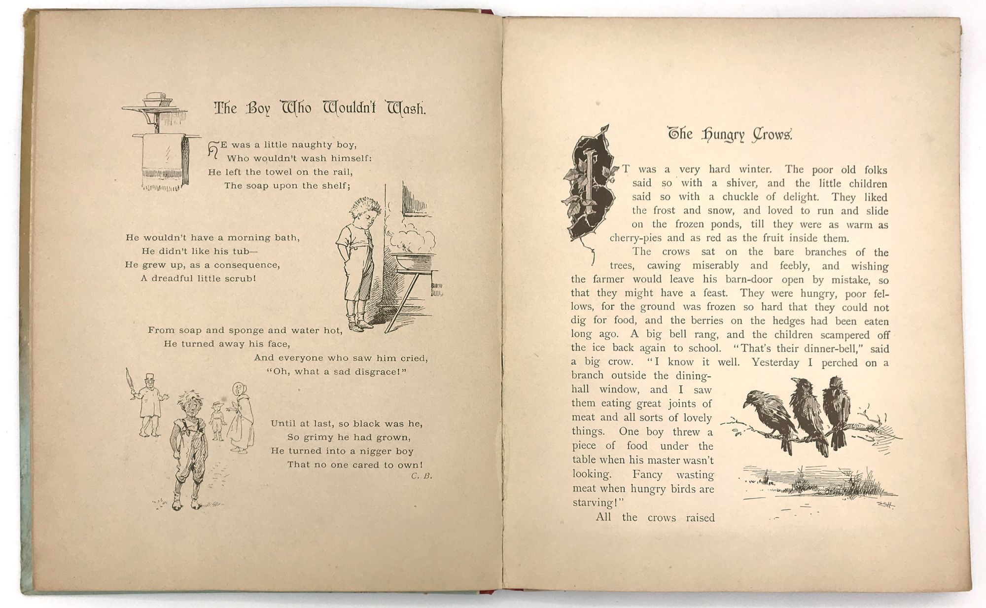 London and New York: Ernest Nister and E.P. Dutton & Co. Fine; extremities rubbed, central pop-up detached from spine.. A charming illustrated children's book of poetry and prose with four (4) two-page pop-up spreads depicting: a farmer and son plowing a field with horses; a sleeping child among a gentle flock of sheep and lambs; four children playing with toys in a living room; and another group of six children playing in boats and feeding swans, ducks, and their little ducklings. There are fourteen different short rhymes and stories, including "The Boy Who Wouldn't Wash", "The Little Fish and the Oyster", and "The Sand Castle". 4to (9.75" by 8"), pp. 28, with in-text illustrations and 4 full-spread pop-up scenes. Bound in original illustrated chromolithographed boards with patterned endpapers, red cloth spine.