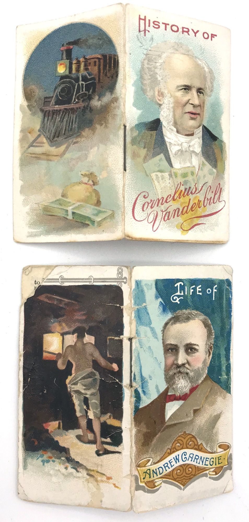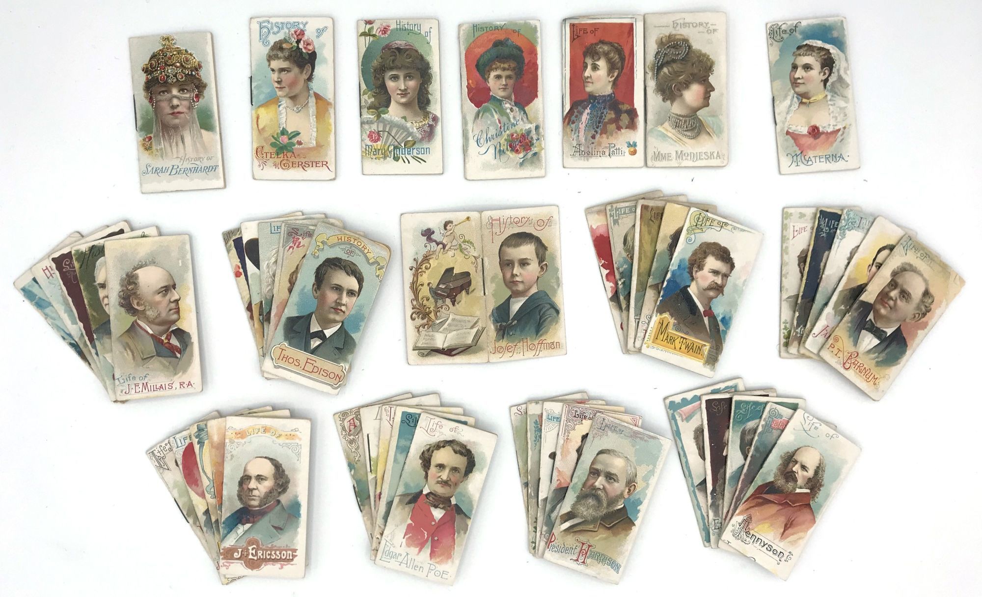 Park Place, New York: Knapp & Company, 1890. Fine. Some lightly rubbed.. A complete set of 48 absolutely charming miniature chromolithographed biographies, published as part of an advertising campaign for Duke Brand Cigarettes. Each was issued in a box of cigarettes in a "collect-them-all"-type marketing ploy. The complete set here includes 7 women and 41 men. Each measures approx. 3" by 1.5", is approx. 16 pp., and stapled in original chromolithographed illustrated wrappers. The wrappers are particularly well-designed, and feature a portrait of the subject on the upper wrapper, and an allegorical/metaphorical illustration on the lower wrapper that matches that figure's accomplishments. For example, industrialist Andrew Carnegie has a coal worker shoveling coal on his lower wrapper, while Edgar Allan Poe has a raven perched atop a pile of books on his lower wrapper. Explorer and hunter Henry M. Stanley has an African woman's bust inside a map of Africa on his lower wrapper. Other prominent figures run the gamut from actors (Edwin Booth, Sarah Bernhardt), to writers and poets (Tennyson, Irving), to businessmen (Vanderbilt), engineers and inventors (James B. Eads, Mary Anderson), and politicians (William Henry Harrison). There is even one child, the musical prodigy Josef Hoffman.