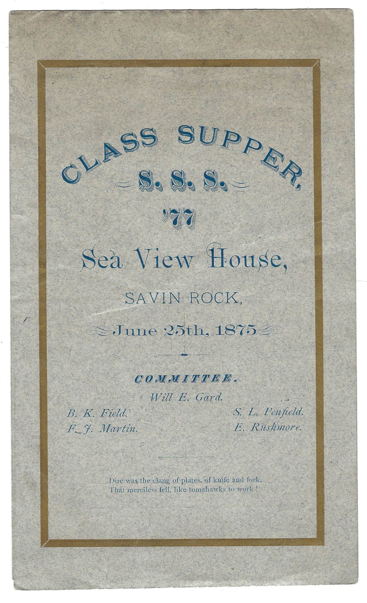 [West Haven, Connecticut]: Yale Class of 1877, 1875. Fine. Traces of previous adhesive to verso.. Original printed program and bill of fare for the Yale Class of 1877 Supper held in 1875 at the Sea View House in West Haven, Connecticut. Includes the evening's Bill of Fare as well as a program with a list of toasts and speakers. A number of witty lines are quoted, such as this one on the cover: "Dire was the clang of plates, of knife and fork, That merciless fell, like tomahawks to work!" (recto).