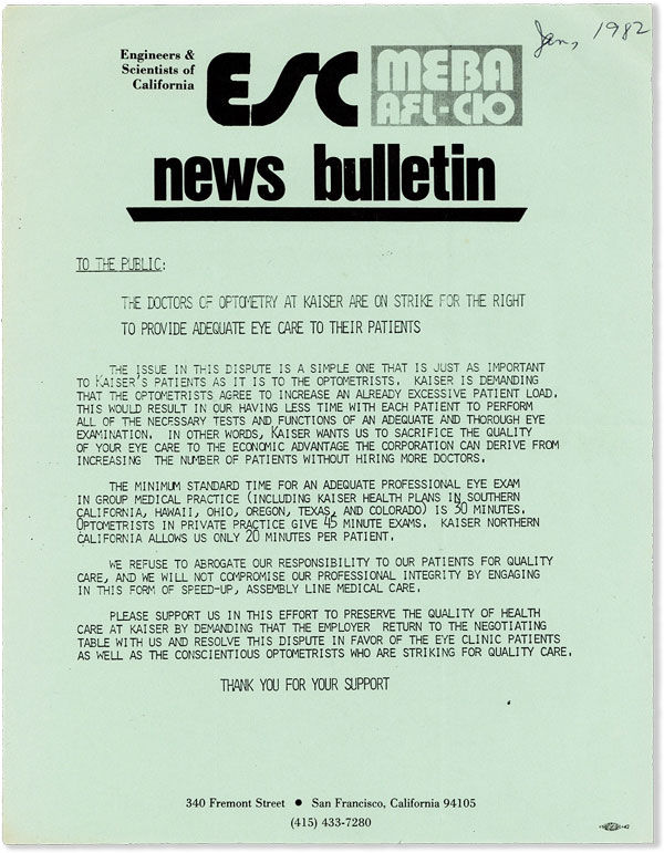 Announces a strike by the Optometrists of Kaiser Health, complaining of unmanageable patient loads and reductions in time allowed for patient visits. Issued under the auspices of Engineers & Scientists of California and the Marine Engineers Beneficial Association (MEBA).