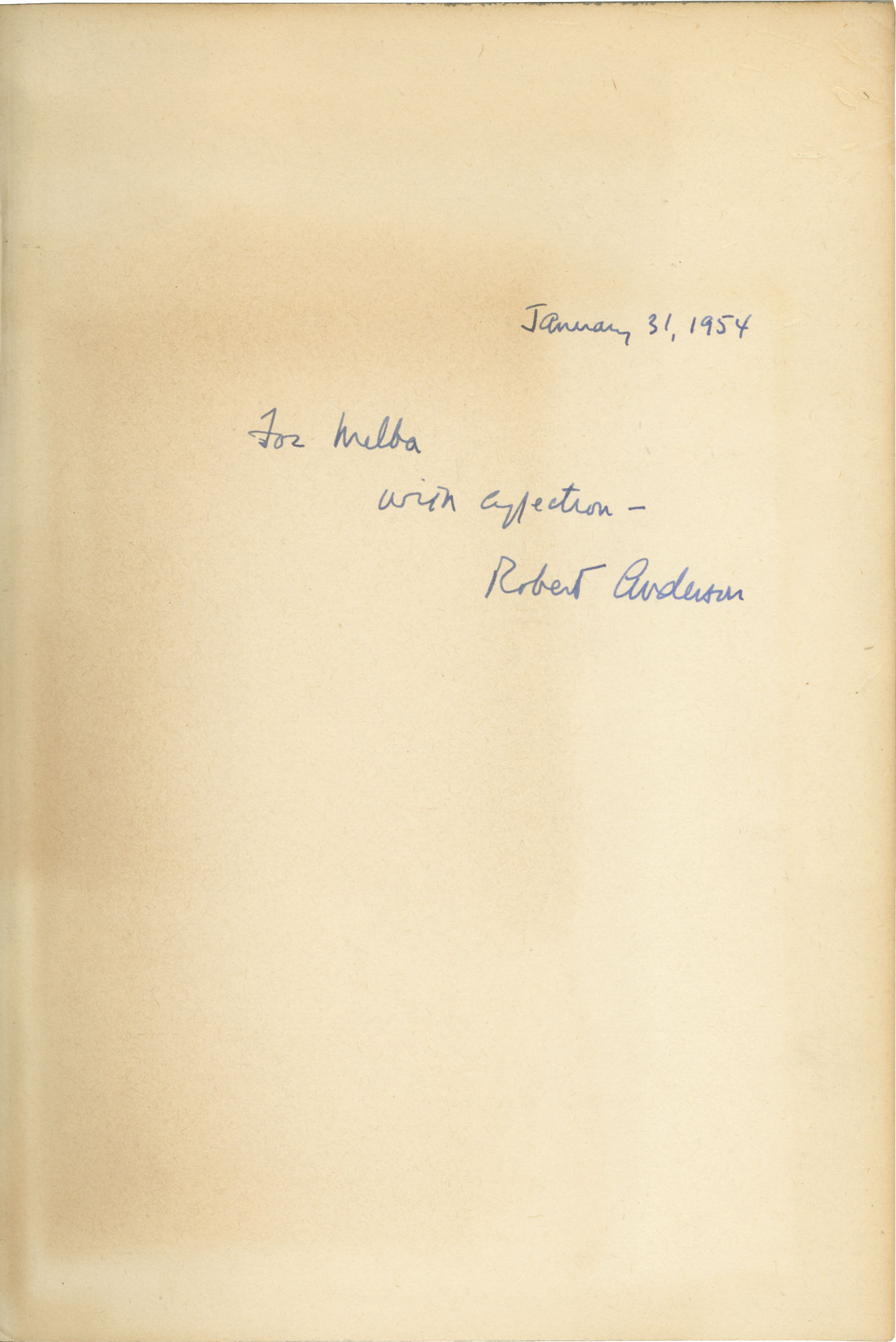 New York: Random House, 1953. First Edition. First Edition. INSCRIBED by the author on the front endpaper: "January 31, 1954 / For Melba / with affection— / Robert Anderson." Laid in is a photograph showing four people sitting at a table, the youngest presumably being Anderson, with an annotation on the verso (not in Anderson's hand), reading "Labor Day / 9/13/38."