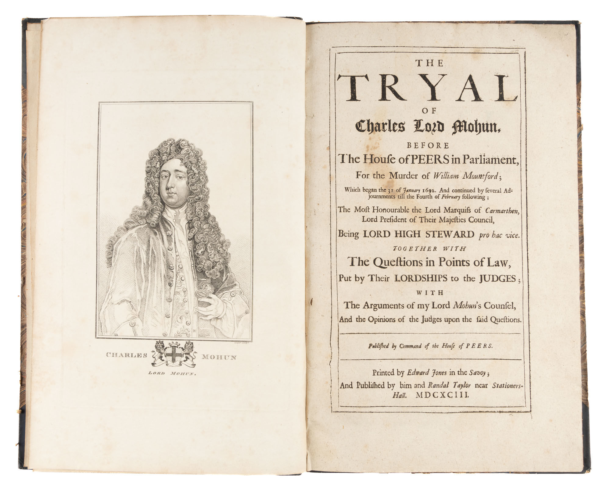 1693. The Controversial Acquittal of a Notorious Duelist and Rake [Trial]. Mohun, Charles, 4th Baron [c.1675-1712], Defendant. The Tryal of Charles Lord Mohun, Before the House of Peers in Parliament, For the Murder of William Mountford; Which Began the 31 of January 1692. And Continued by Several Adjournments till the Fourth of February Following; The Most Honourable the Lord Marquiss of Carmathen, Lord President of Their Majesties Council, Being Lord High Steward Pro Hac Vice. Together with the Questions in Points of Law, Put by their Lordships to the Judges; With the Arguments of My Lord Mohun's Counsel, And the Opinions of the Judges upon the Said Questions. Published by Command of the House of Peers. [London]: Printed by Edward Jones and published by him and Randal Taylor, 1693. 28, 33-64 pp. Complete. With an initial imprimatur leaf and added portrait frontispiece of Mohun. Folio (13" x 8"). Stab-stitched pamphlet bound in later three-quarter calf over marbled boards, blind rules to calf edges, gilt title to spine. Light rubbing, a few small scuffs and later small paper shelf labels to boards, moderate rubbing to extremities, light wear to spine ends, joints just starting at head, corners lightly bumped and worn, front hinge cracked. Moderate toning to interior, very light browning to text and faint dampstaining in a few places, no loss to legibility, a few folded or creased corners. $350. * Only edition. An English politician and man of many passions, Mohun was notorious for his participation in duels. In December of 1692, he and his friend Richard Hill conspired to abduct the actress Anne Bracegirdle, with whom Hill was madly (and unrequitedly) in love. Her colleague William Mountfort attempted to stop the two and was stabbed in the ensuing fight. When he died the next day, Hill fled the country, leaving Mohun to be tried for murder before the House of Lords. The sensational trial resulted in a deeply controversial acquittal. Mohun would go on to be tried and acquitted of a different murder in 1697; he ultimately died in a duel along with his opponent, the Duke of Hamilton, in 1712. English Short-Title Catalogue R30170.