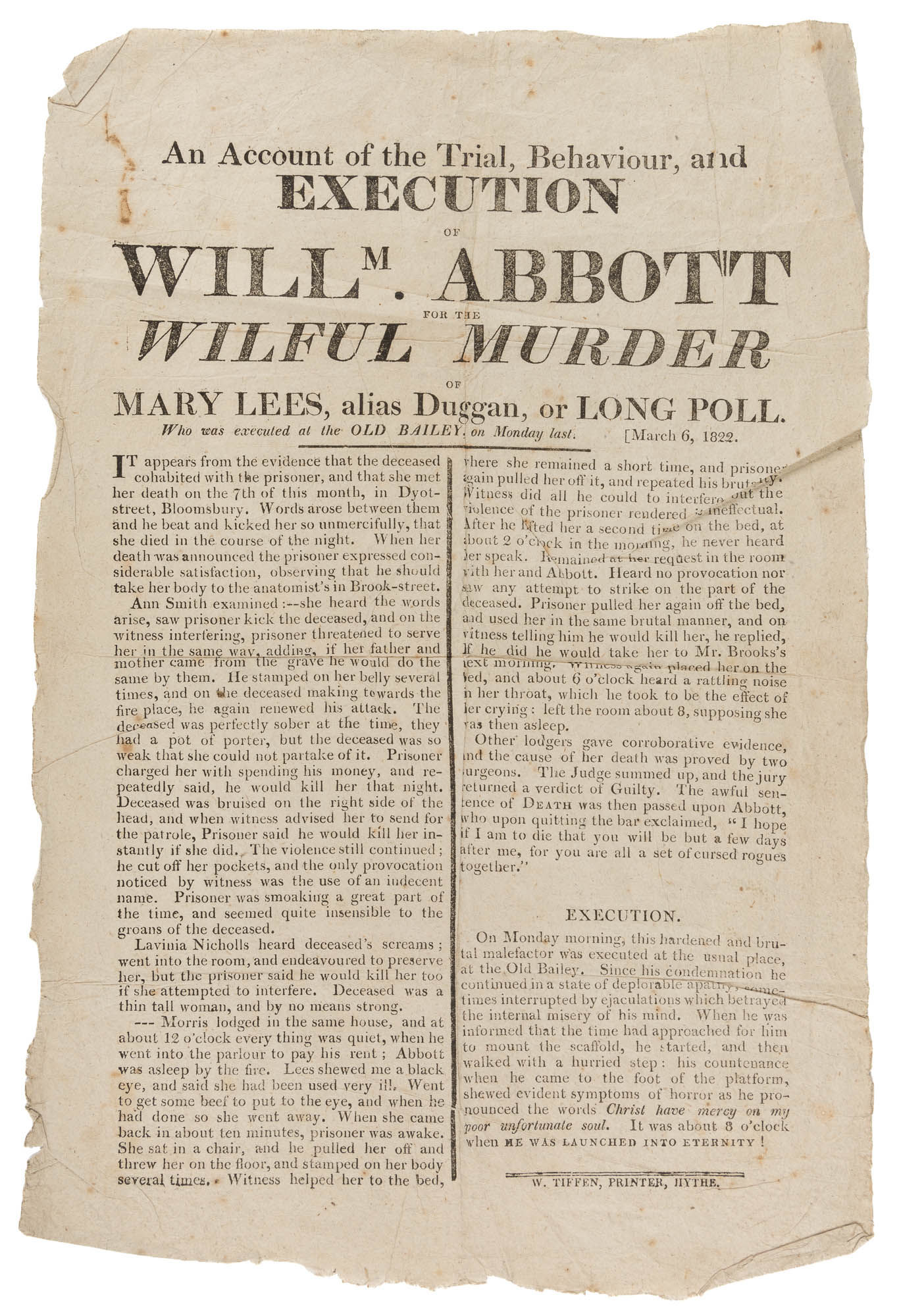1822. Unrecorded Account of a Notably Brutal 1822 London Murder [Broadside]. [Execution]. Abbott, William [d.1822]. An Account of the Trial, Behaviour, And Execution of Will.m Abbott for the Wilful Murder of Mary Lees, Alias Duggan, Or Long Poll. Who Was Executed at the Old Bailey, On Monday Last. [Hythe, Kent]: W. Tiffen, March 6, 1822. 14-1/2" x 9-1/2" broadside on thin paper, text in two columns below headline, columns and headline separated by rules, untrimmed edges. Light browning, faint spotting, a few minor folds and creases. $2,650. * Abbott and Lees were an unmarried couple who lived together in a boarding house in Bloomsbury, London. After "words arose between them" on February 7, 1822, due to a dispute over money, he beat her several times over the course of the evening. A "thin tall woman, and by no means strong," she was punched, kicked, thrown and, when prone, stomped. She died the next morning. Abbott was sober and, when confronted by other lodgers, expressed no remorse for his actions. He even quipped that he would sell her body to an anatomist. As fate would have it, Abbott was anatomized after his execution. Our broadside account by the important Kent printer William Tiffen [1785-1855] appears to be unrecorded. No copies listed on OCLC or Library Hub; no sale records listed on Rare Book Hub. For an account of this murder and its aftermath see The Annual Register, Or a View of the History, Politics, And Literature of the Year 1822 34-35.