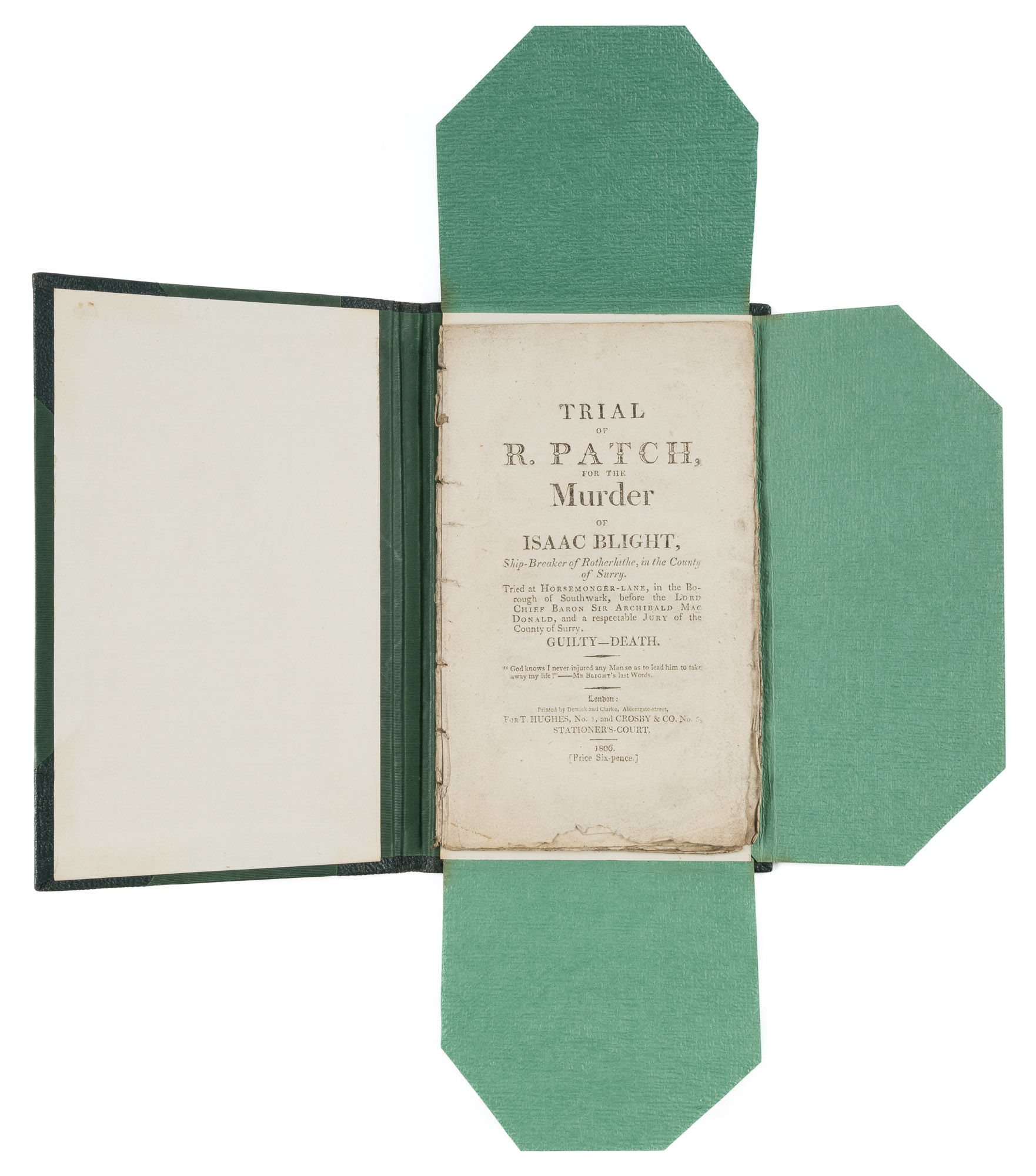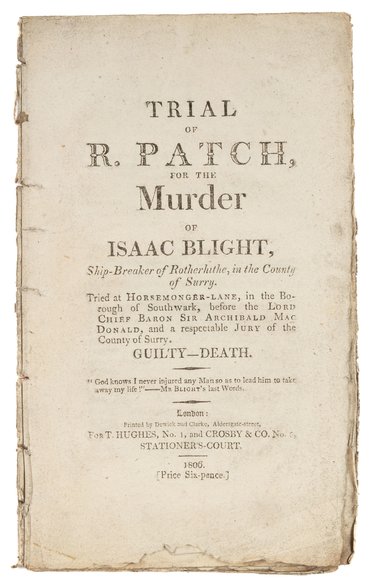 1806. Not a Soul We Believe Can Lament his Fate" [Trial]. Patch, Richard, Defendant [c.1770-1806]. Trial of R. Patch, For the Murder of Isaac Blight, Ship-Breaker of Rotherhithe, In the County of Surry. Tried at Horsemonger-Lane, In the Borough of Southwark, Before the Lord Chief Baron Sir Archibald Mac Donald, And a Respectable Jury of the County of Surry. Guilty-Death. London: Printed by Dewick and Clarke for T. Hughes and Crosby & Co., 1806. 34, [2] pp. With a final advertisement leaf. Octavo (7-1/4" x 4-1/2"). Disbound stab-stitched pamphlet, fore and bottom edges untrimmed. Light toning, occasional light soiling to edges. Housed in lightly rubbed 8" x 5" three-quarter morocco folder and plain slipcase. $350. * First edition. Patch, the eldest son of a smuggler, had been forced to mortgage his Exeter farm and subsequently fled to London in order to dodge his creditors. While there, he met Blight, a ship-breaker, who proposed that he become a partner in the business. Patch agreed, but lacked the money to pay for his share and killed Blight instead. Despite many attempts to conceal the crime, he was convicted on strong circumstantial evidence in 1806. A second edition of our account appeared later in 1806 with additional material and a frontispiece. It is unclear whether our first edition was issued with a frontispiece, though the copy at the Library of Congress has one. No records note the final advertisement leaf present in our copy. OCLC and Library Hub locate 3 copies of the first edition worldwide (Library of Congress, University of Leeds, Bishopsgate Institute).