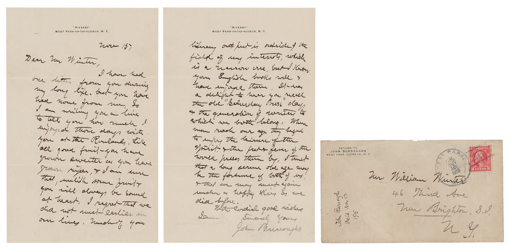West Park, NY, 15 November [1915]. Letter. Creases from mailing; slight fading of ink at the end. Near Fine. A two-page handwritten letter to drama critic and author William Winters on one side of two sheets of 5-1/2" x 8-1/4" "Riverby" stationery, SIGNED in full by Burroughs at the conclusion. In full: "I have had one letter from you during my long life, but you have had none from me. So I am writing you a line to tell you how much I enjoyed those days with you at the Rowlands. Like all good fruit-- you have grown sweeter as you have grown riper, & I am sure that, unlike some fruit-- you will always be sound at heart. I regret that we did not meet earlier in our lives. Much of your literary output is outside of the field of my interests, which is a narrow one, but I know your English books well & have enjoyed them. It was a delight to hear you recall the old 'Saturday Press' days & the generation of writers to which we both belong. When men reach our age they begin to enjoy the leisure of the spirit & the fret & fever of the world passes them by, I trust that a long serene old age may be the fortune of both of us, & that we may meet again under a happy skies as we did before." With the envelope addressed by Burroughs and annotated by Winters.