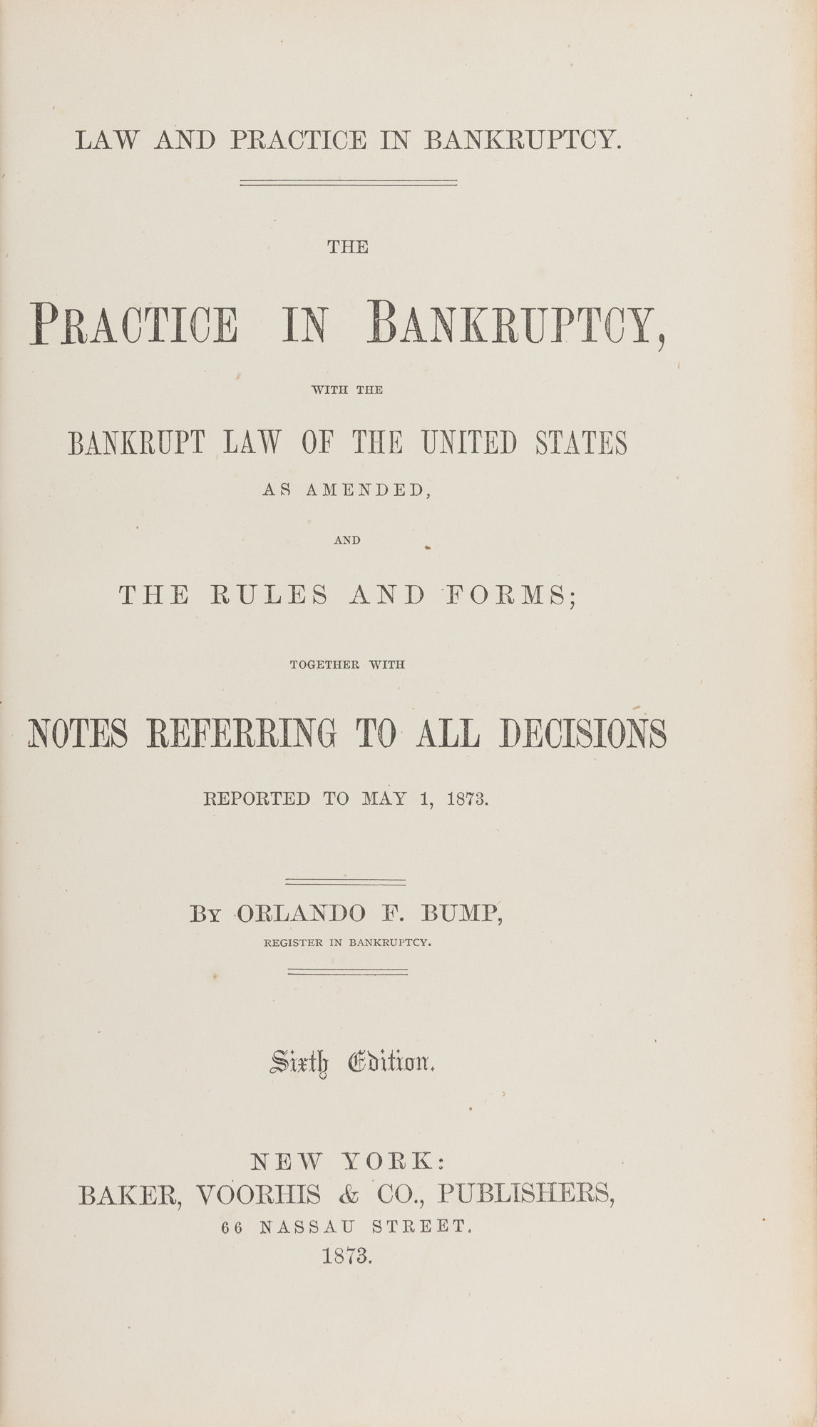 1873. New York: Baker, Voorhis, & Co., 1873. 6th ed.. New York: Baker, Voorhis, & Co., 1873. 6th ed. A Standard Treatise on Bankruptcy During the Gilded Age Bump, Orlando [1841-1884]. Law and Practice in Bankruptcy: With the Bankrupt Law of the United States as Amended, And the Rules and Forms; Together with Notes Referring to All Decisions Reported to May 1, 1873. New York: Baker, Voorhis, & Co., 1873. xxiv, 782 pp. Octavo (9" x 6"). Later cloth, lettering piece to spine, endpapers renewed. Moderate toning to interior, light soiling and inkspots to a few leaves. $250. * Sixth edition. First published in 1868, this was a standard treatise during America's the Gilded Age. It's final edition, by Eugene Williams, was published in 1898-1899. Catalogue of the Library of the Harvard Law School (1909) I:270.
