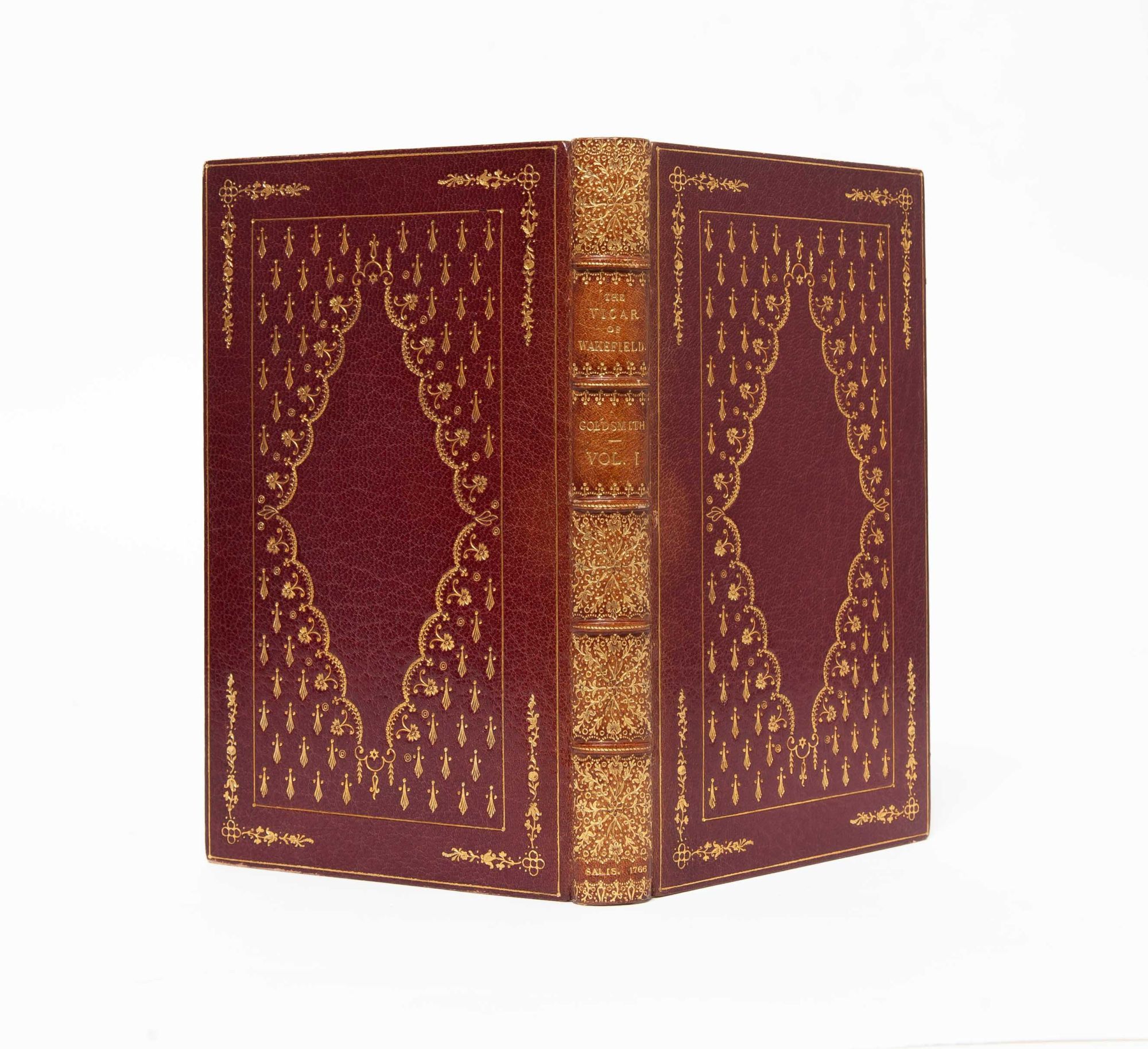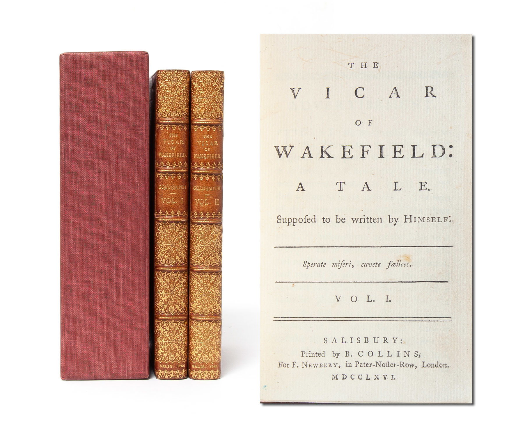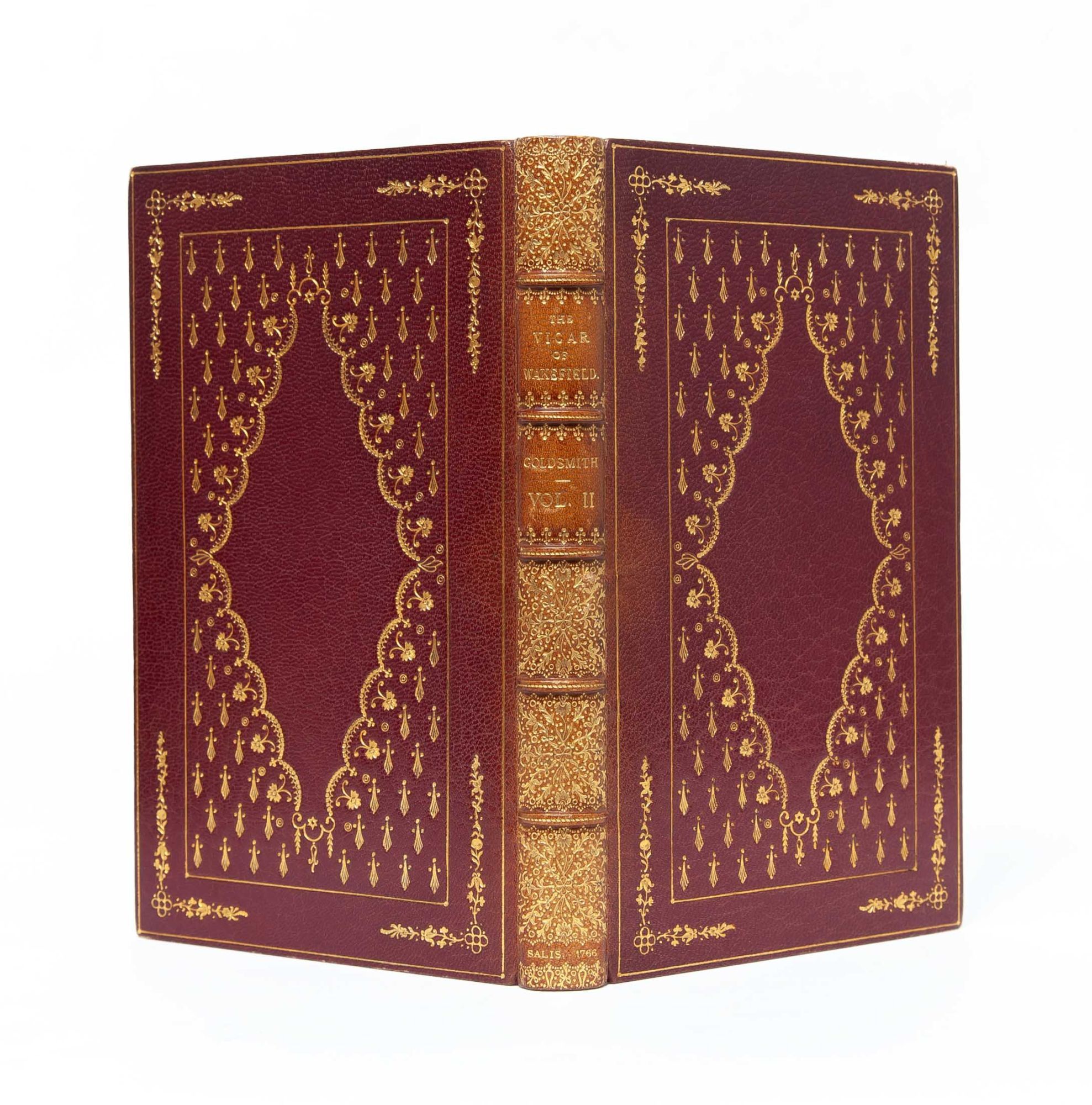 Salisbury: Printed by B. Collins for F. Newbery, 1766. First edition. Finely bound by Riviere & Son in full crushed morocco ornately stamped in gilt to spine and boards. All edges gilt. Inner dentelles gilt. Blue coated endpapers. Measuring 155 x 90mm and collating complete: [2], 214; [2], 223, [1, blank]. A first edition plagued by misprints and errors, there are four variants identified with no priority; the present is Temple Scott's variant B, with no catchword on page 213 of volume I, the correct catchword "him" on volume II page 39 and the correct page number on volume II page 159. A lovely copy outside and in, with just light sunning to spines; bookplates to early leaves, else fresh and with no signs of use. Housed in a custom cloth slipcase.