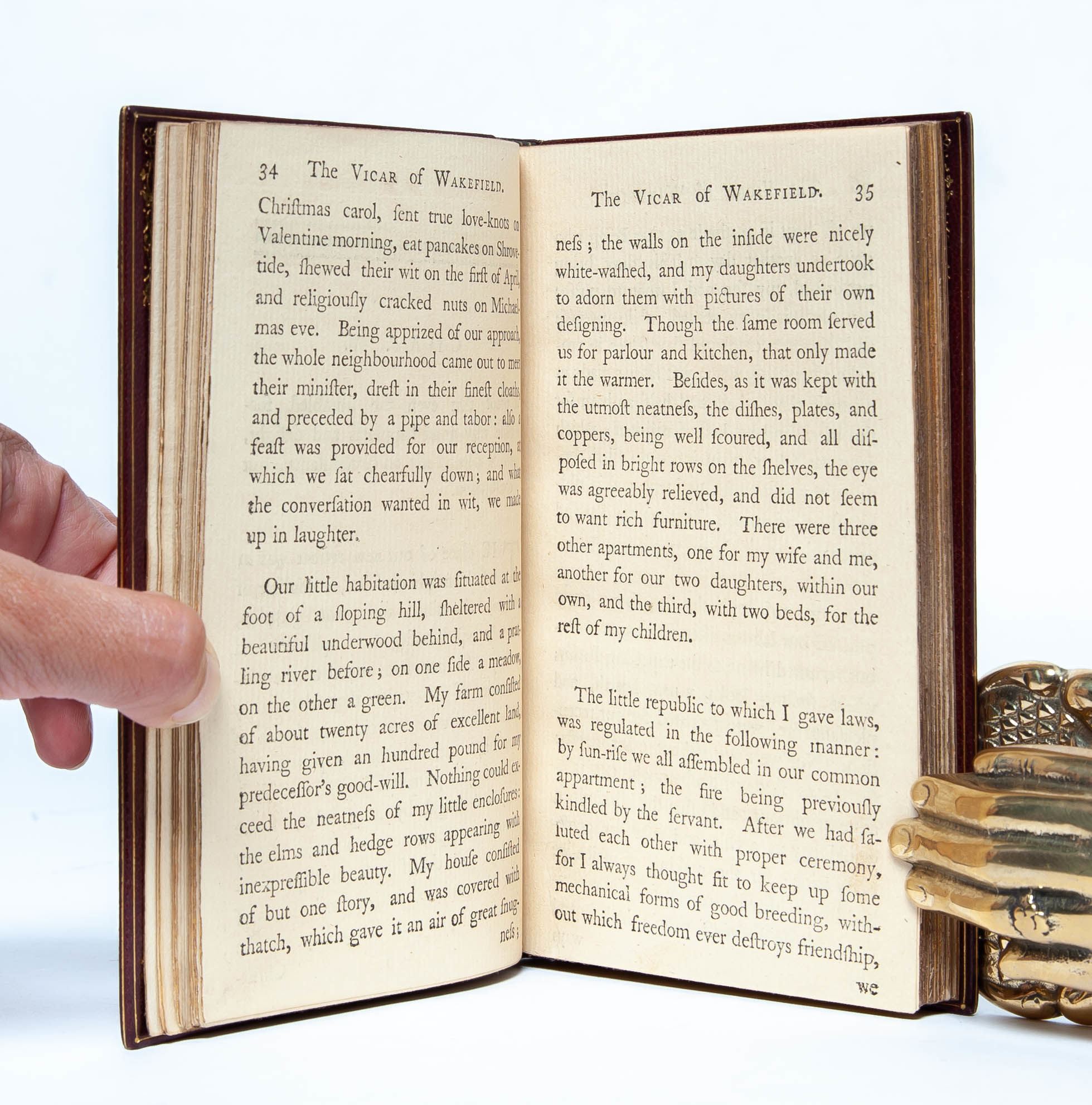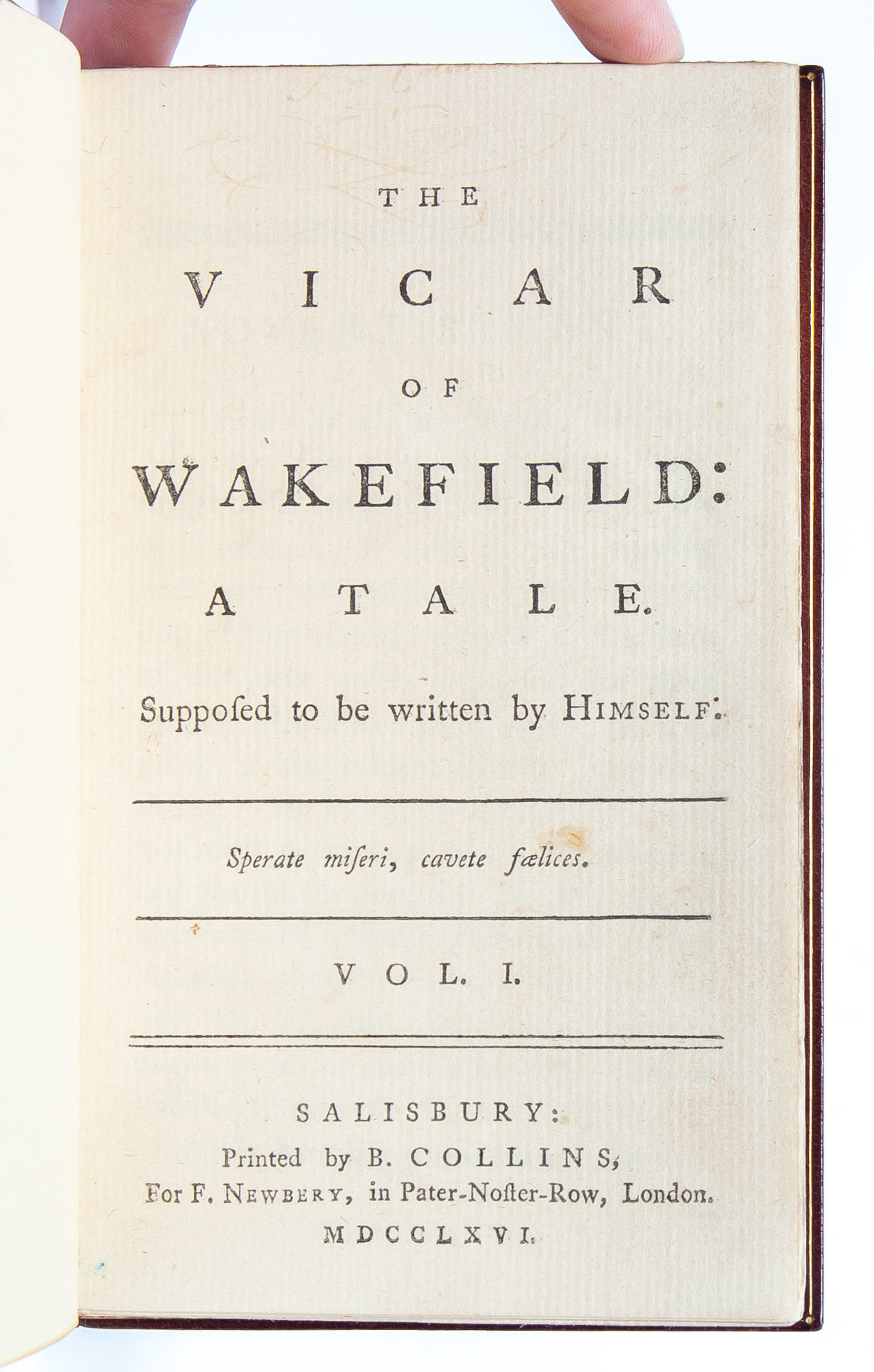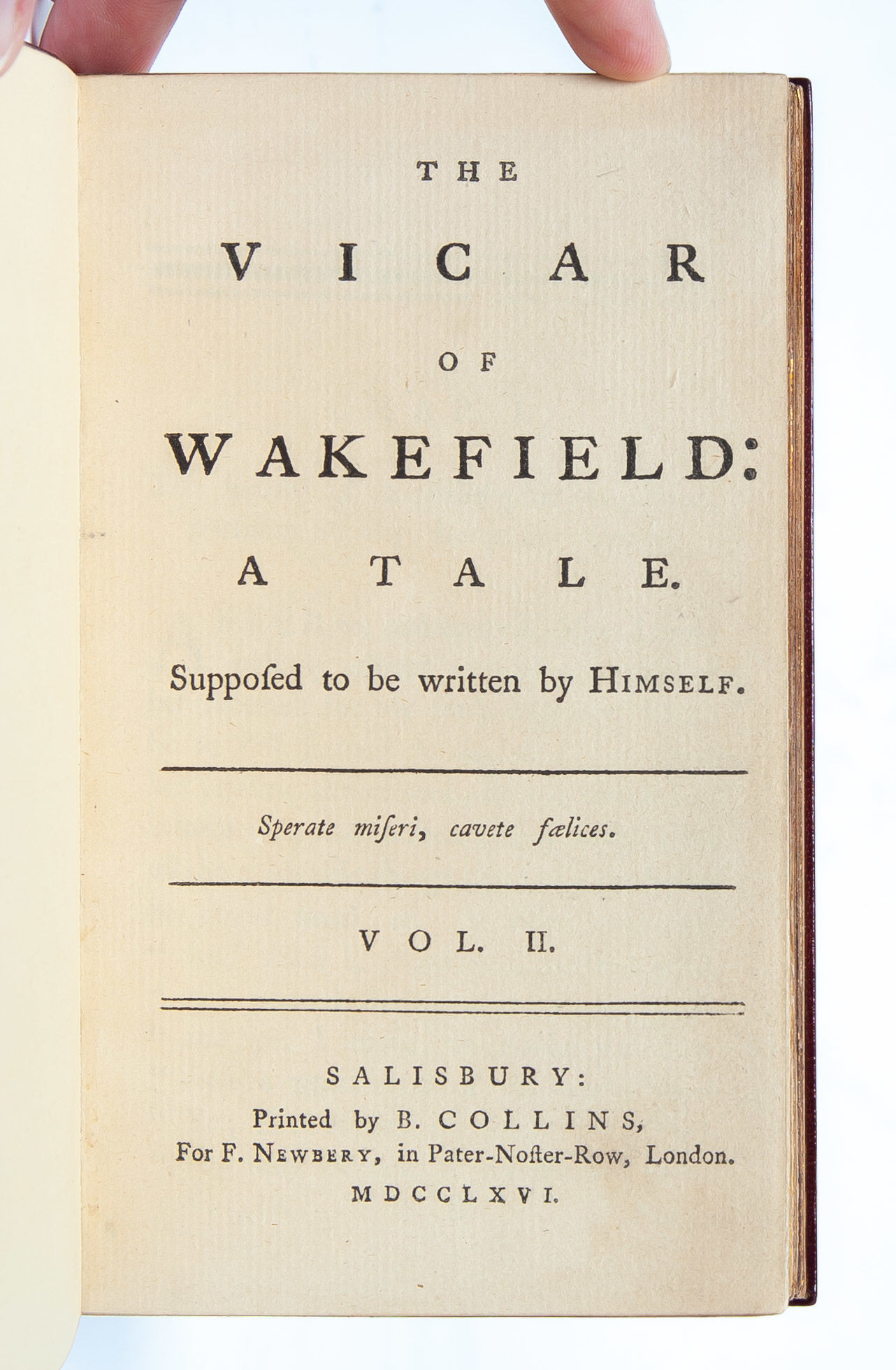 Salisbury: Printed by B. Collins for F. Newbery, 1766. First edition. Finely bound by Riviere & Son in full crushed morocco ornately stamped in gilt to spine and boards. All edges gilt. Inner dentelles gilt. Blue coated endpapers. Measuring 155 x 90mm and collating complete: [2], 214; [2], 223, [1, blank]. A first edition plagued by misprints and errors, there are four variants identified with no priority; the present is Temple Scott's variant B, with no catchword on page 213 of volume I, the correct catchword "him" on volume II page 39 and the correct page number on volume II page 159. A lovely copy outside and in, with just light sunning to spines; bookplates to early leaves, else fresh and with no signs of use. Housed in a custom cloth slipcase.