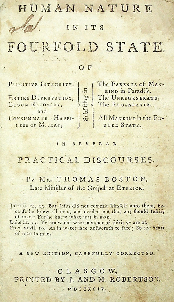 The best-known and most influential work by the Scottish Presbyterian pastor and theologian Thomas Boston (1676-1732). A classic work of Puritan exegesis, The Fourfold State (first published in 1720) focuses on the primacy of sin and the necessity of being "born again;" according to DNB it was "the most frequently reprinted Scottish book of the eighteenth century," being reprinted more than 50 times before 1800. The current edition, though late, is uncommon; OCLC notes just four locations, of which only two in North America. ESTC T74877.