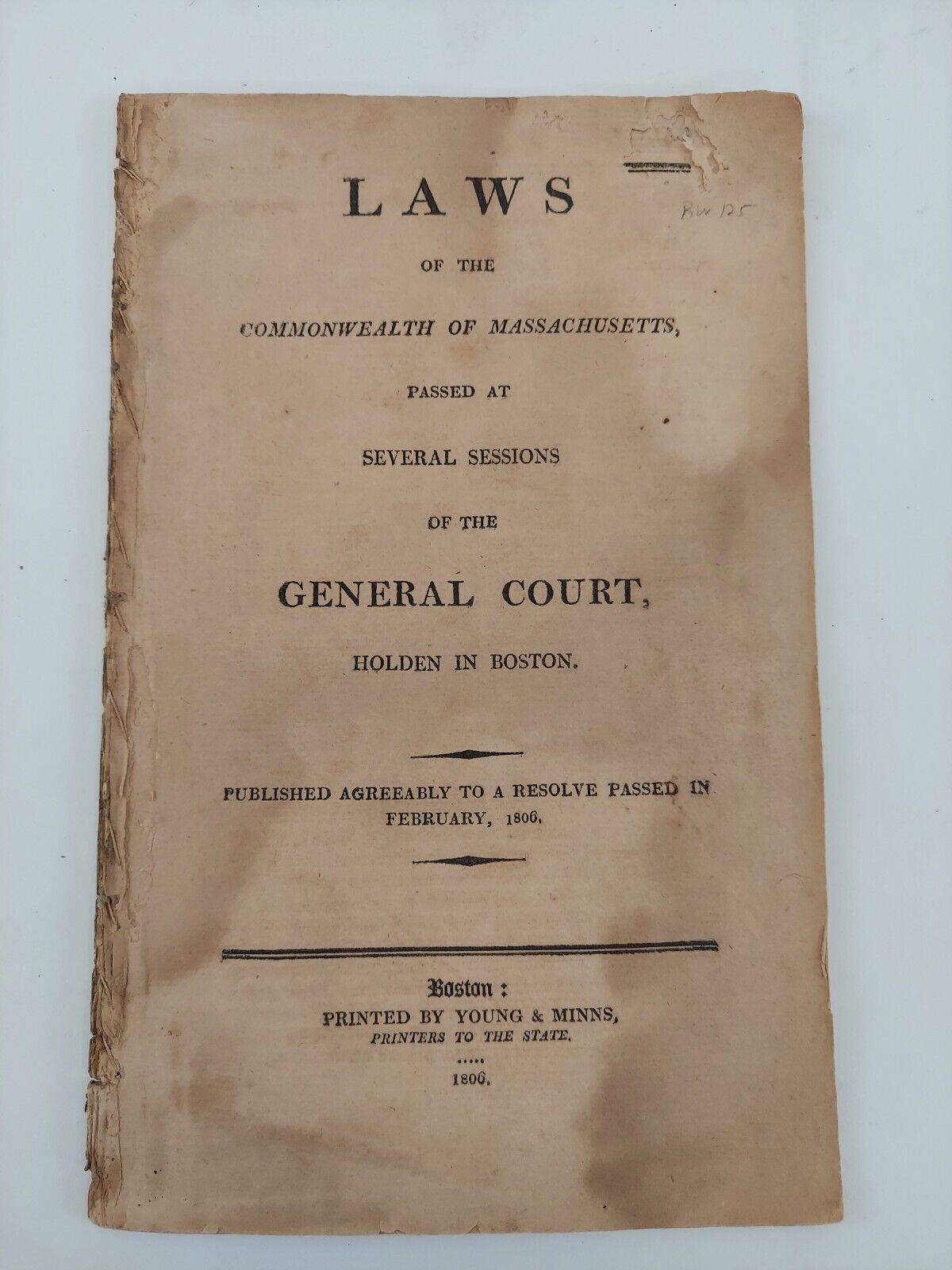 Boston: Young & Minns, 1806. Other. Disbound Pamphlet; G; open tear along head edge of front cover (possibly moth eaten), age toning, foxing to pages, bending and chipping along edges. 1357447. Special Collections.