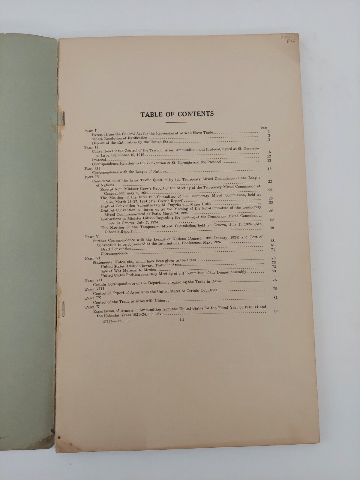 Department of State, Division of Information, 1925. Quarto; 84 pages; G; top corner of front cover missing, chipping along edges and to bottom of spine, minor age toning, ink stamp on front cover, toning to covers; RW; Shelved Room A. 1357458. Special Collections.