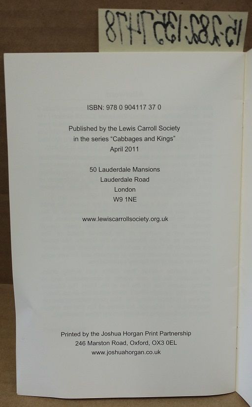 London: The Lewis Carroll Society, 2011. Softcover. Booklet [5x7.5 inches]; VG-/ivory colored paperback; from the series "Cabbages and Kings", April 2011 by the Lewis Carroll Society; scarce; very thin; covers show light handling wear; double bordered horizontal rectangle to front; no titles to exterior; textblock clean; minor crinkle toward lower fore edge; unpaginated, but twelve counted pages