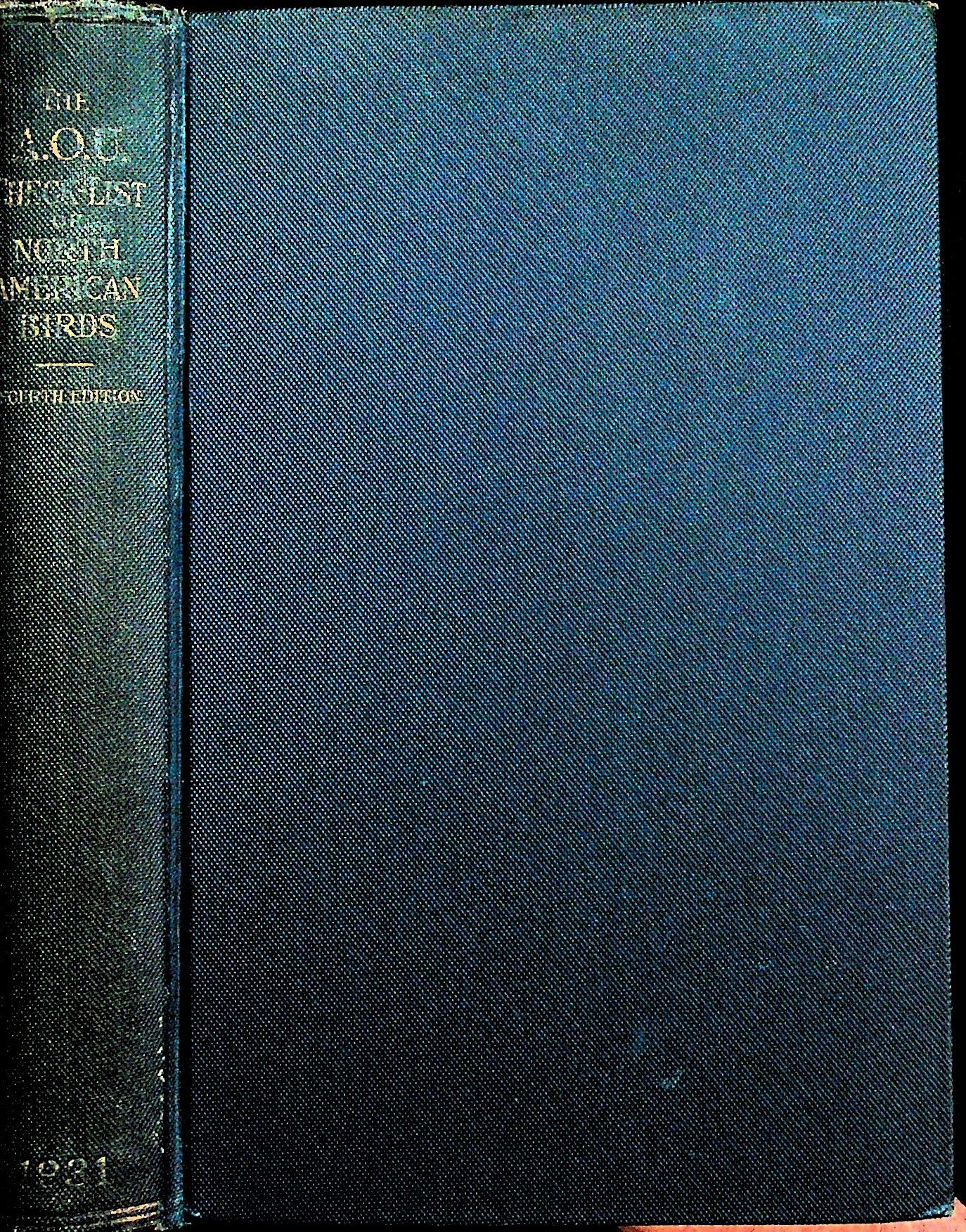 Lancaster, PA: American Ornithologist's Union, 1931. Hardcover. Very Good. Hardcover. Fourth Edition. The American Ornithologist's Union (AOU) was founded in 1883. At its first Congress in September 1883, it resolved to appoint a committee to study the question of a Revision of the Classification and Nomenclature of the Birds of North America. The committee submitted its report in 1885, and it was approved for publication. The first edition was published in 1886. There were six subsequent editions. This 4th edition was published in 1931, with the 7th and final edition being published in 1998. In 2016, the AOU merged with the Cooper Ornithological Union to form the American Ornithological Society, which publishes a successor, the AOS Checklist of North American Birds, which is updated annually online.