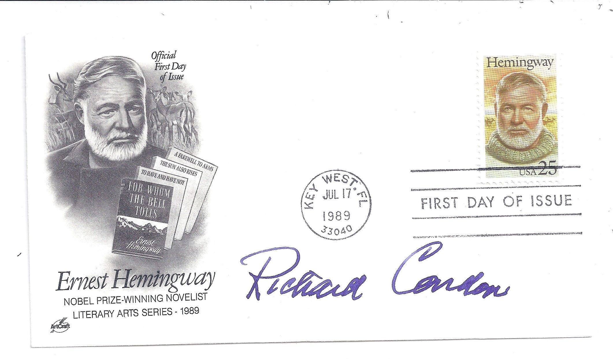 Key West, 17 July 1989. Document. Fine. Attractive First Day Cover with an image and stamp of Hemingway postmarked in Key West SIGNED by the American political novelist, author of THE MANCHURIAN CANDIDATE and many other novels.