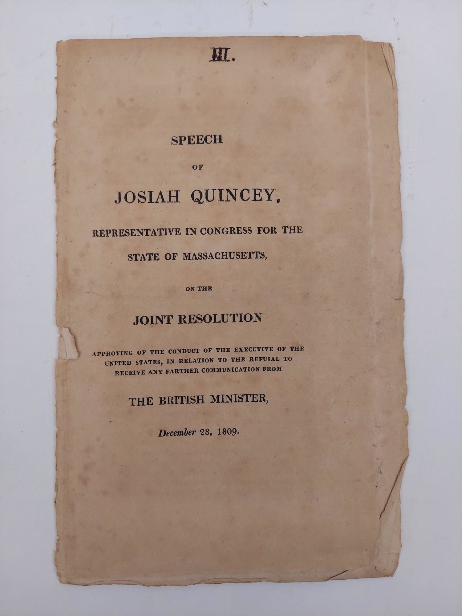 SPEECH OF JOSIAH QUINCEY, REPRESENTATIVE IN CONGRESS FOR THE STATE OF MASSACHUSETTS, ON THE JOINT RESOLUTION APPROVING OF THE CONDUCT OF THE EXECUTIVE OF THE UNITED STATES, IN RELATION TO THE REFUSAL TO RECEIVVE ANY FARTHER COMMUNICATION FROM THE BRITISH PRIME MINISTER, DECEMBER 28, 1809