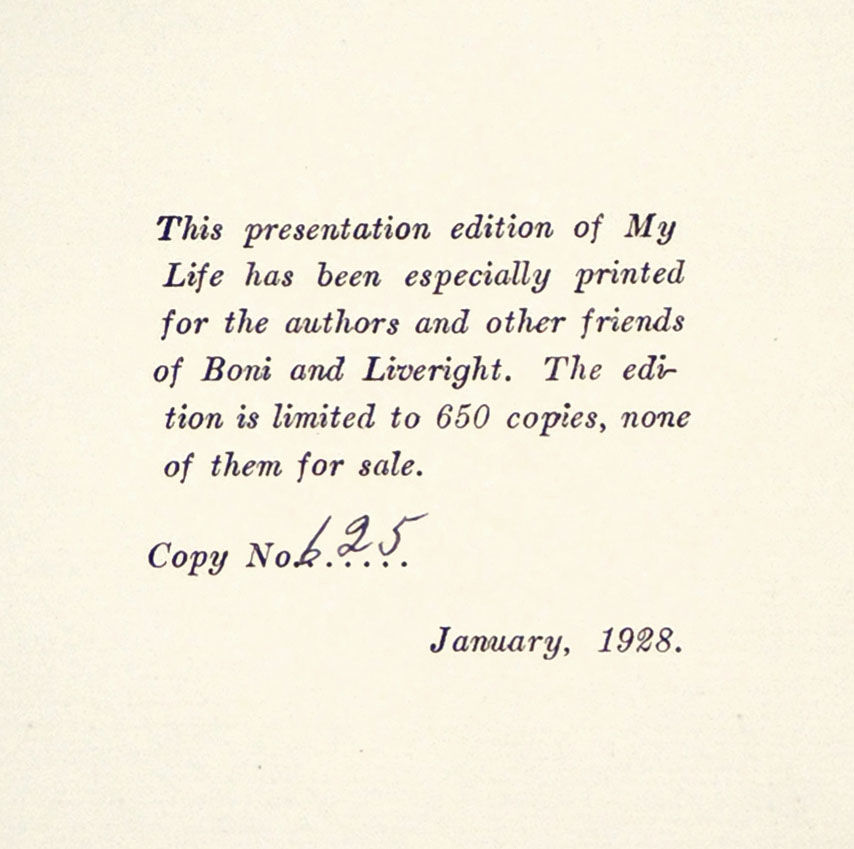 New York: Boni and Liveright, 1927. Hardcover. Very Good. Hardcover. Limited Edition. Number 625 of 650 copies. Facsimile signature of Duncan on front free endpaper. This book was published posthumously on the basis of Duncan’s handwritten text and illustrated with 24 black and white photographs of her (two by Arnold Genthe). As one of the great free spirits of the early 20th century, Duncan’s account of her life was as uninhibited as her career. This is one of the “presentation copies” published as a limited edition for authors and other friends of Boni and Liveright. In black cloth boards with red leather label titled in gilt on spine. Light rubbing to boards, wear to spine ends, and chips and tears to title label. Cracked hinges although text block is still tight. Clean interior. Very good. 359 pages. DRA/081022.