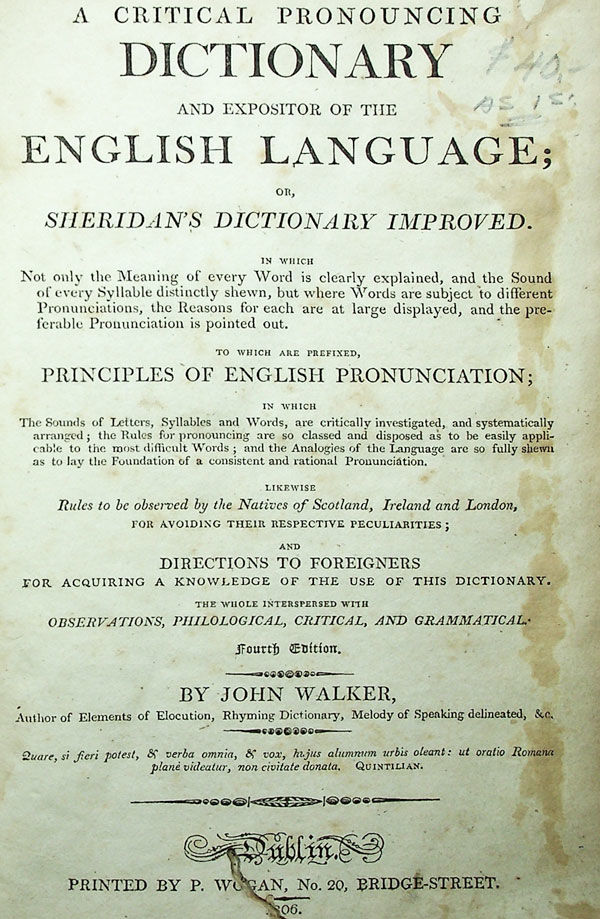 Second Dublin edition of "one of the most popular and influential dictionaries ever published" (Landau, Dictionaries: The Art & Craft of Lexicography, 57). This is the fourth revision of the text, which was first printed in London in 1791 and "went through countless editions," with "an incalculably great effect on the treatment of pronunciation" (57). Walker was a prescriptivist, preferring pronunciations based on spelling and etymology over some in contemporary use; and "[f]or the millions of linguistically insecure immigrants pouring into the United States in the early nineteenth century and for the legions of upwardly mobile middle-class people, Walker's advice was a much appreciated help" (58). "[M]any pronunciations still taught as correct in our schools can be tracted to Walker's dictionary" (57). See VANCIL, Catalog of Dictionaries, p.248.