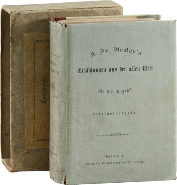 German collection of folktales, with the original 1878 dust jacket and protective box, in an unusual state of preservation. A printed note on the box with the title also states "Ohne diese enveloppe wird kein exemplar zurückgenommen!"--i.e., "No copy will be taken back without this envelope!" In fact, the Buchhandlung des Waisenhauses (Orphanage Bookshop) is still in operation and is one of the oldest bookstores in Germany, having been established in 1698.