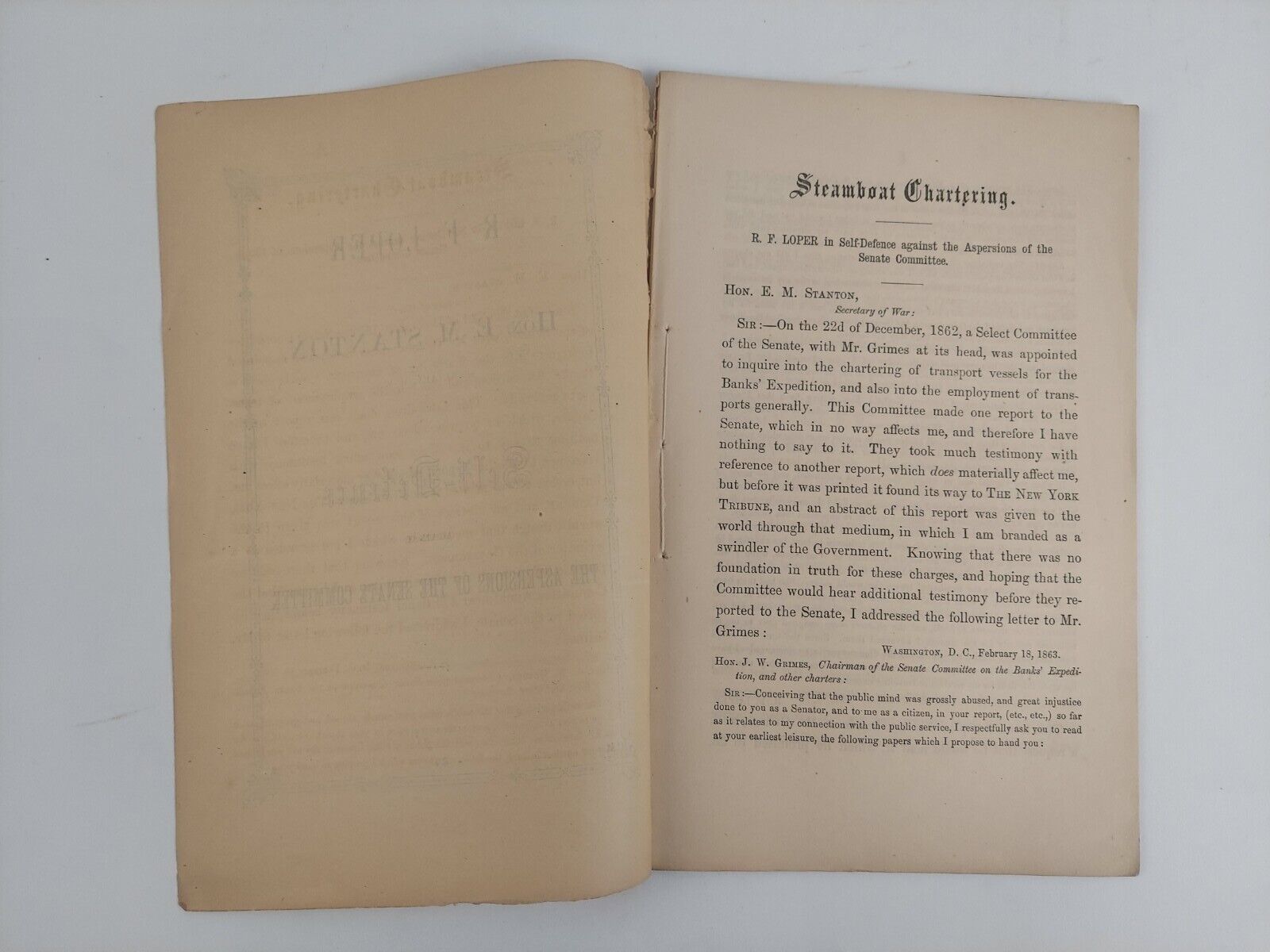 R. F. Loper to Hon. E. M. Stanton, Secretary of War, in Self-Defence Against the Aspersions of the Senate Committee