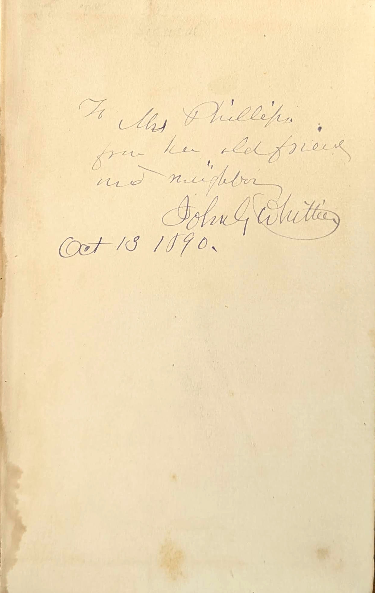Boston: Houghton Mifflin Company, 1890. Very Good. Boston: Houghton Mifflin Company, 1890. First Edition (1546 copies printed per publisher's records). Signed by the author on front free endpaper with inscription "To Mrs. Phillips, from her old friend and neighbor, John G. Whittier. Oct 13 1890." 16mo (6.75" x 4.25"); 208pp +1 ads. Gray and white cloth with black and gilt lettering. Gilt top edge. Housed in custom black slipcase. Boards are edgeworn and rubbed at corners and spine ends, with some inward bowing to both at fore-edge and a few scuffs and general smudging / soiling to surface and more heavily down spine. Endpapers toned, with a small patch of water- or glue-staining along bottom gutter of front free endpaper. Opens easily between a few gatherings, but binding is sound. Pages unmarked.