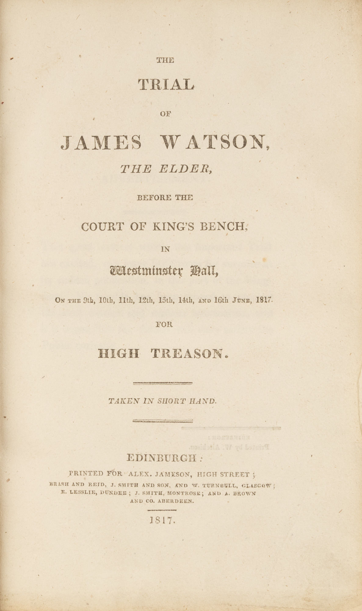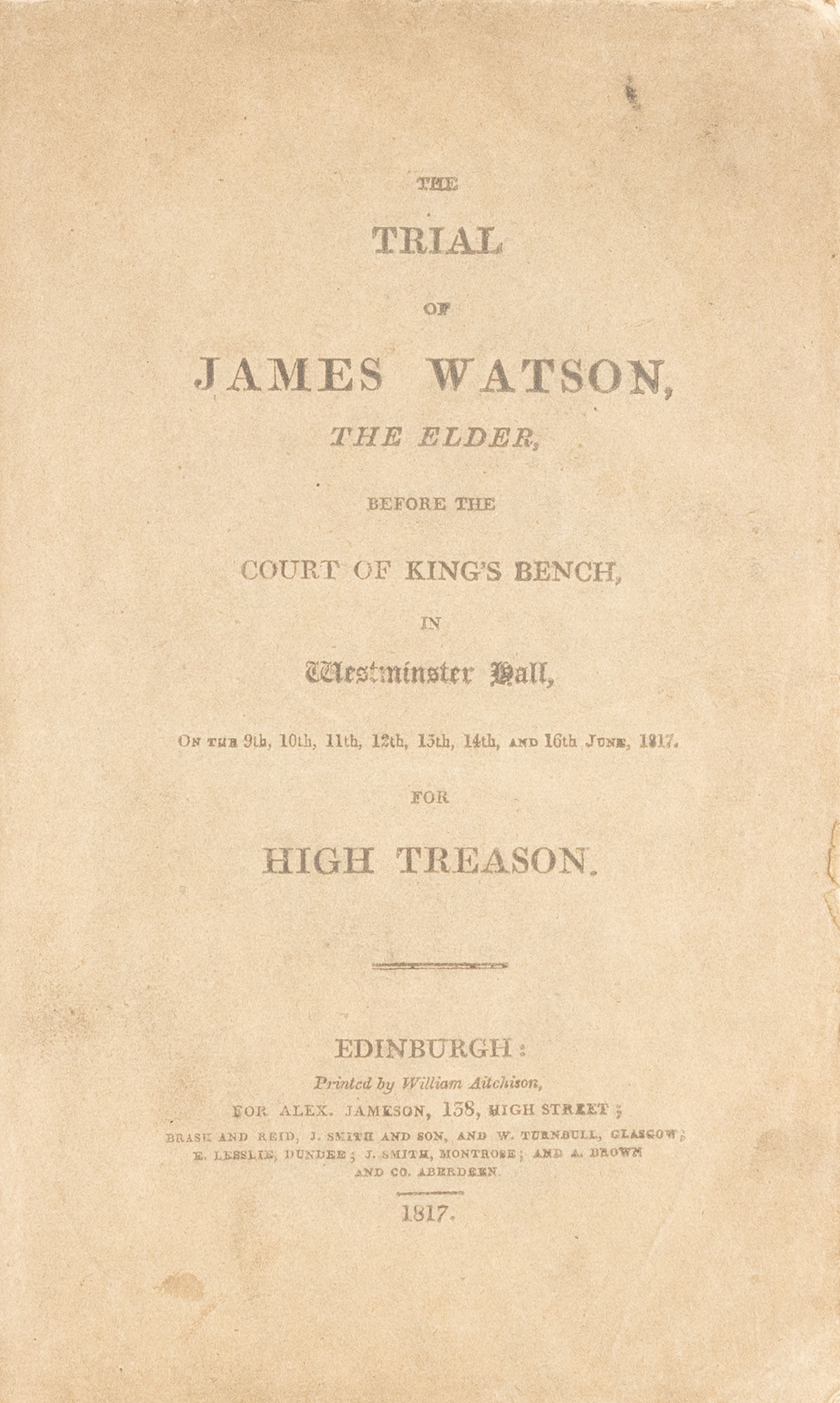 1817. Edinburgh, 1817. Edinburgh, 1817. Trial of a Leader of an 1816 Plot to Overthrow the British Government [Trial]. Watson, James [1766?-1838], Defendant. The Trial of James Watson, The Elder, Before the Court of King's Bench, In Westminster Hall, On the 9th, 10th, 11th, 12th, 13th, 14th, And 16th June, 1817. For High Treason. Taken in Short Hand. Edinburgh: Printed for Alex. Jameson [et al.], 1817. [vi], 250 pp. Octavo (8-3/4" x 5-1/2"). Printed wrappers, edges untrimmed, bound in later patterned cloth, gilt-stamped title and date to spine. Light rubbing to boards and extremities, spine ends and corners bumped and lightly worn, front hinge starting, rear hinge cracked. Light toning to interior, very light foxing to a few leaves, light soiling to wrappers, ownership signature (of William Macmath) dated April 29, 1868 to inside of front wrapper. $150. * Only edition. Watson was tried for his role in the Spa Fields riot. This riot followed a pair of meetings held by revolutionaries at Spa Fields, Islington, England on November 15 and December 2, 1816. Opponents of the government, they resolved to encourage rioting and then seize control of the government by capturing the Tower of London and the Bank of England. Watson, Arthur Thistlewood and three other leaders were arrested and charged with high treason as a result. Watson was acquitted and the other three were released without trial. Thistlewood would go on to lead the failed Cato Street Conspiracy in 1820. OCLC locates 7 copies of this title in North American law libraries (Yale, Columbia, University of Minnesota, University of Missouri, LA County, Library of Congress, Social Law).