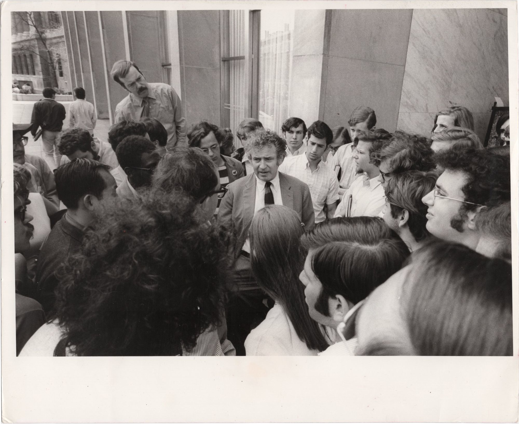 Original photograph of Norman Mailer talking with Columbia University students, 1969