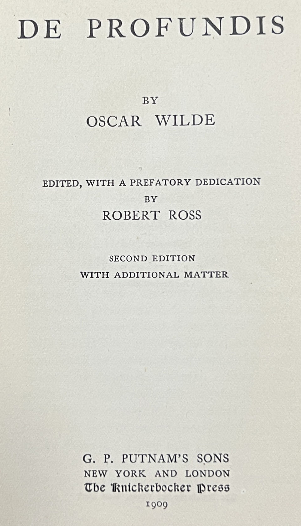 New York: G.P. Putnam's Sons, 1909. Second Edition. Hardcover. Good. With additional Matter. Edited and with a Prefatory Dedication by Robert Ross. About Very Good, lacking the jacket. Quarter blue buckram with light blue-grey paper on the boards and spine edge, generally rubbed and toned. Square and firmly bound with a gilt top edge, foxed at the endpapers and with the former owner's signature on the front endpaper, clean otherwise. The first American edition to appear with additional material of Wilde's letter to Alfred Lord Douglas written during Wilde's imprisonment.